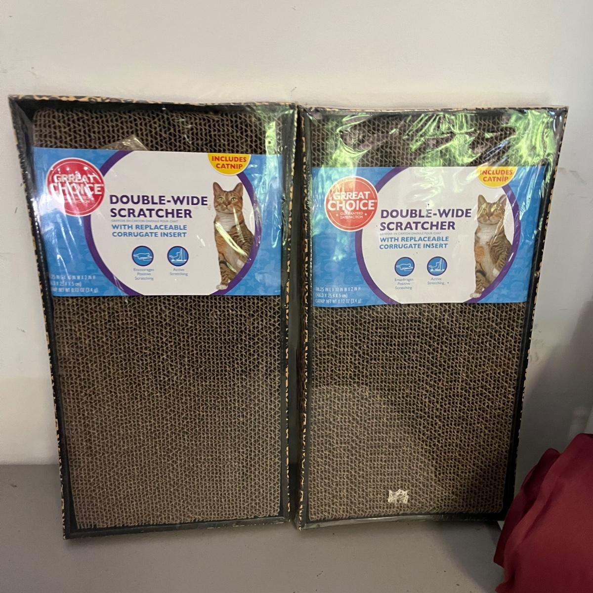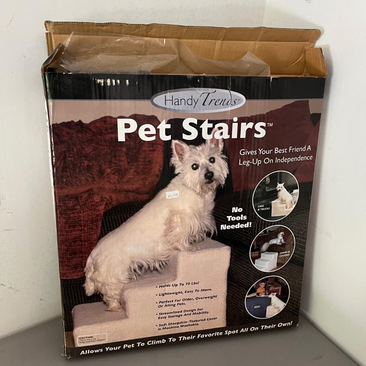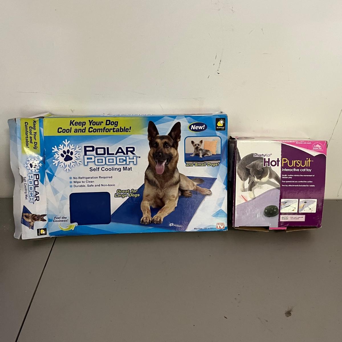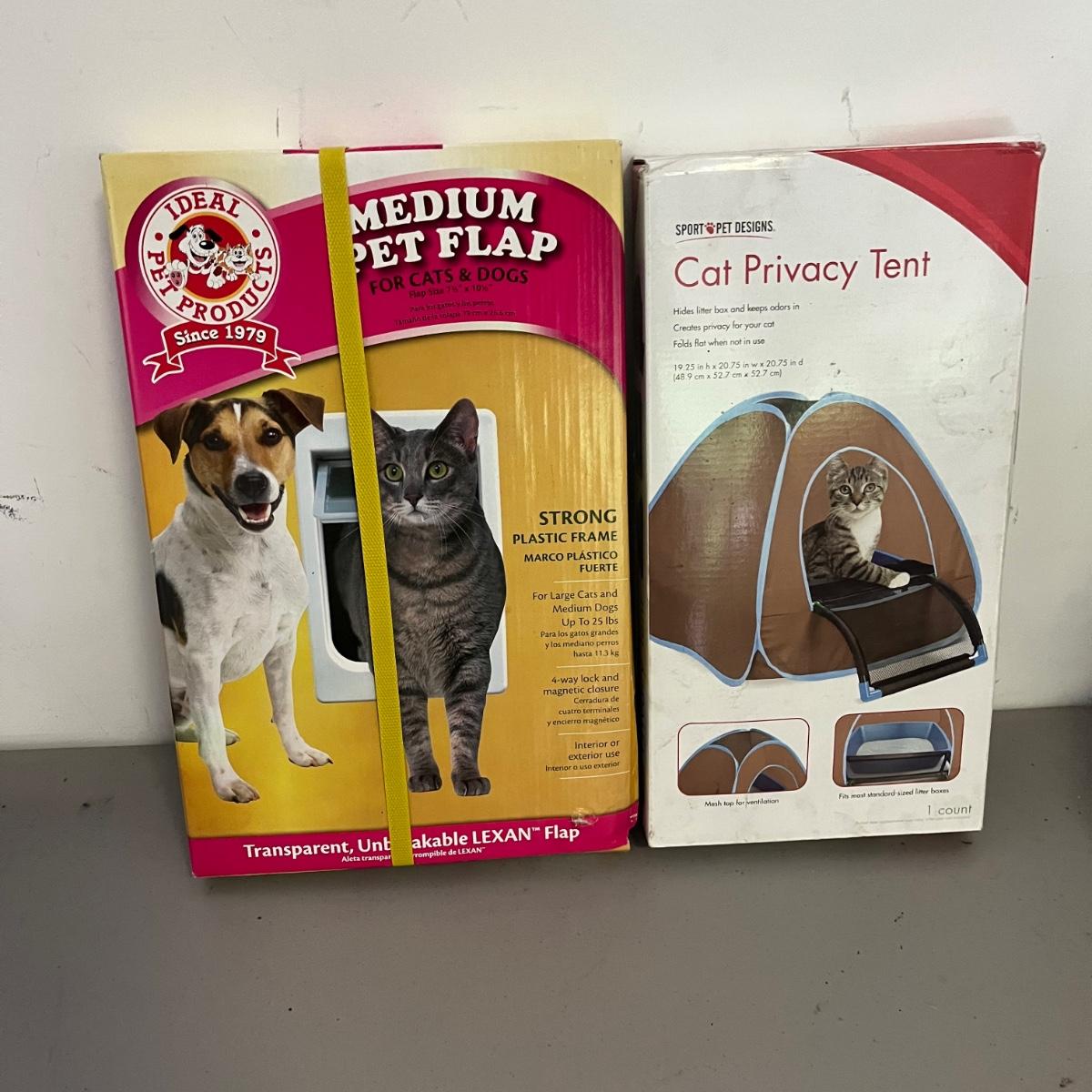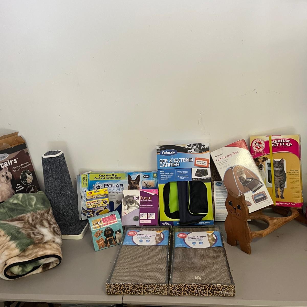 Plenty of new in box items in this lot that includes pet stairs, Hot Pursuit cat toy, Polar Pooch cooling mat, cat blanket, medium pet flap, cat privacy tent, double wide cat scratchers, animal carriers and more.