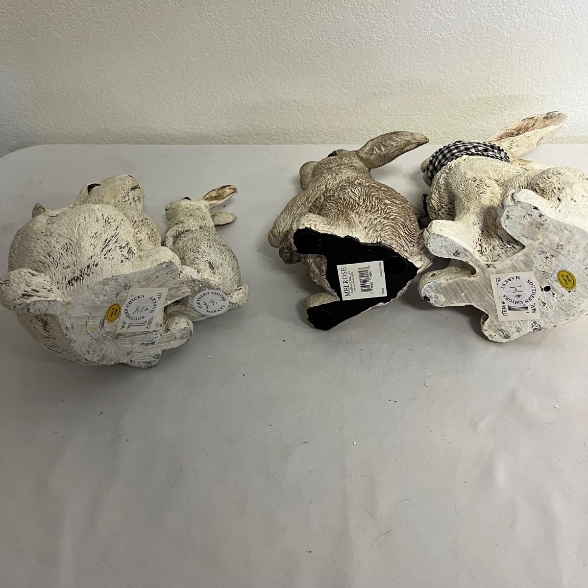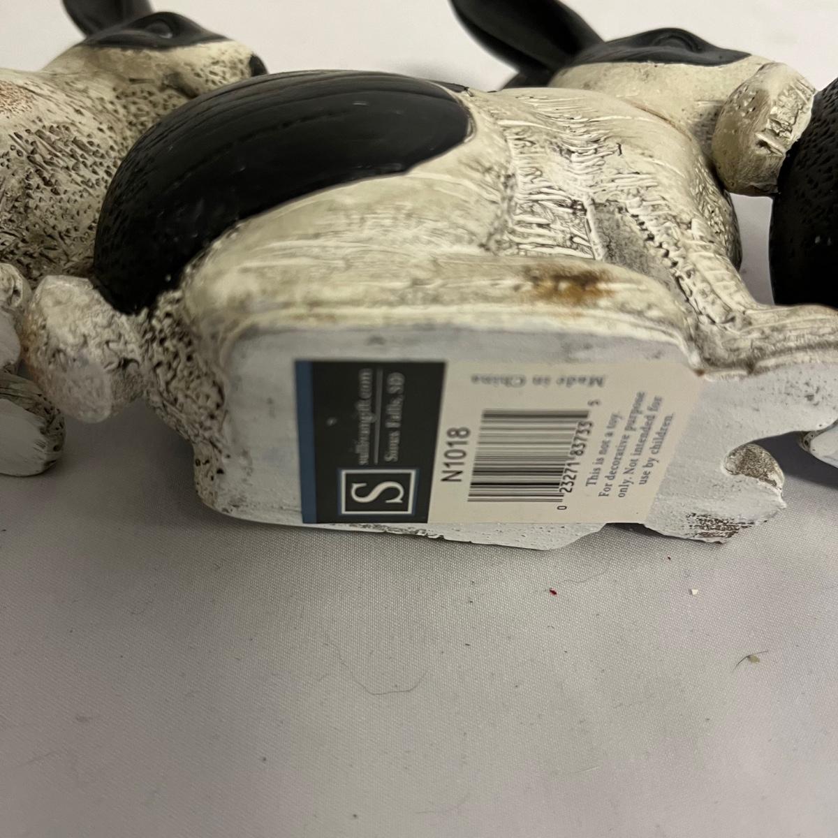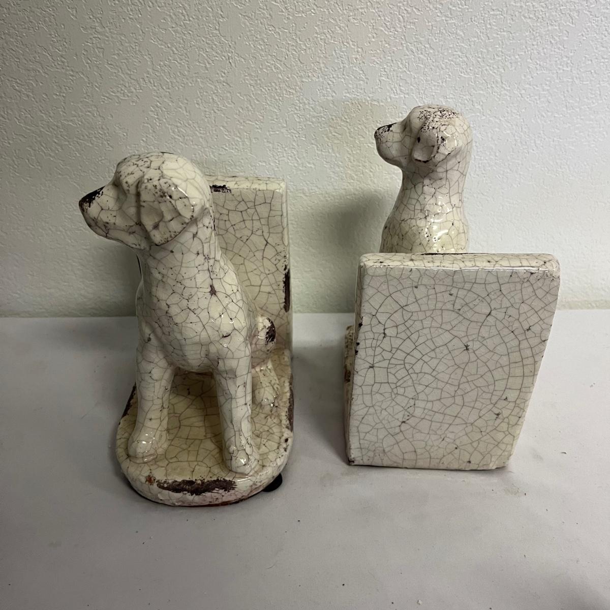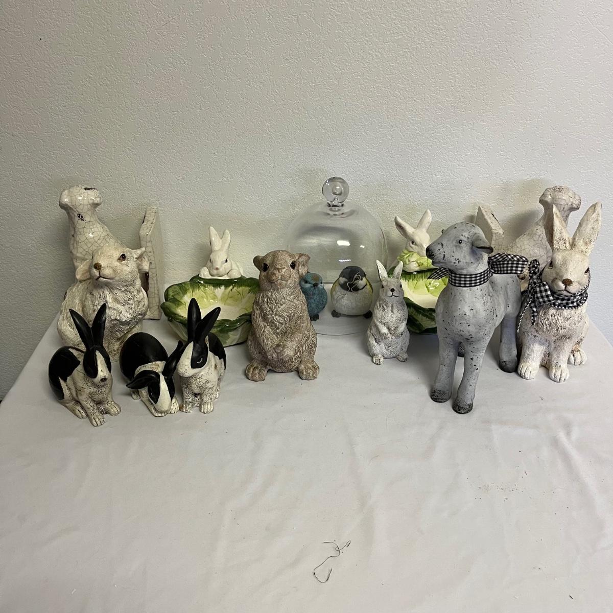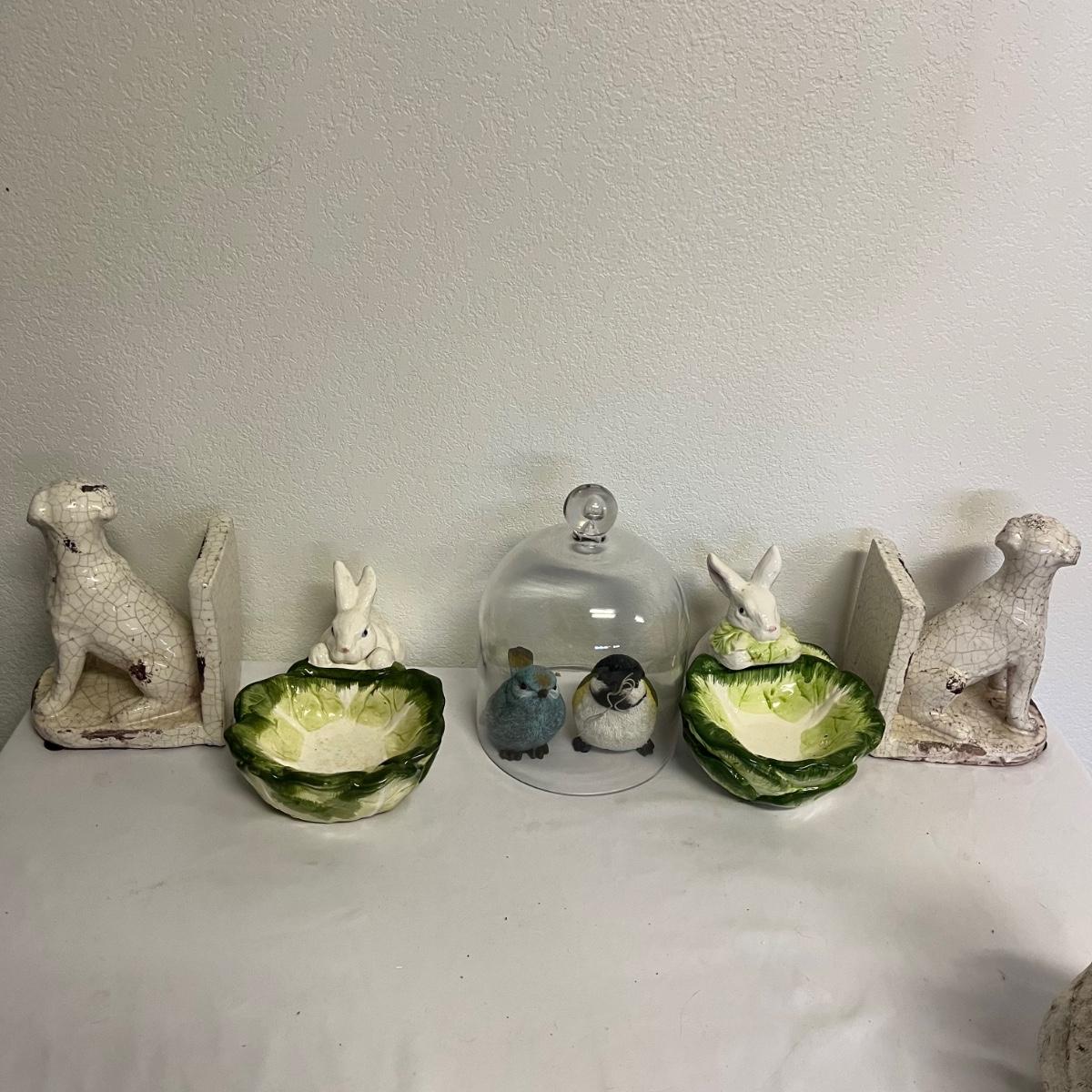 Lot includes pair of terra cotta dog bookends, two ceramic rabbits on bowls, seven resin rabbis, two resin birds, glass dome and a ceramic lamb that measures 3” x 7.25” x 9.25”.