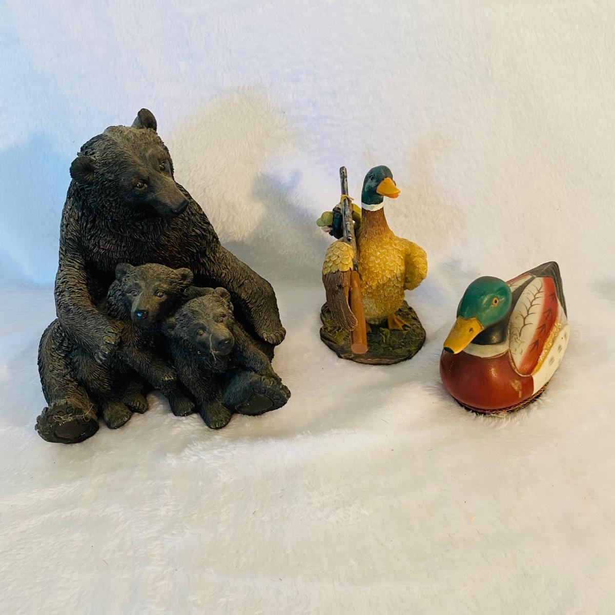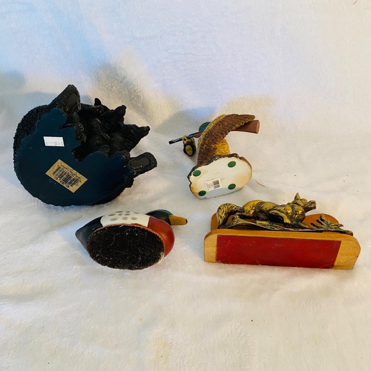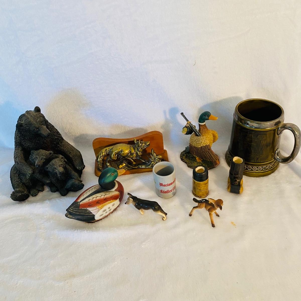 Various animal figurines. Some wood and others ceramic. Ceramic 9”D serving dish. Ceramic mug is 7”H made by Princess House. Small coyotes front legs are broken.
