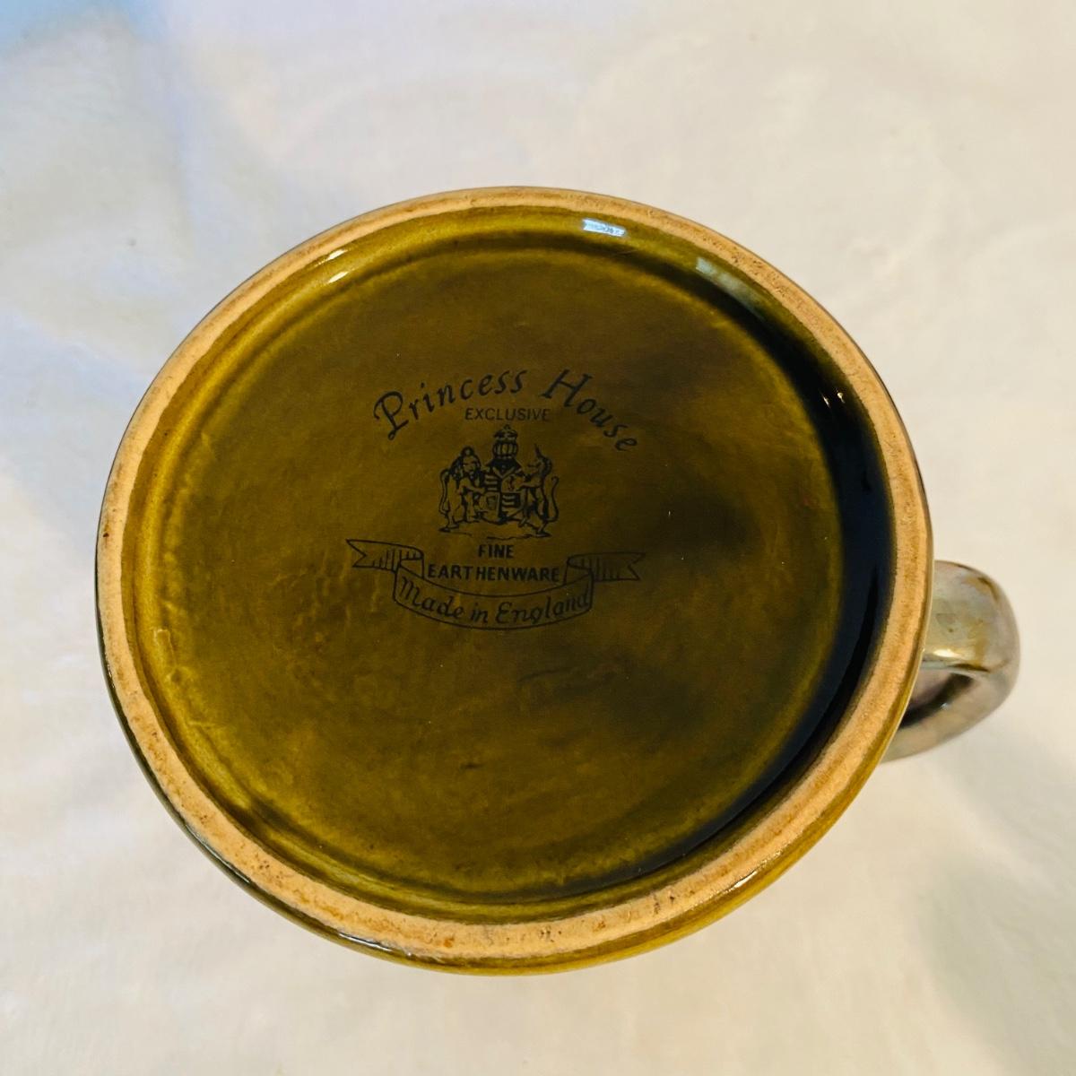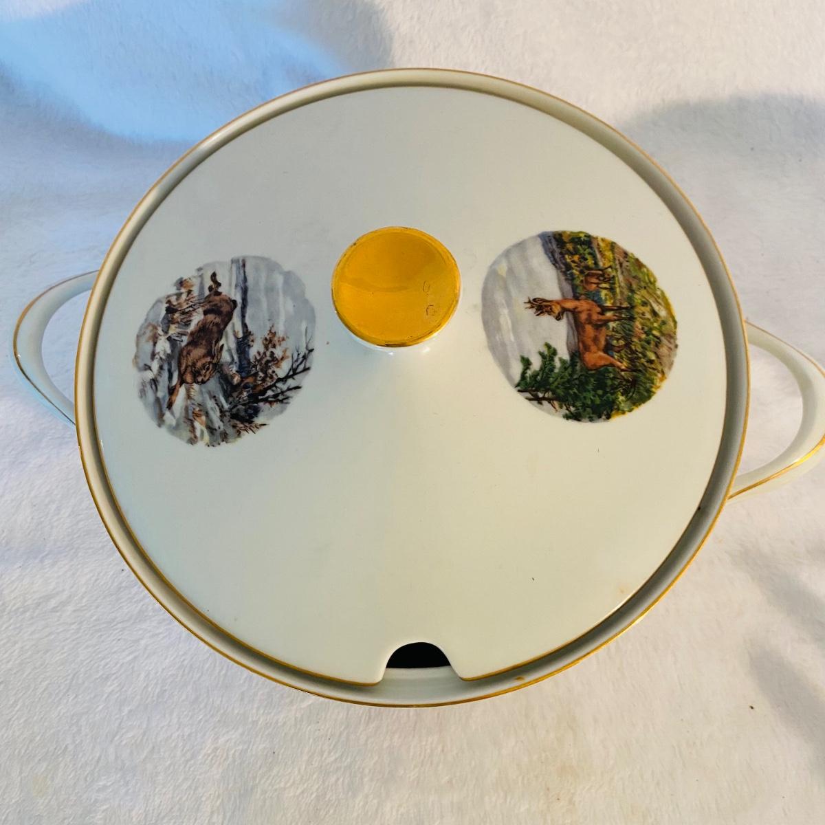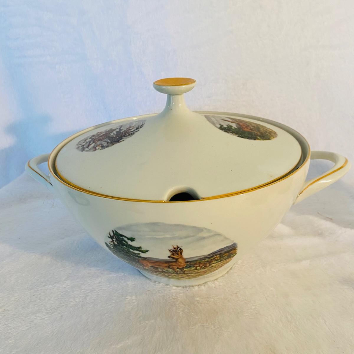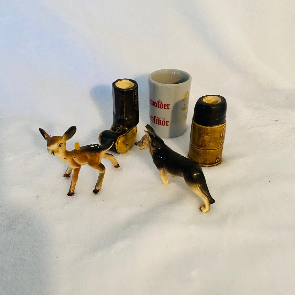 Various animal figurines. Some wood and others ceramic. Ceramic 9”D serving dish. Ceramic mug is 7”H made by Princess House. Small coyotes front legs are broken.