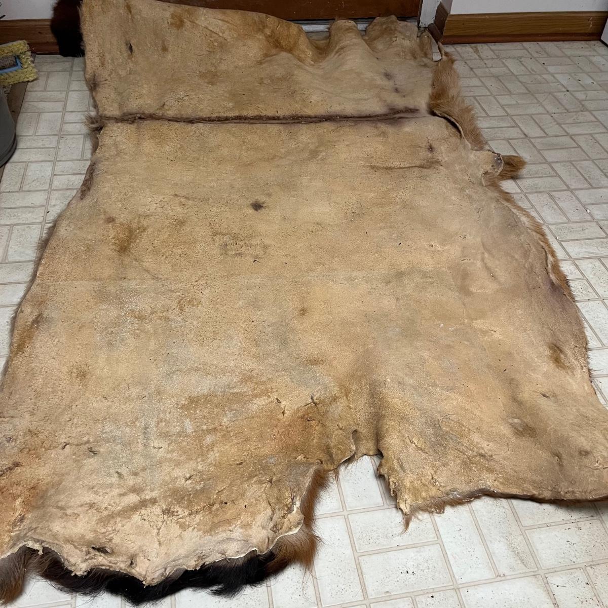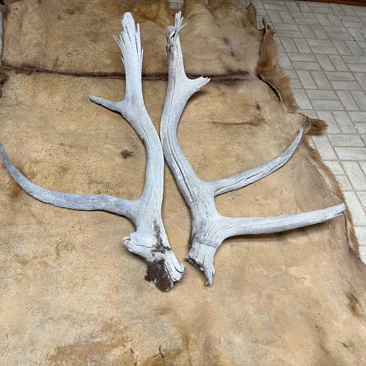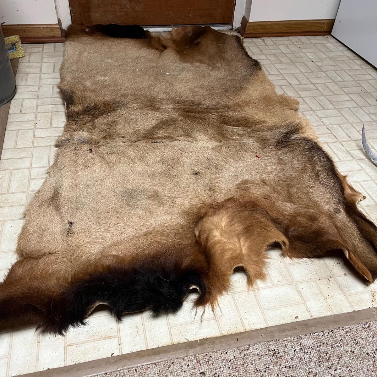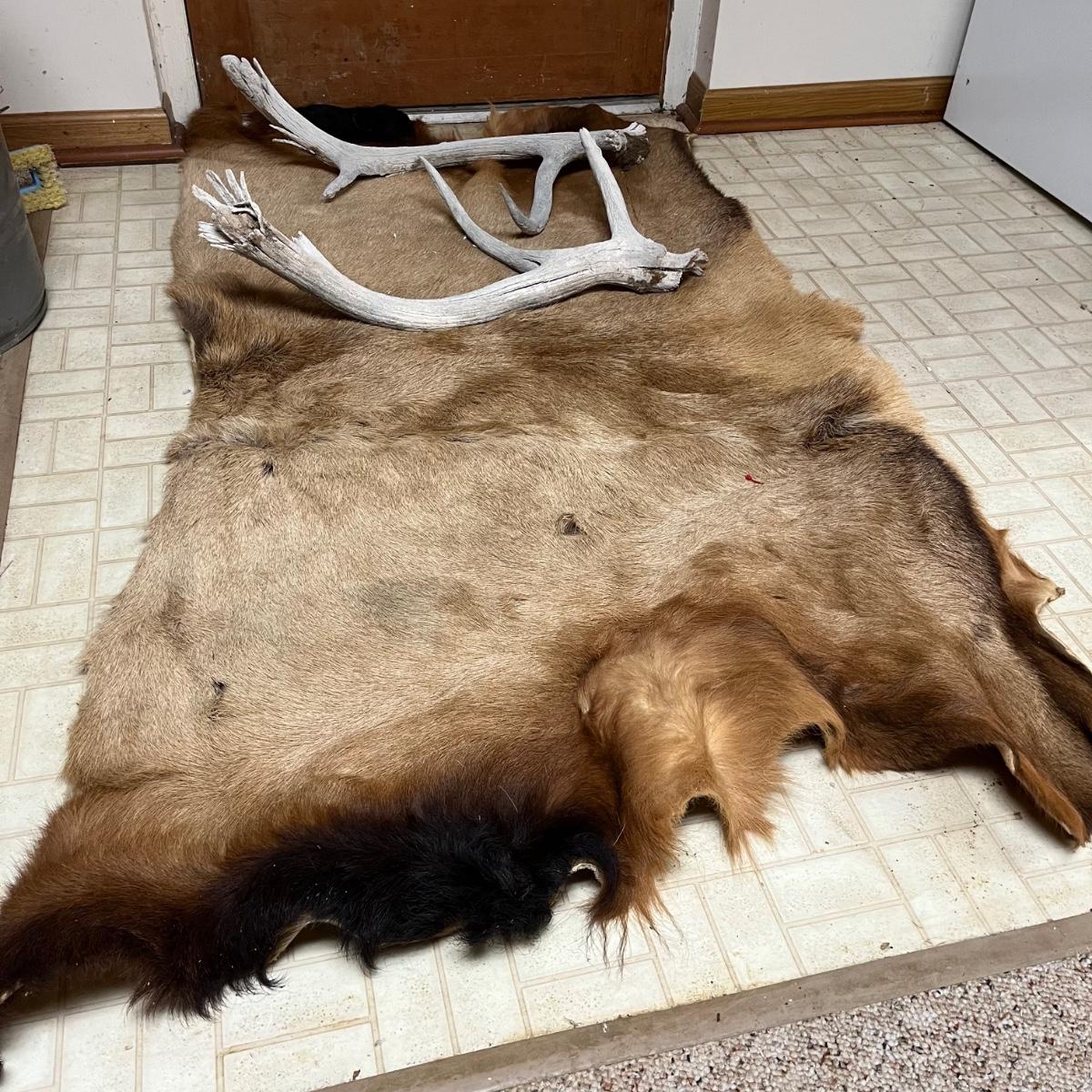 Lot includes an animal hide that measures 38” x 68” and two antlers.