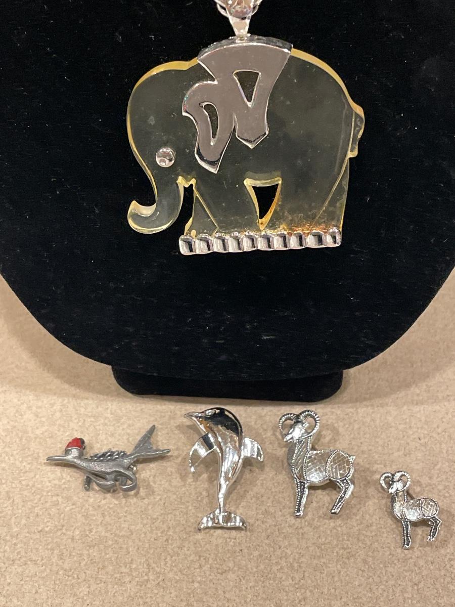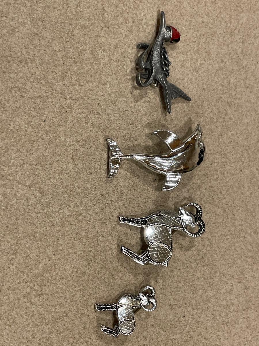 Smaller pins, goat pins are stamped Japan, dolphin has a name on back but cannot make out what it says, bird is from Shriners