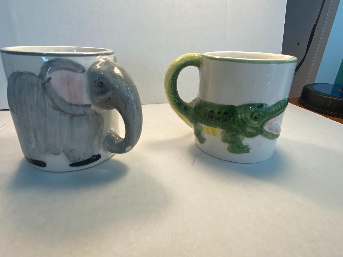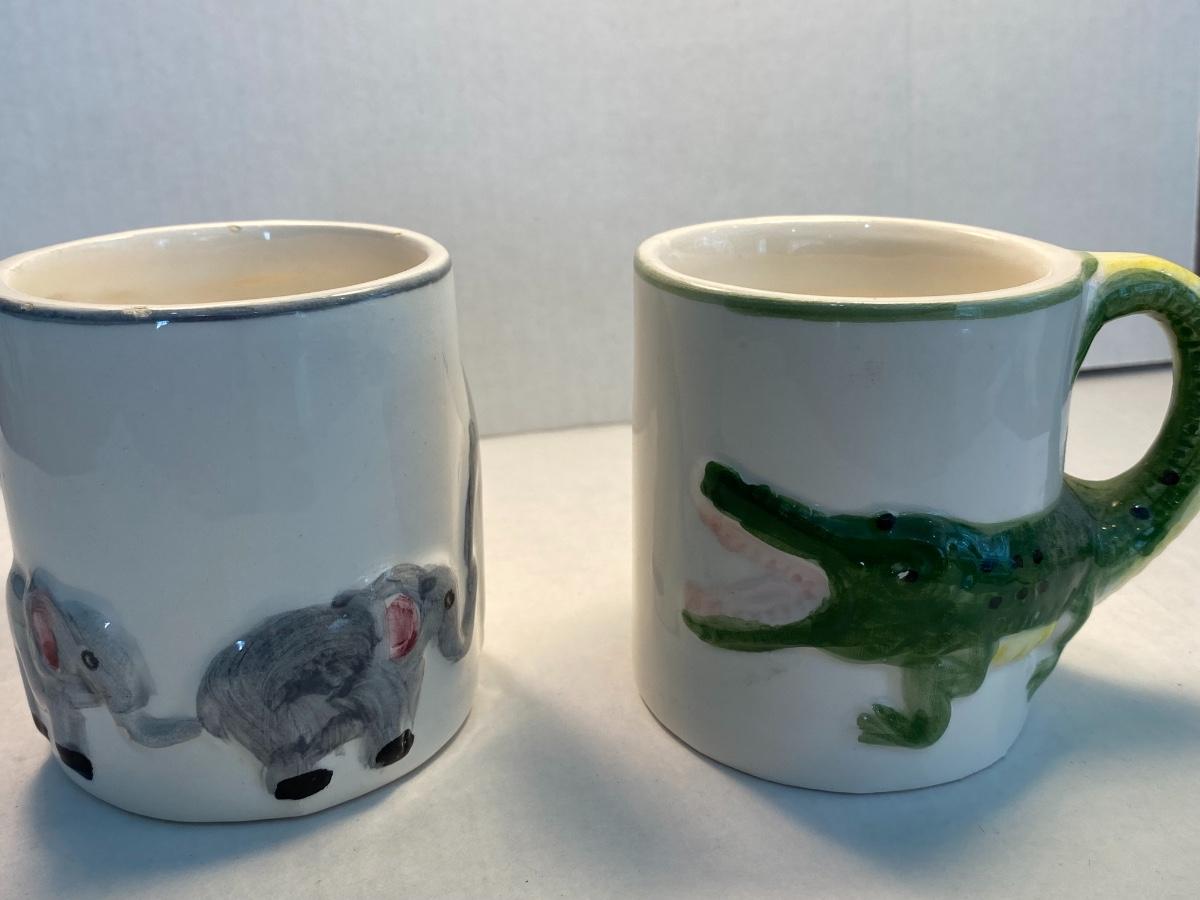 Aligator and Mama elephanat with babies coffee mugs. Hand painted. Elephant has flake on trunk