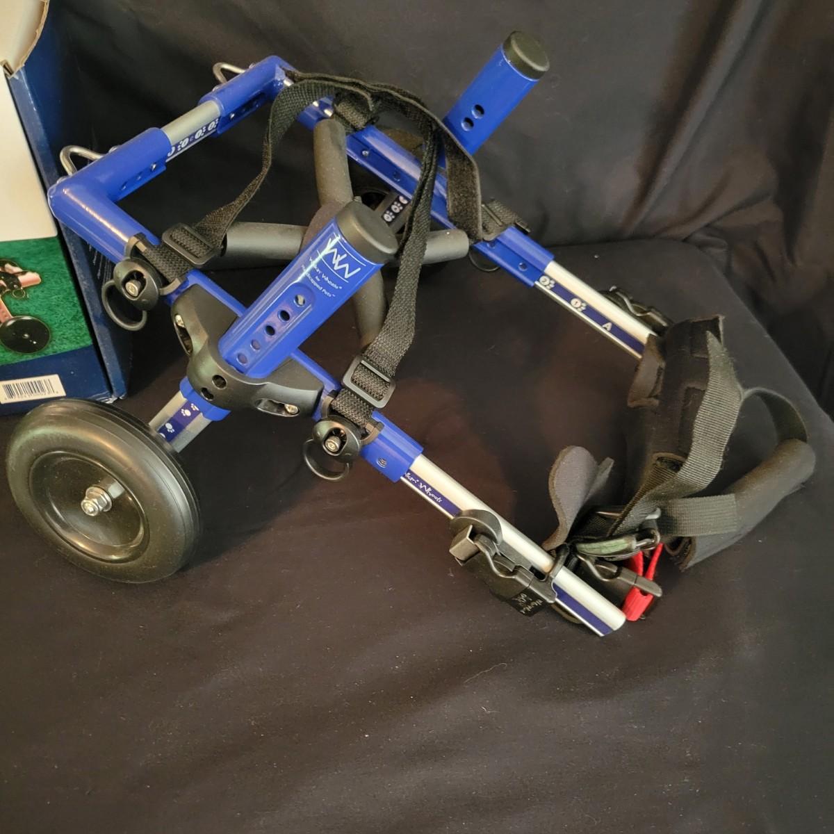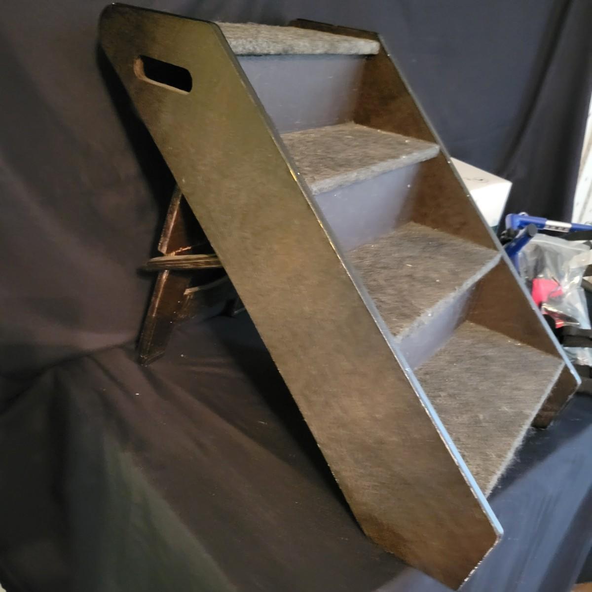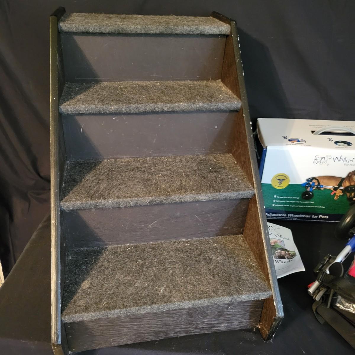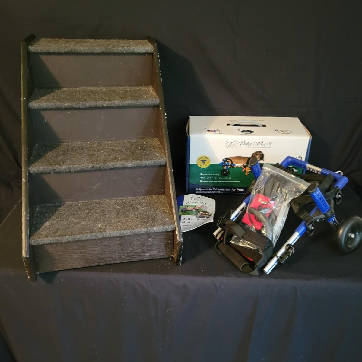 An Animal Planet Pet staircase that collapses for convenient storage. It measures approximately 24" x 15" x 20"H. Also included is a Walkin Wheels adjustable pet wheelchair for pets ranging from 8 to 25lbs. It has adjustable width, height and length. It includes its original packaging and additional pieces. Local pickup only