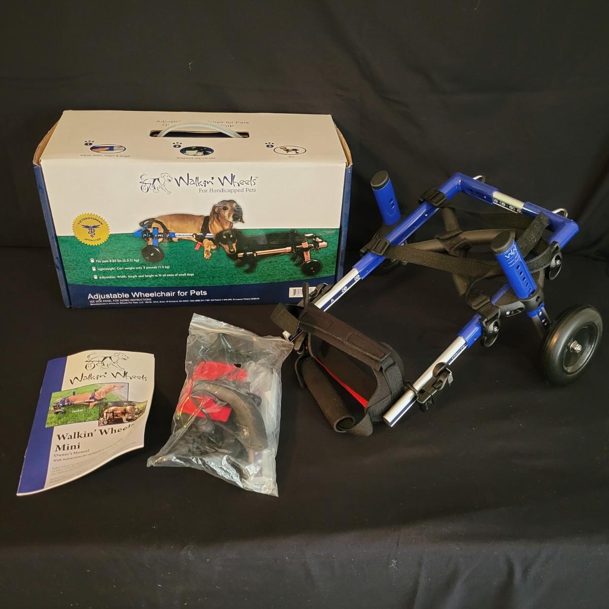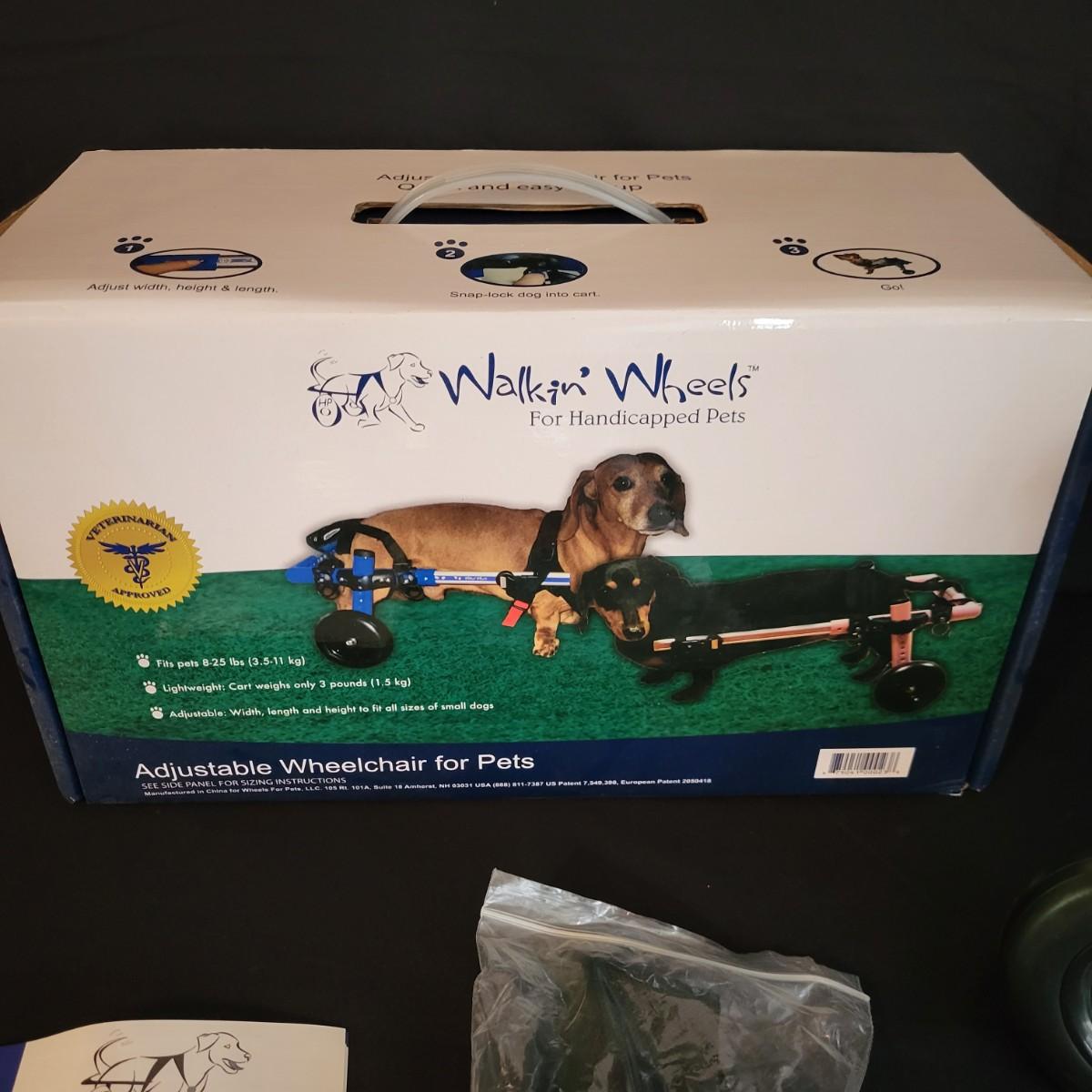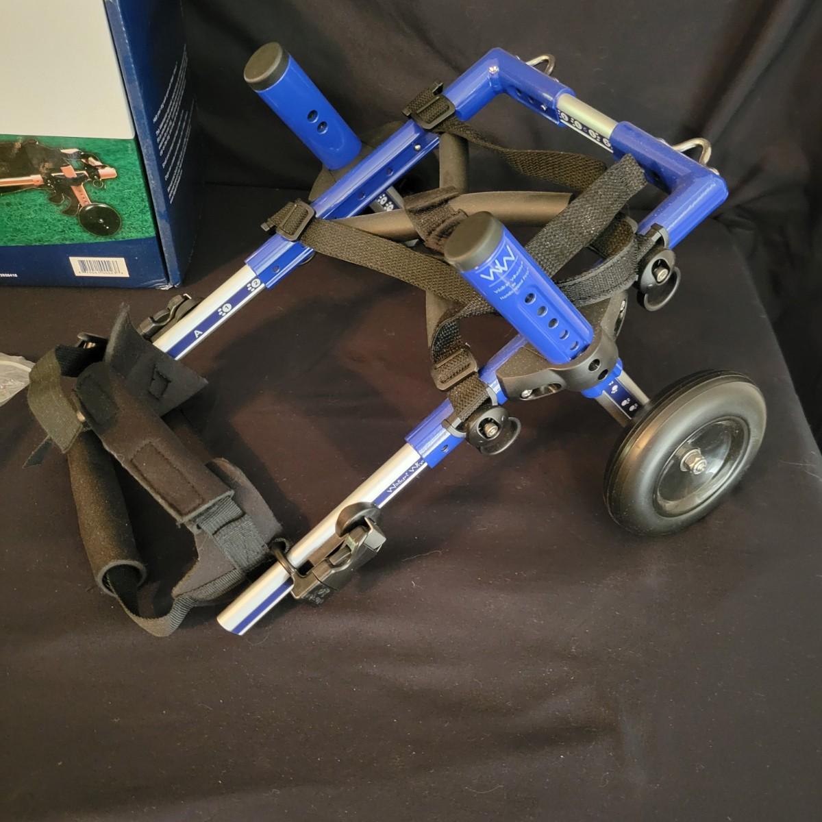 An Animal Planet Pet staircase that collapses for convenient storage. It measures approximately 24" x 15" x 20"H. Also included is a Walkin Wheels adjustable pet wheelchair for pets ranging from 8 to 25lbs. It has adjustable width, height and length. It includes its original packaging and additional pieces. Local pickup only
