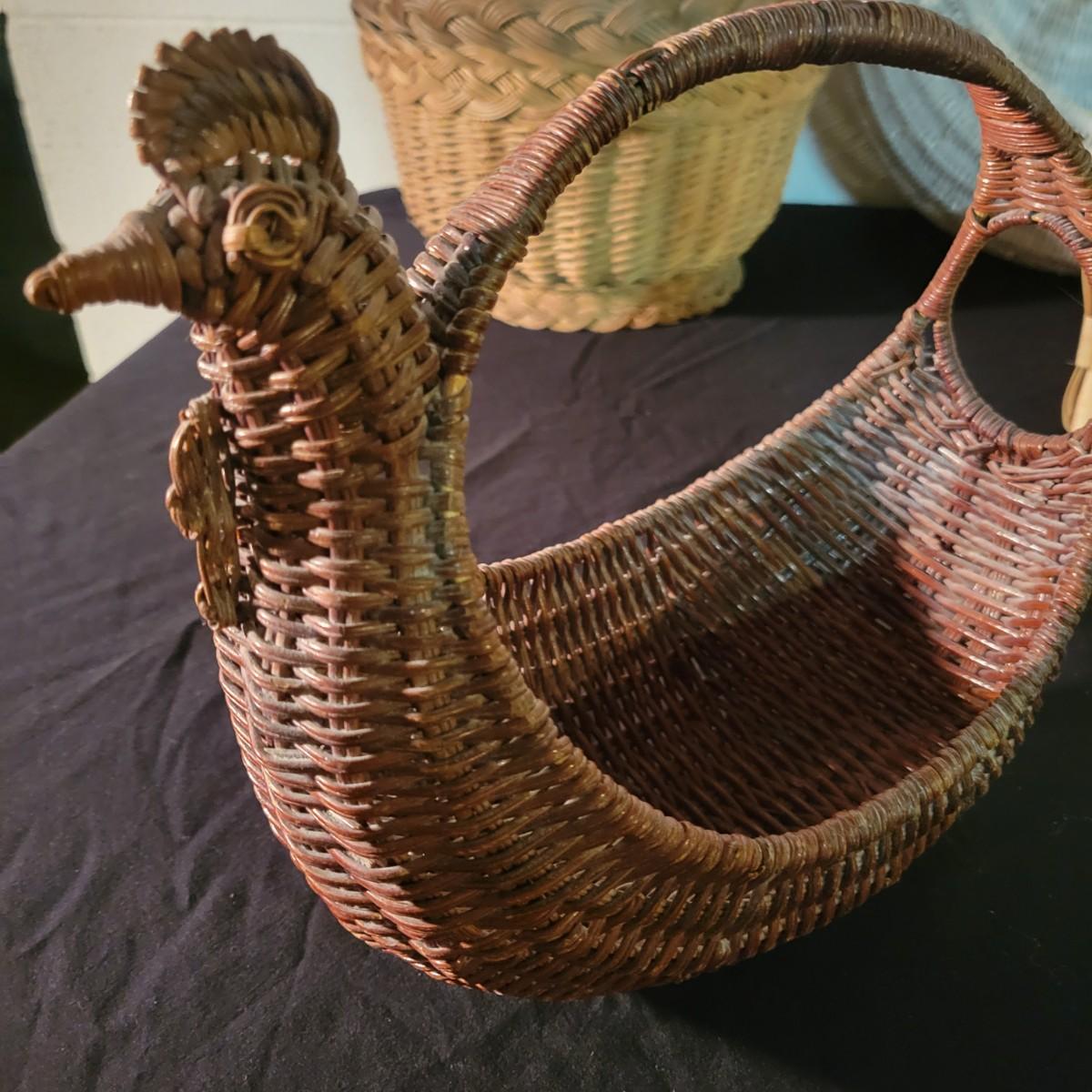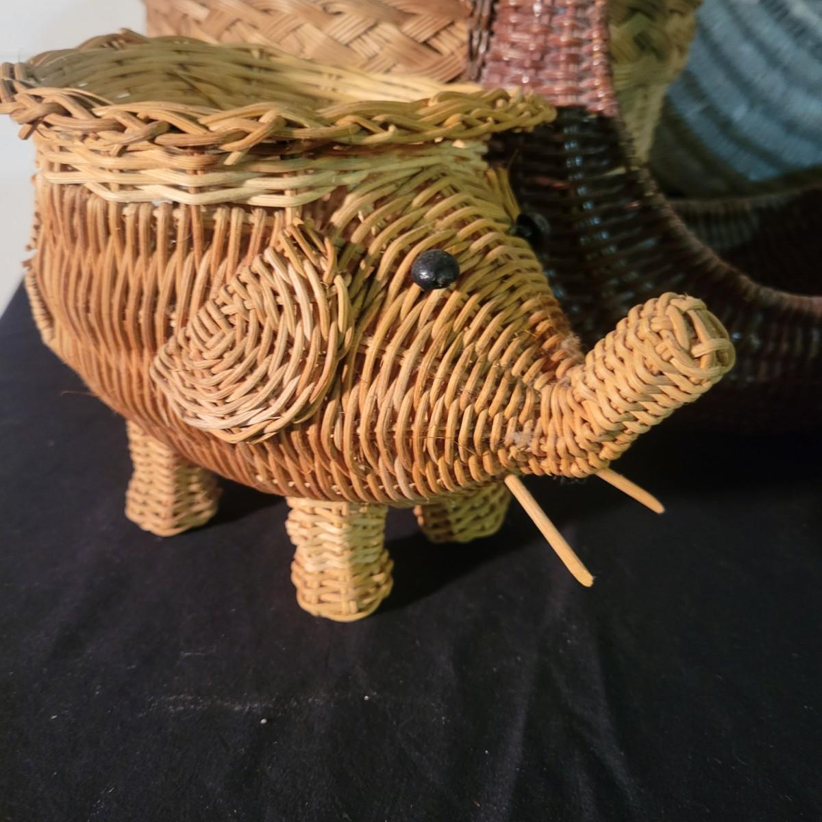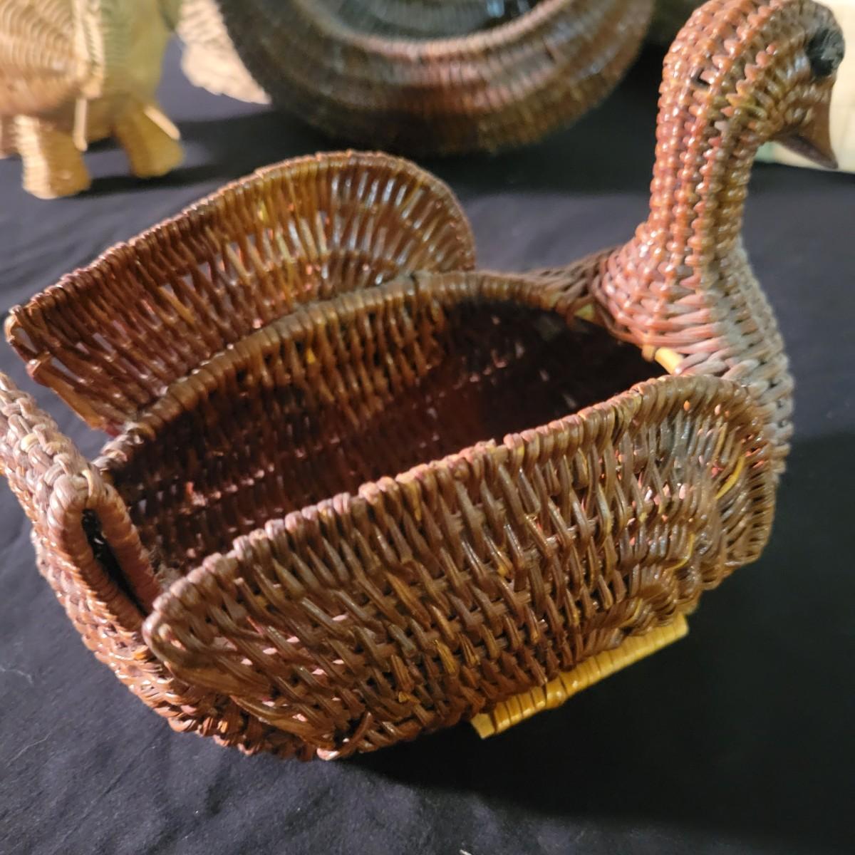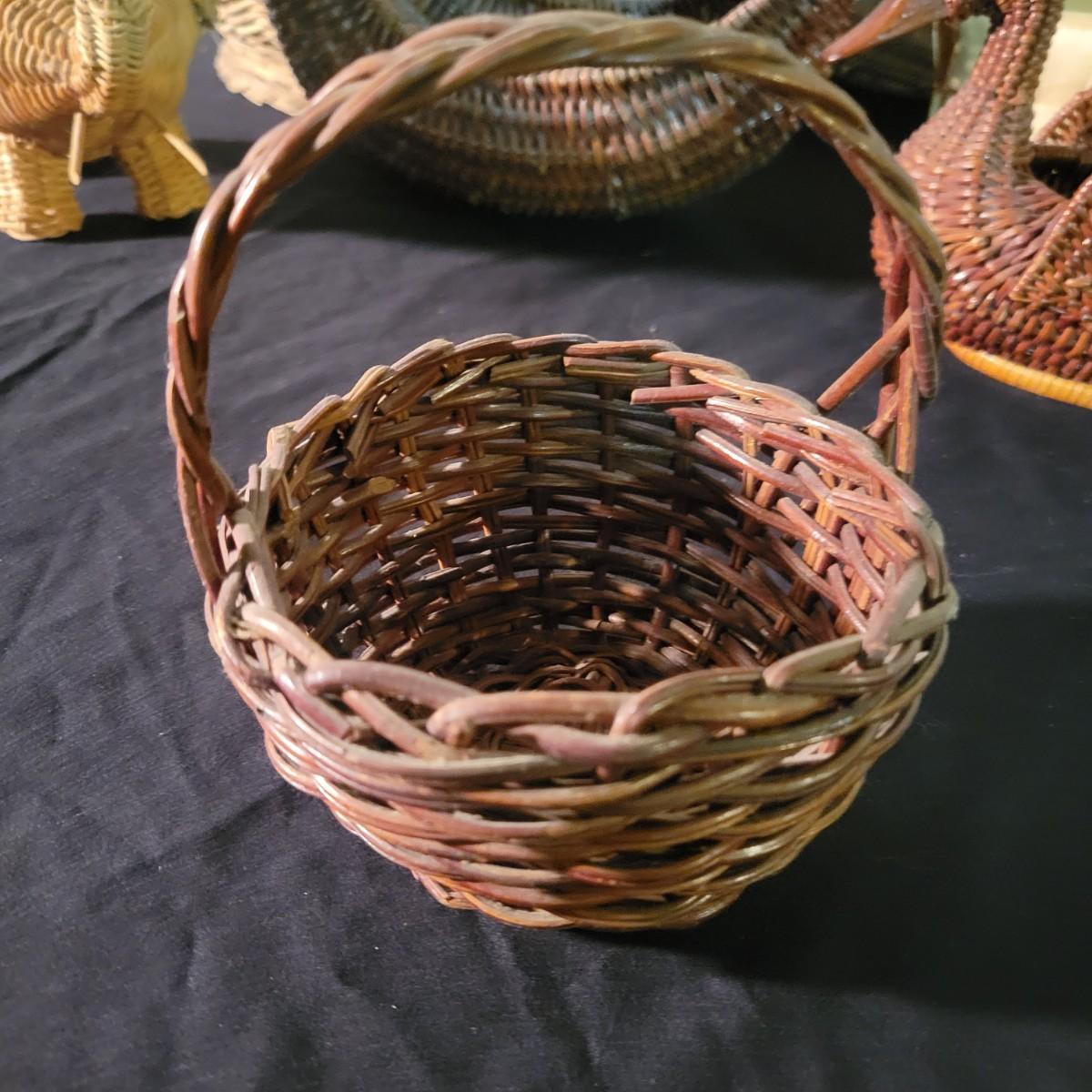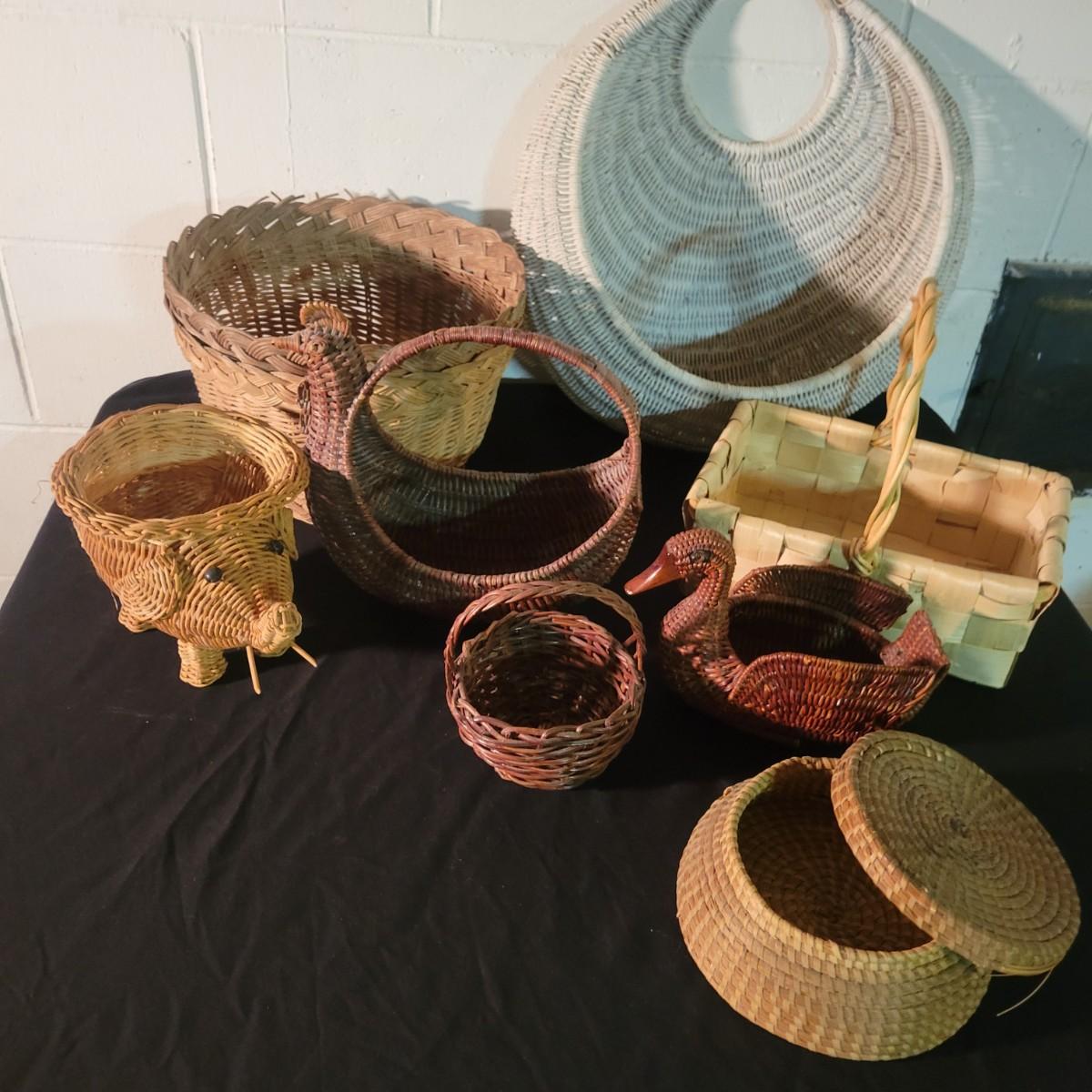 An assortment of eight baskets made in a variety of materials and sizes in good condition. The largest white basket is made of woven wicker and measures approximately 16" x 17" x 9". Other baskets are also made of wicker, one is made of thin strips of birch and one is made of woven grass. Three baskets are woven to look like animals. Local pickup only