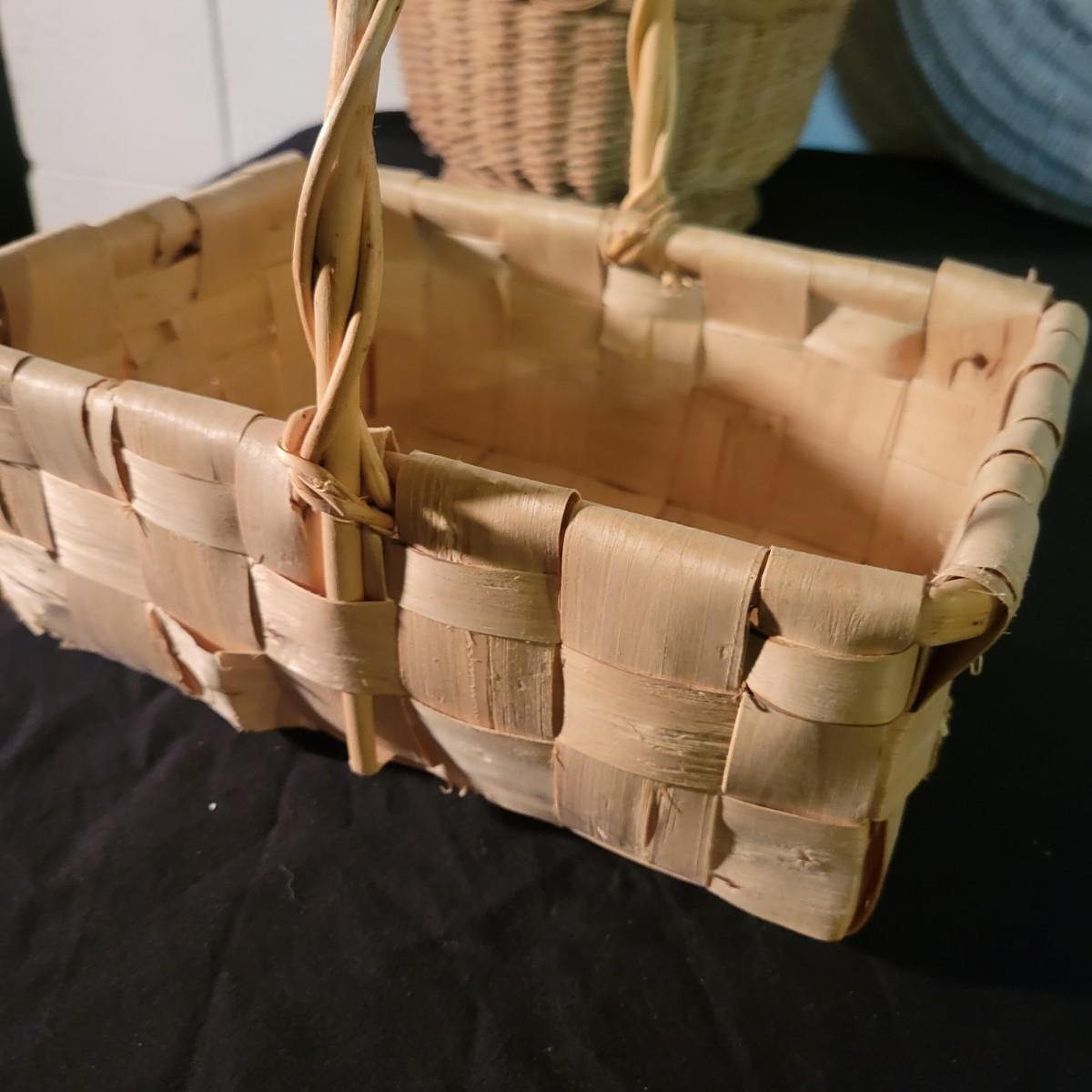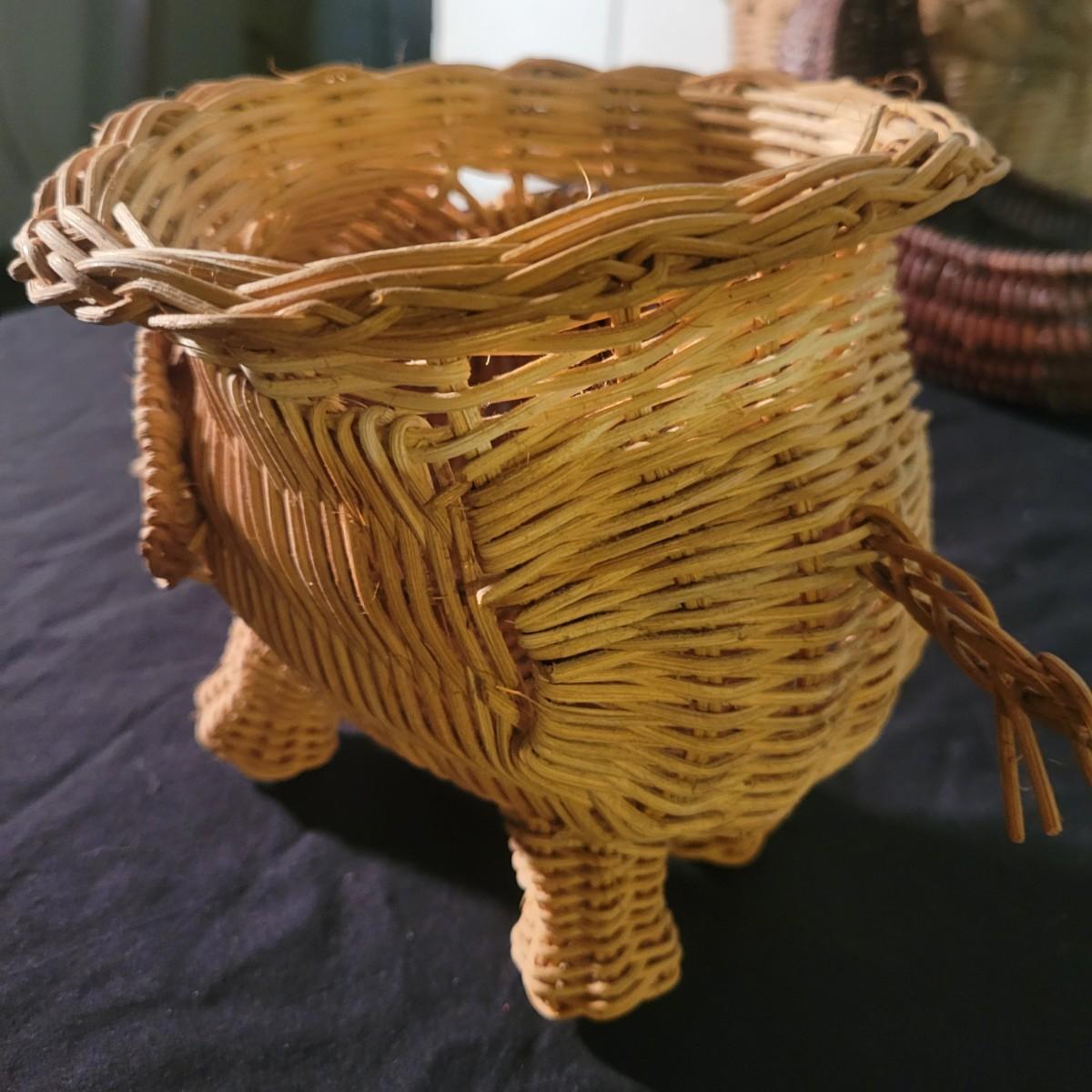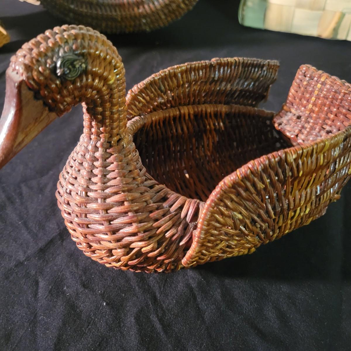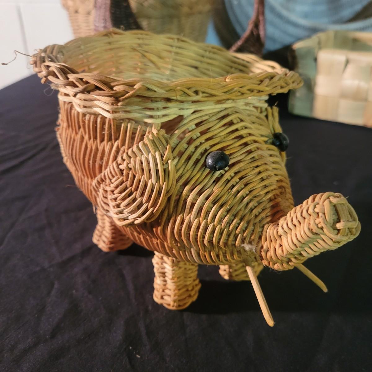 An assortment of eight baskets made in a variety of materials and sizes in good condition. The largest white basket is made of woven wicker and measures approximately 16" x 17" x 9". Other baskets are also made of wicker, one is made of thin strips of birch and one is made of woven grass. Three baskets are woven to look like animals. Local pickup only