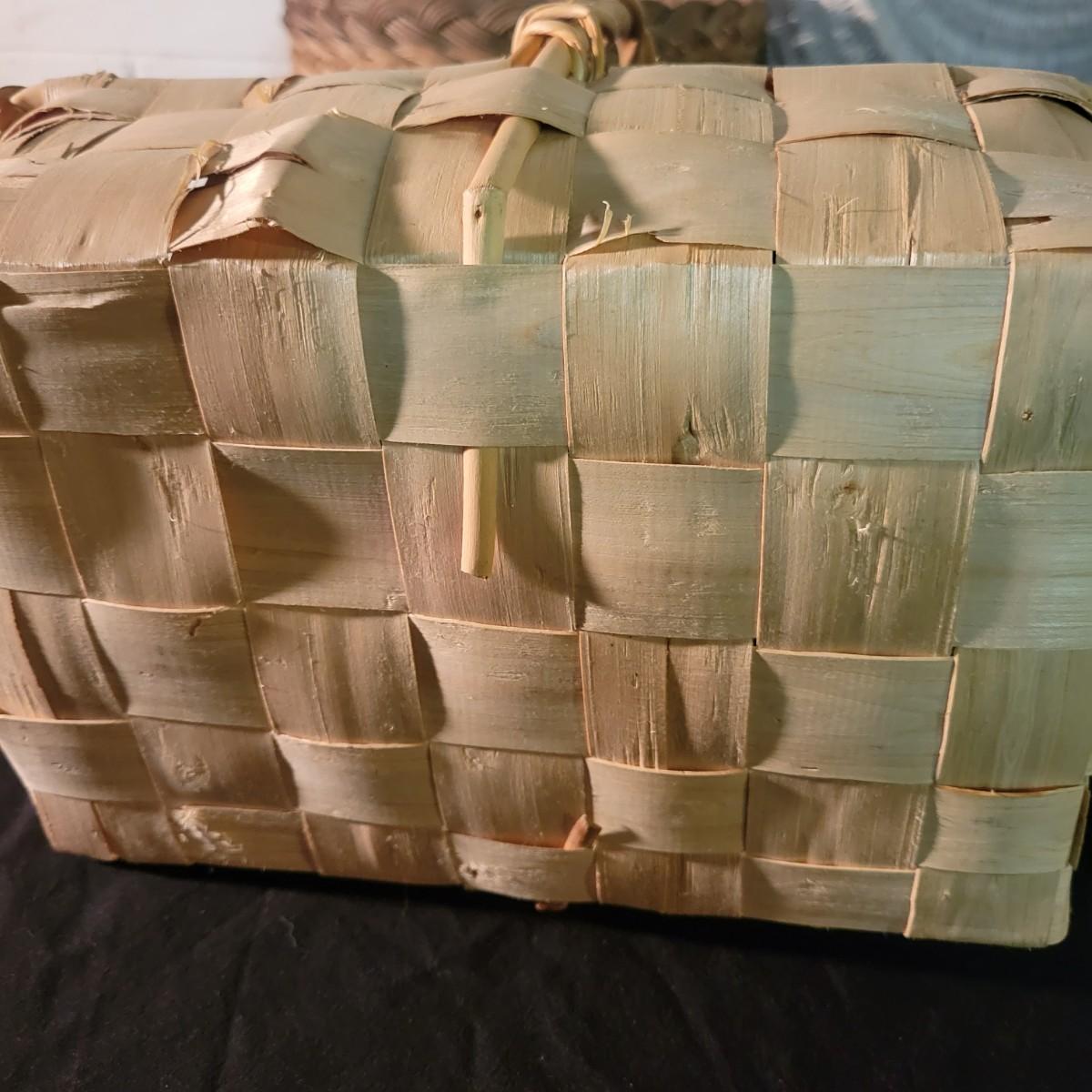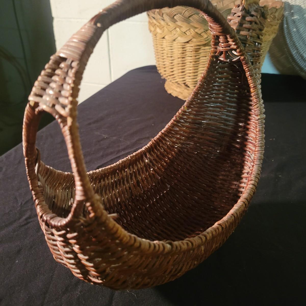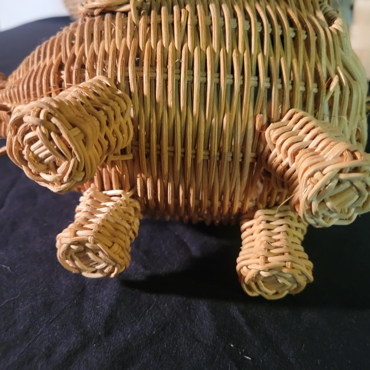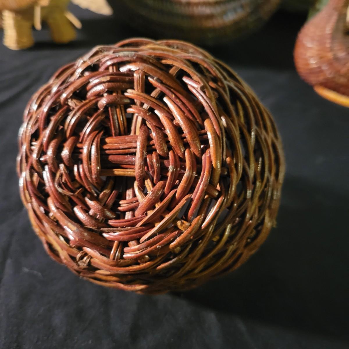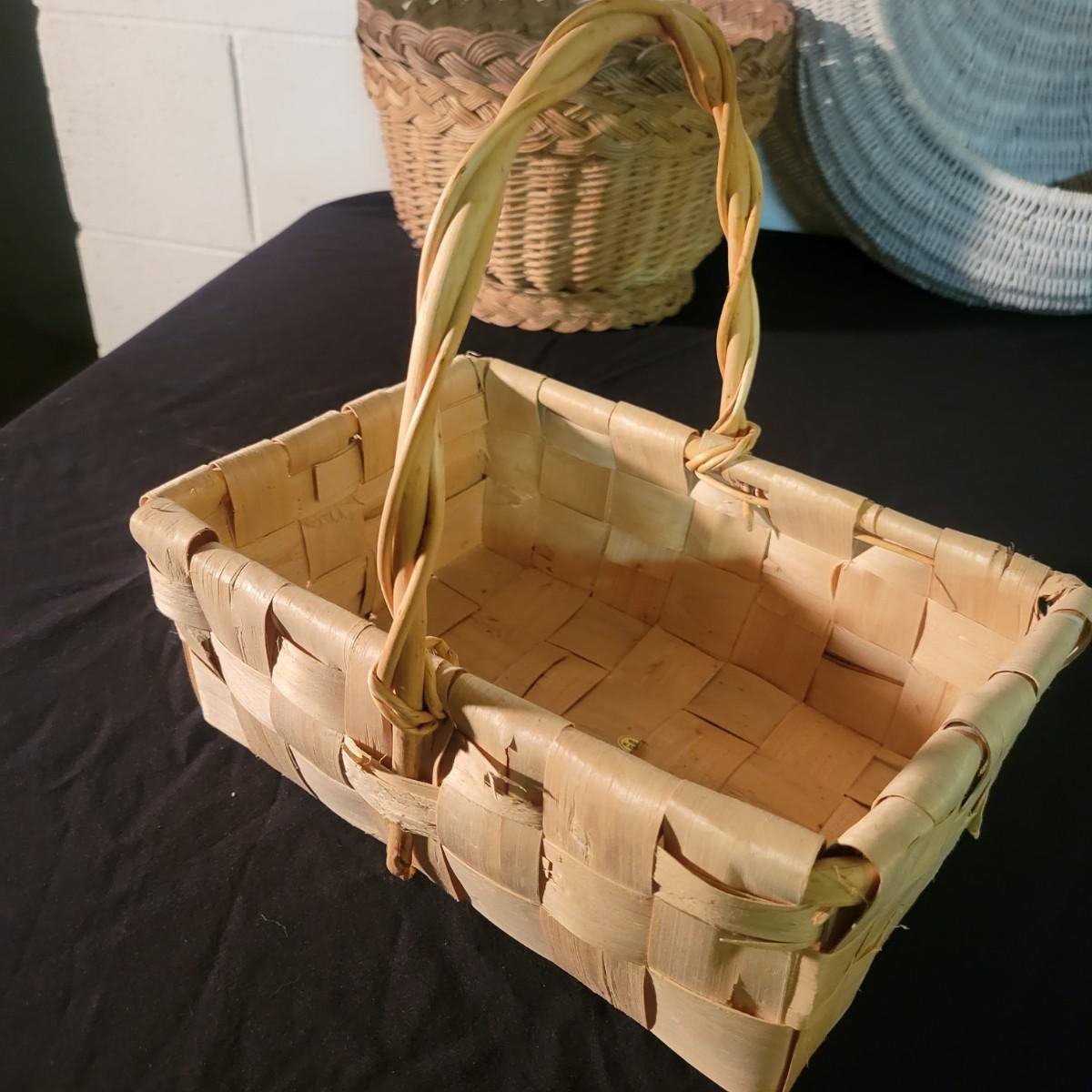 An assortment of eight baskets made in a variety of materials and sizes in good condition. The largest white basket is made of woven wicker and measures approximately 16" x 17" x 9". Other baskets are also made of wicker, one is made of thin strips of birch and one is made of woven grass. Three baskets are woven to look like animals. Local pickup only
