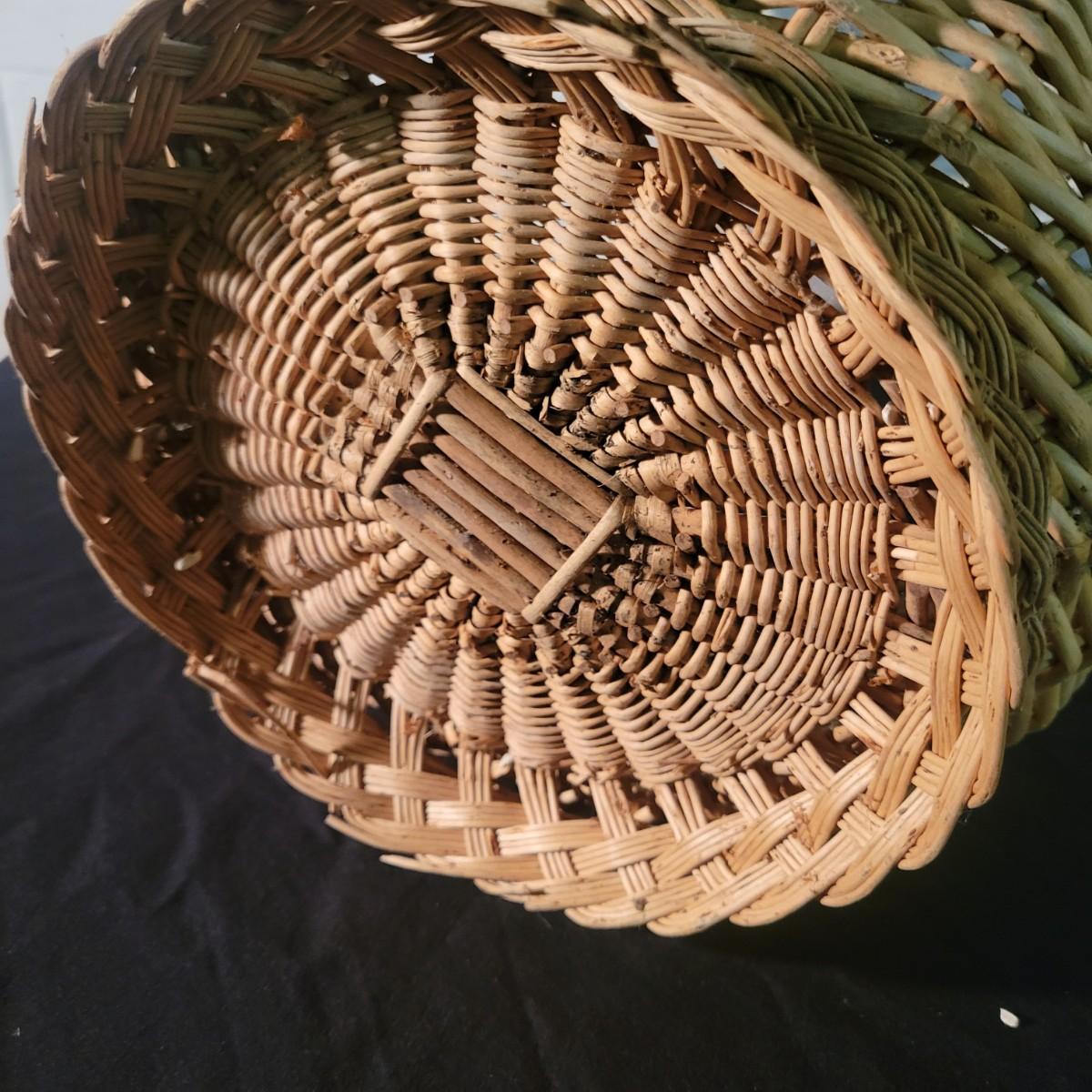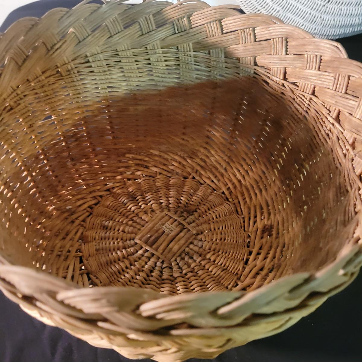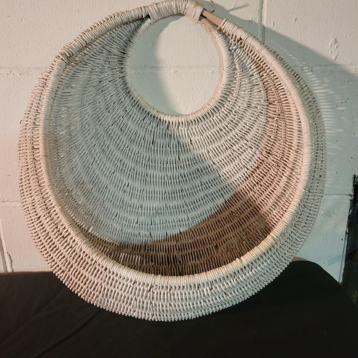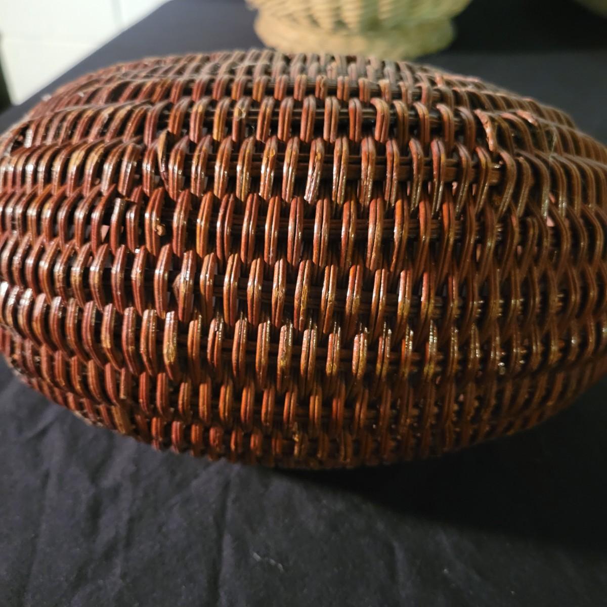 An assortment of eight baskets made in a variety of materials and sizes in good condition. The largest white basket is made of woven wicker and measures approximately 16" x 17" x 9". Other baskets are also made of wicker, one is made of thin strips of birch and one is made of woven grass. Three baskets are woven to look like animals. Local pickup only