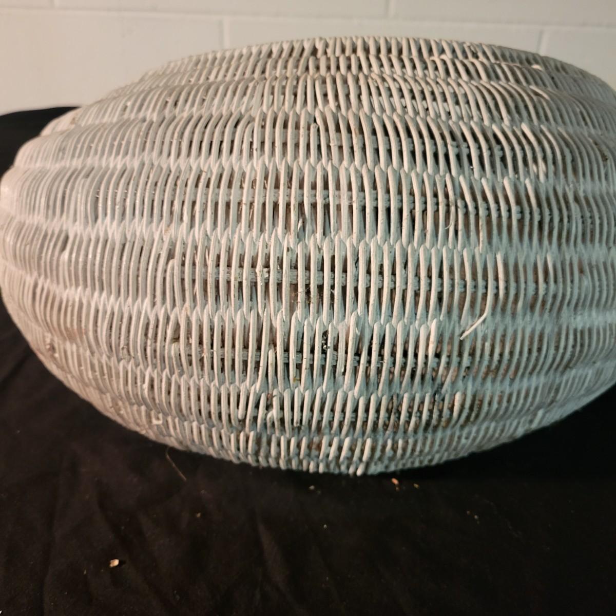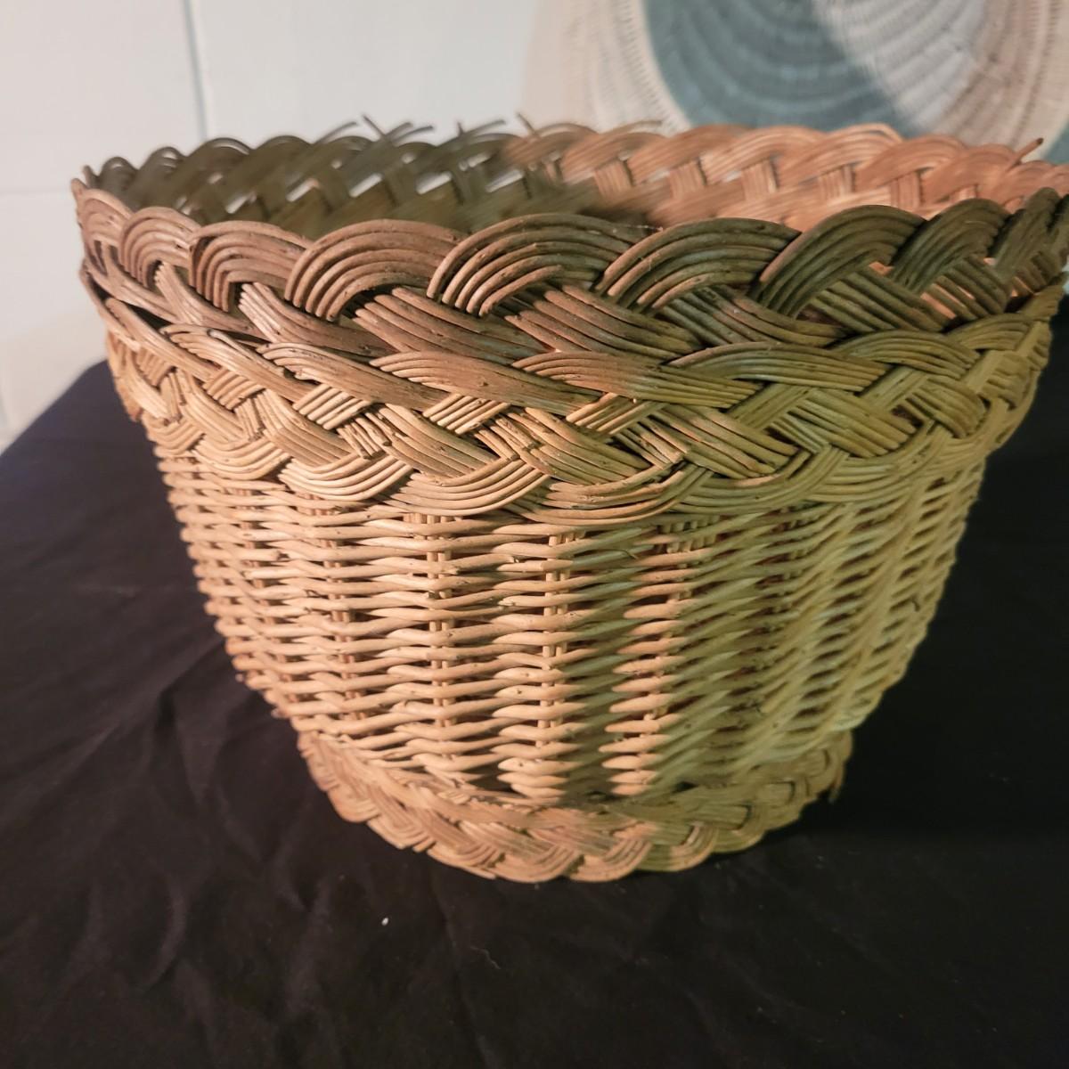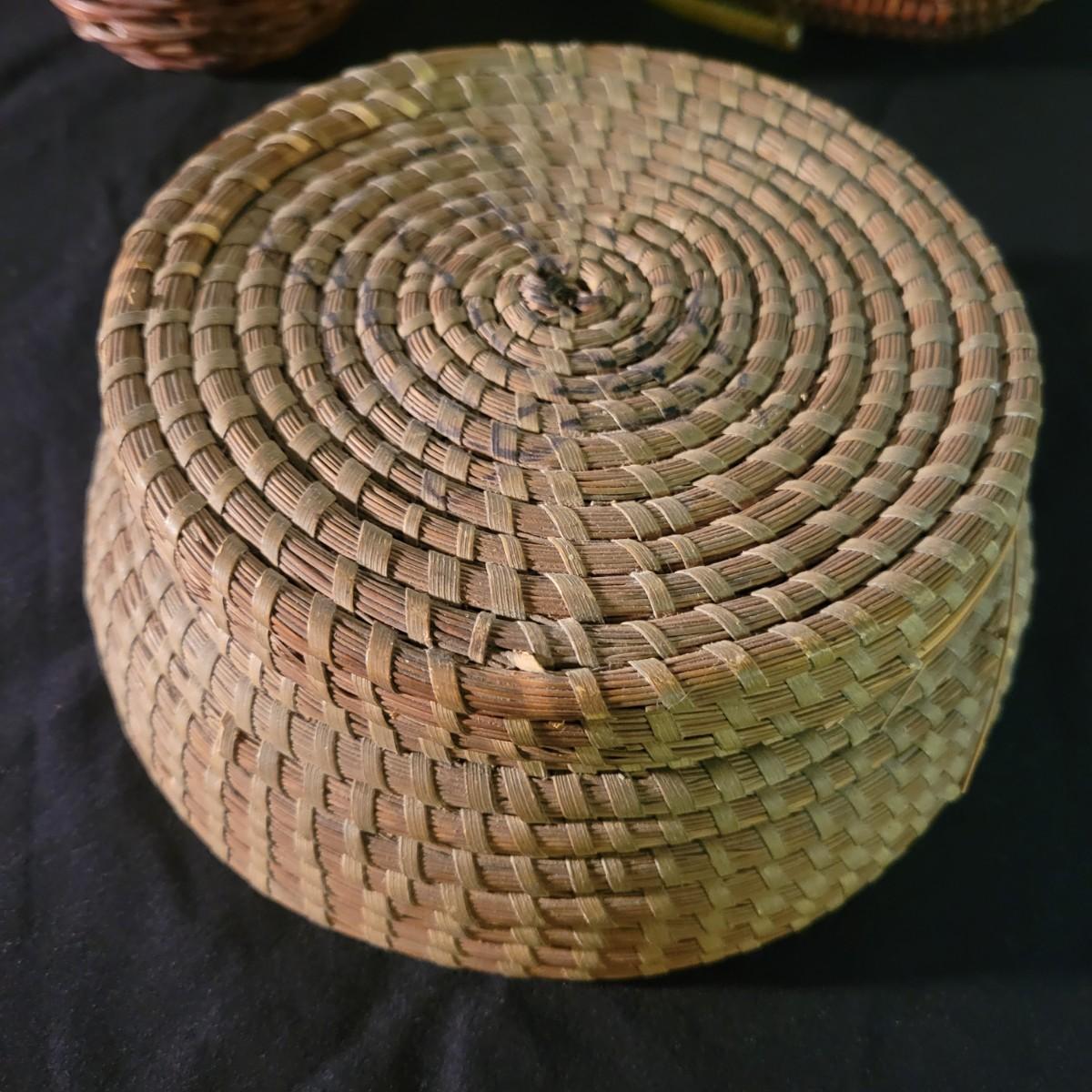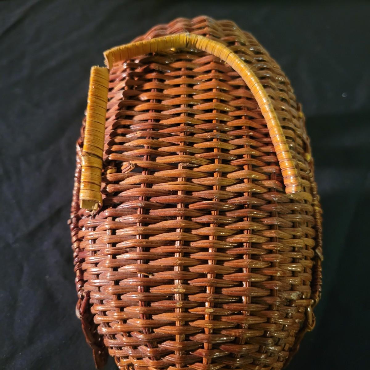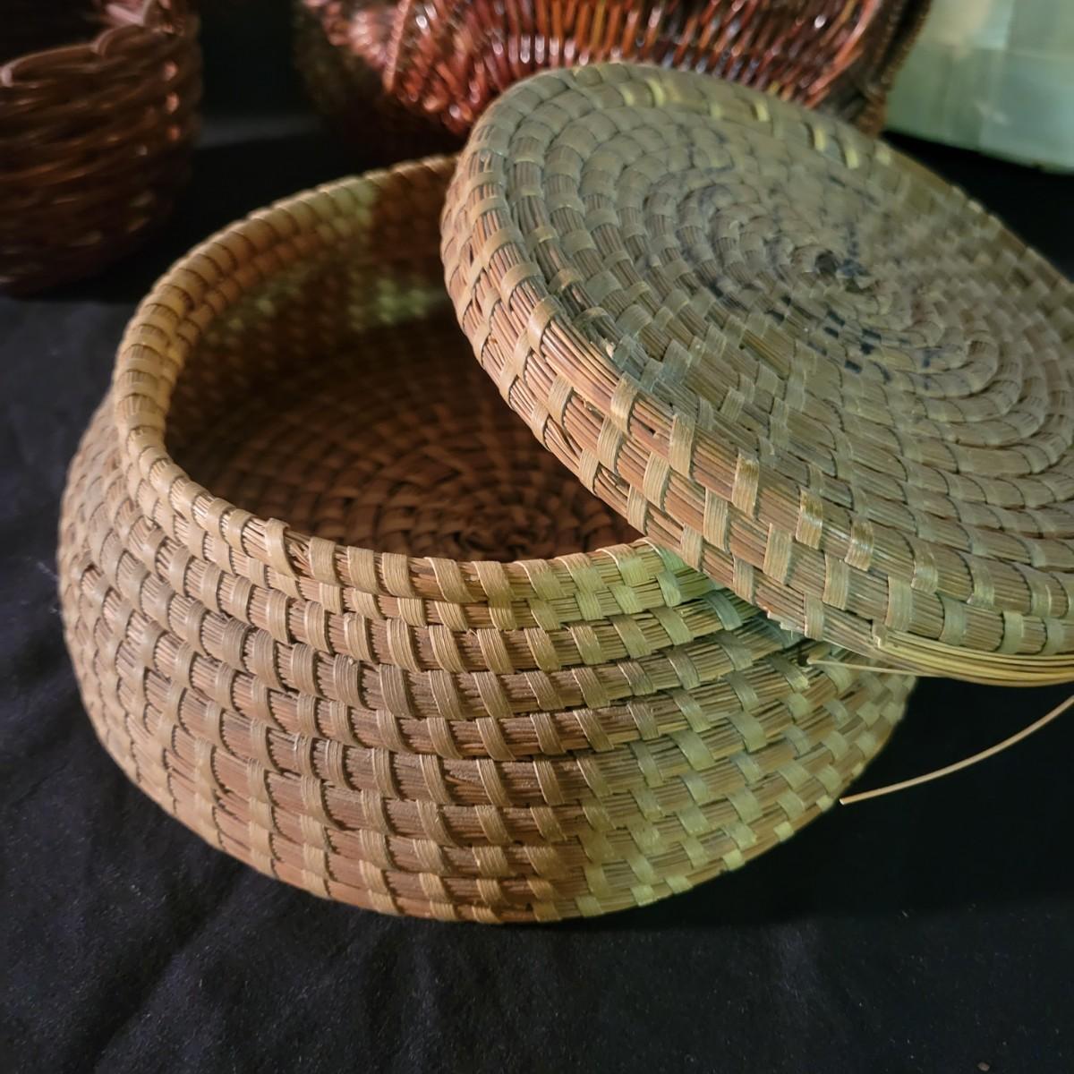 An assortment of eight baskets made in a variety of materials and sizes in good condition. The largest white basket is made of woven wicker and measures approximately 16" x 17" x 9". Other baskets are also made of wicker, one is made of thin strips of birch and one is made of woven grass. Three baskets are woven to look like animals. Local pickup only
