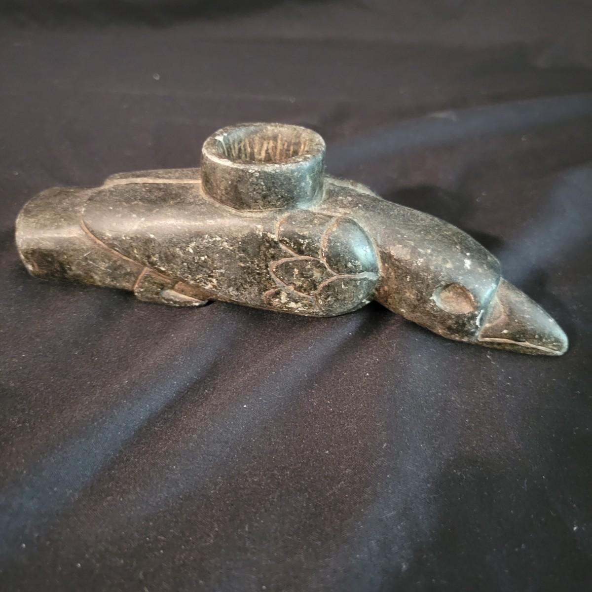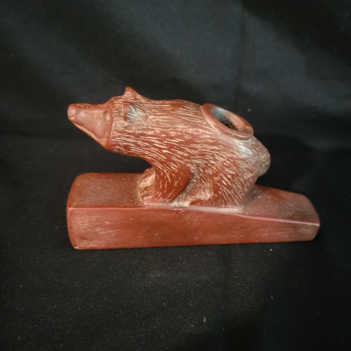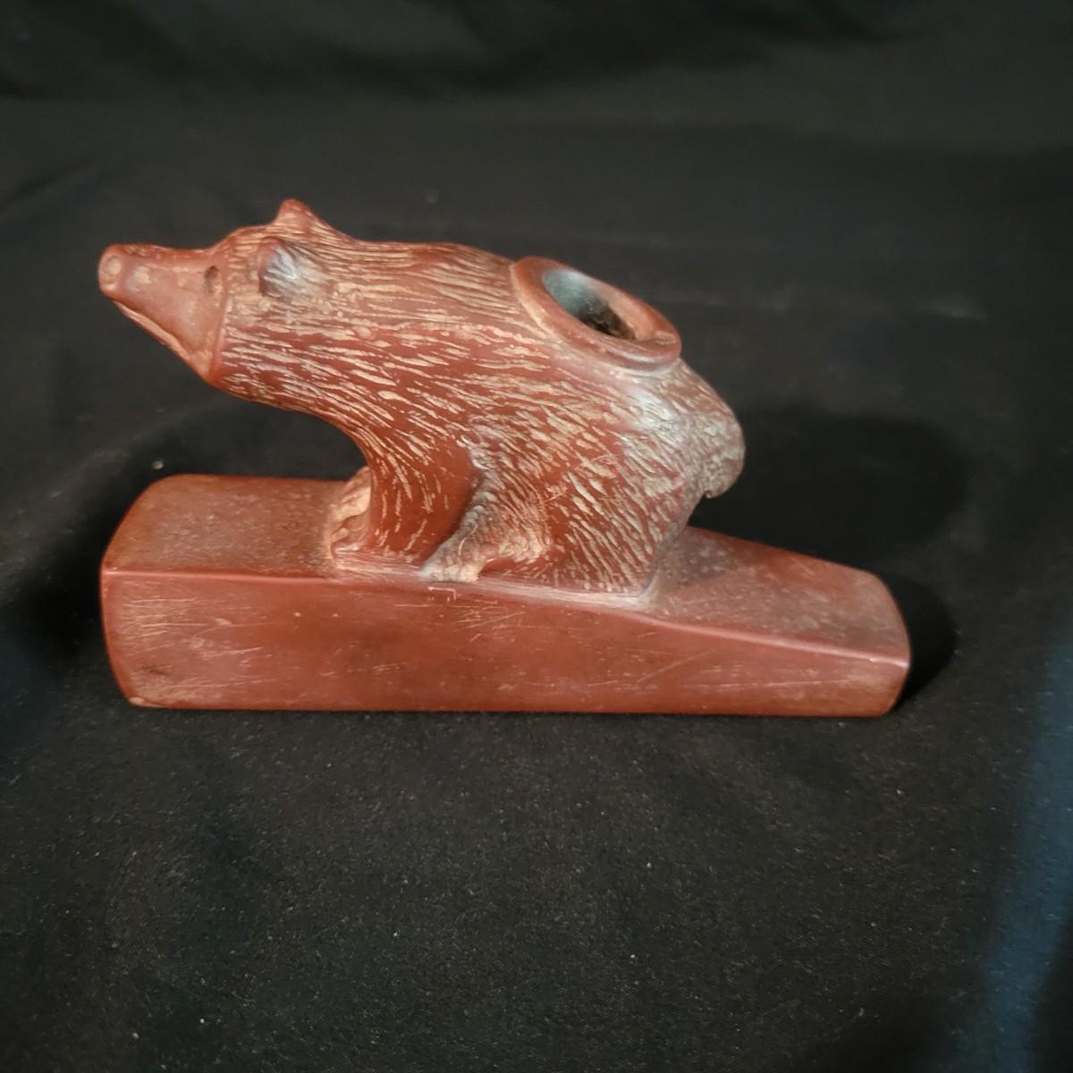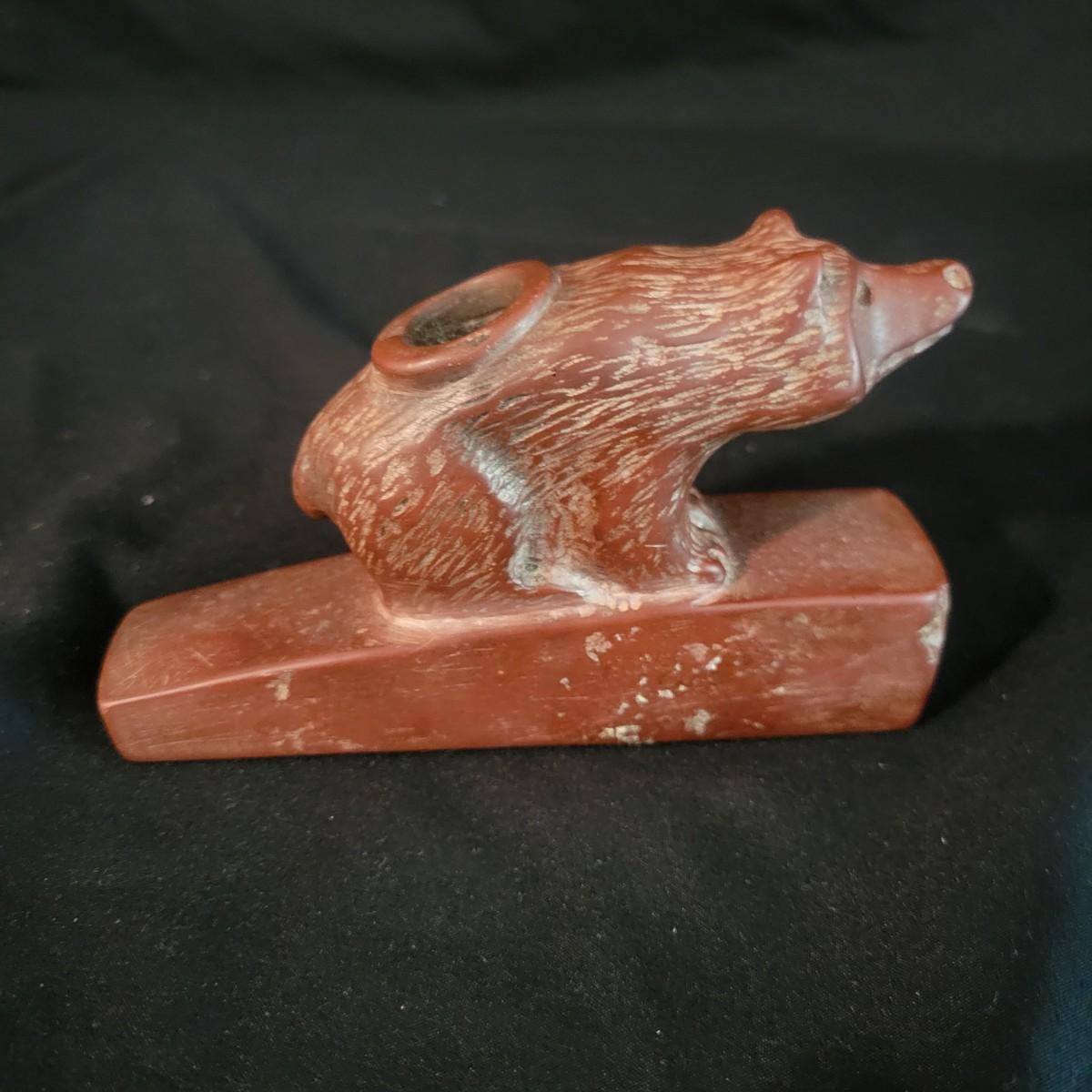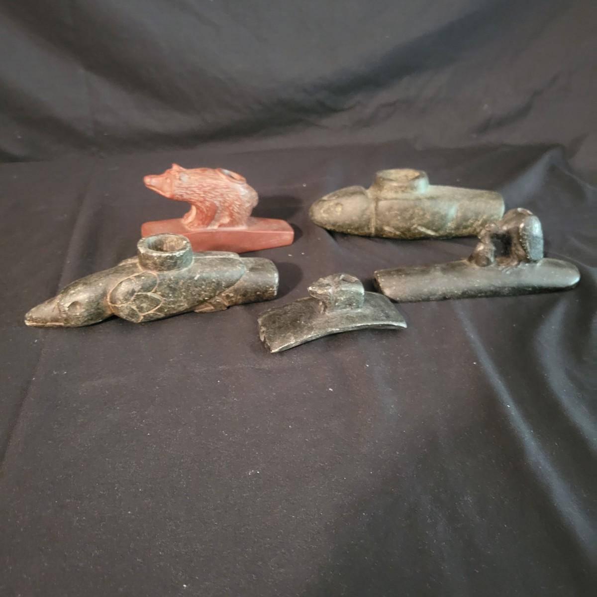 A collection of stone pipes carved with animal styling. There are five pipes in the lot including a bear, vulture and other animal representations. The eagle pipe measures approximately 7" x 2" x 2.5"H. Shipping available.