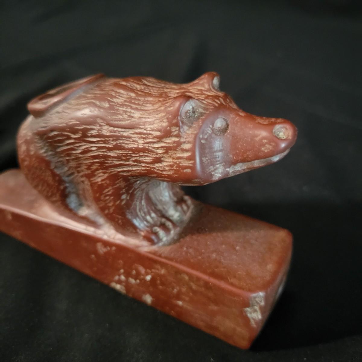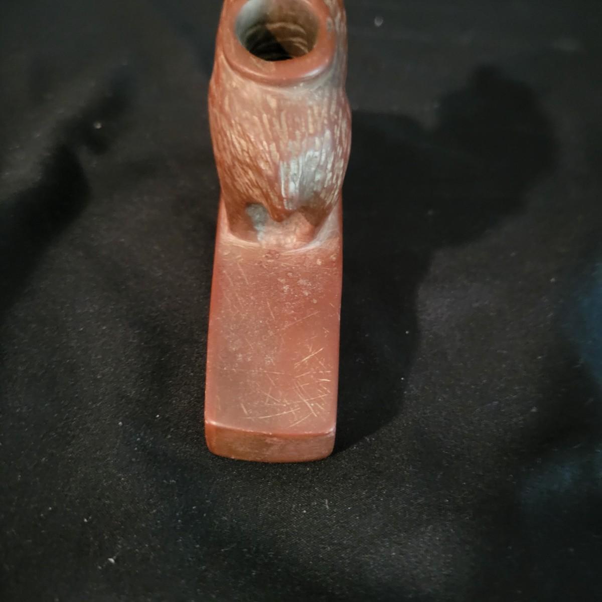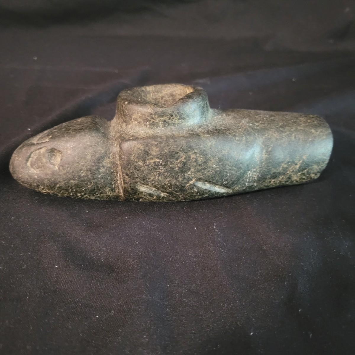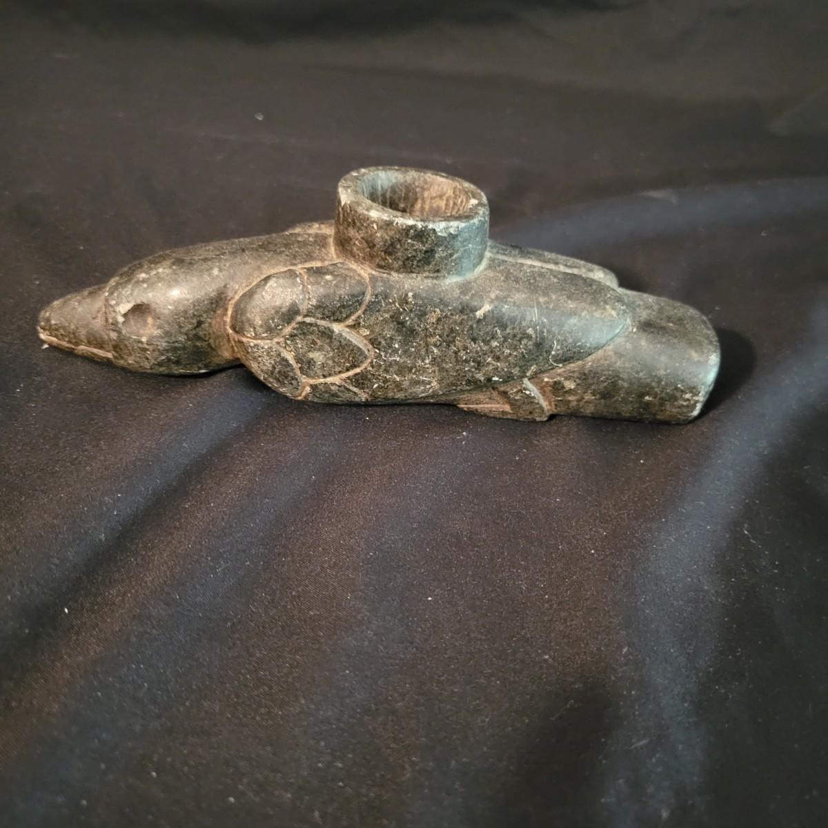 A collection of stone pipes carved with animal styling. There are five pipes in the lot including a bear, vulture and other animal representations. The eagle pipe measures approximately 7" x 2" x 2.5"H. Shipping available.