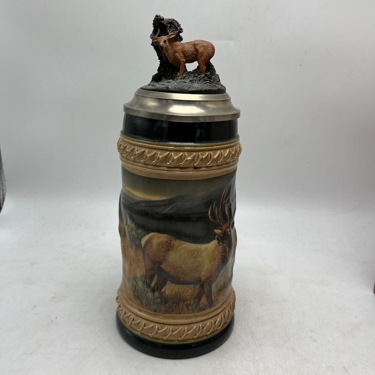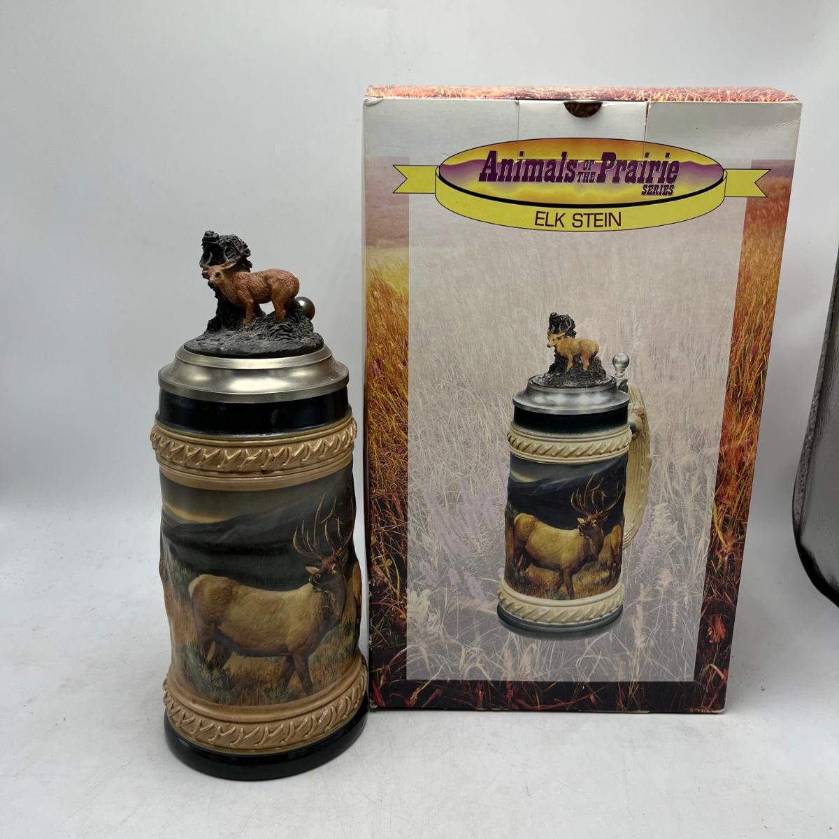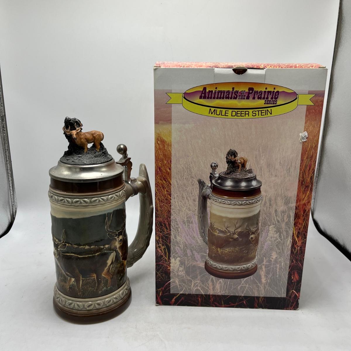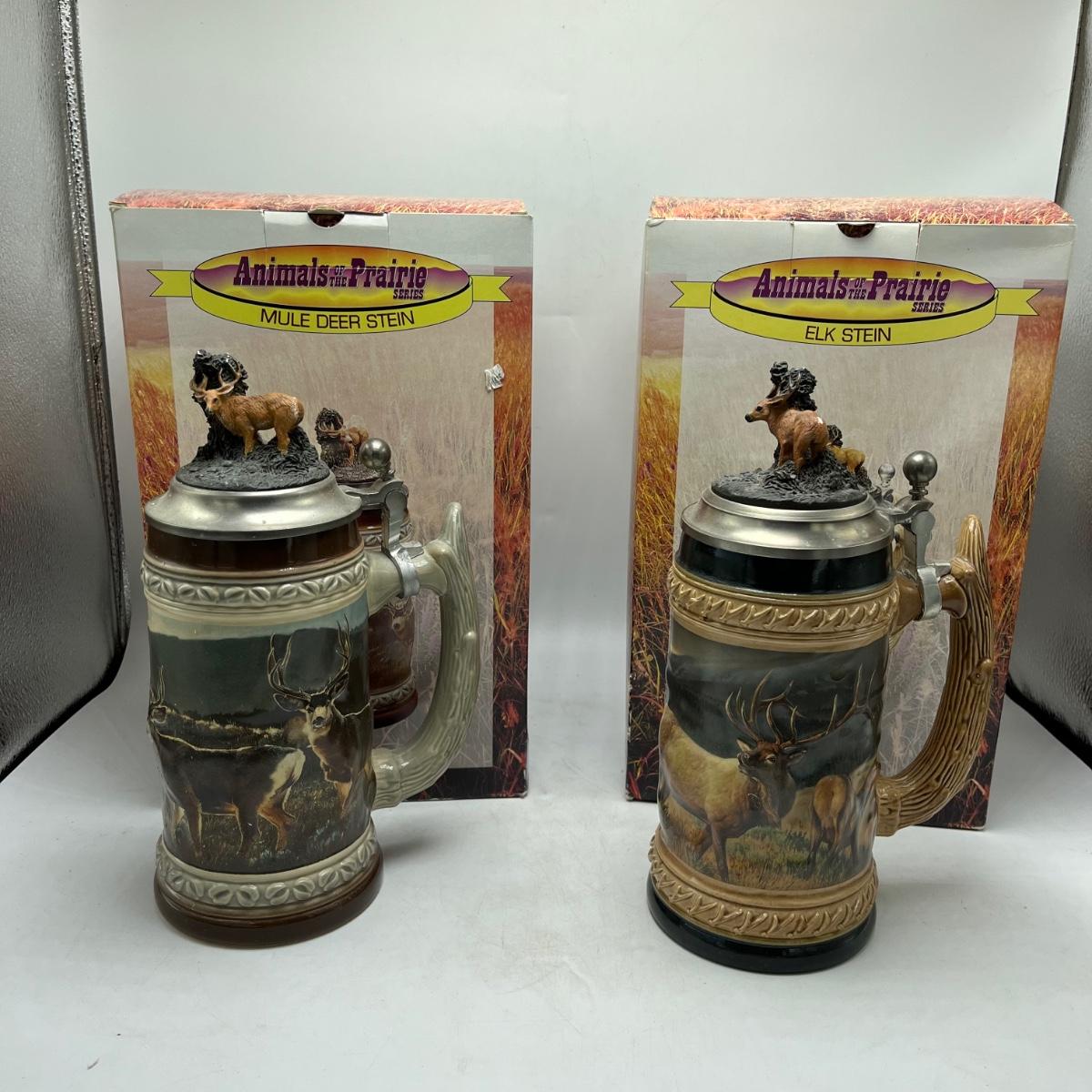 Lot includes two Animals of the Prairies series steins titled Mule Deer and Elk both by artist Nancy Glazier. Steins measure 4” x 6” x 10”.