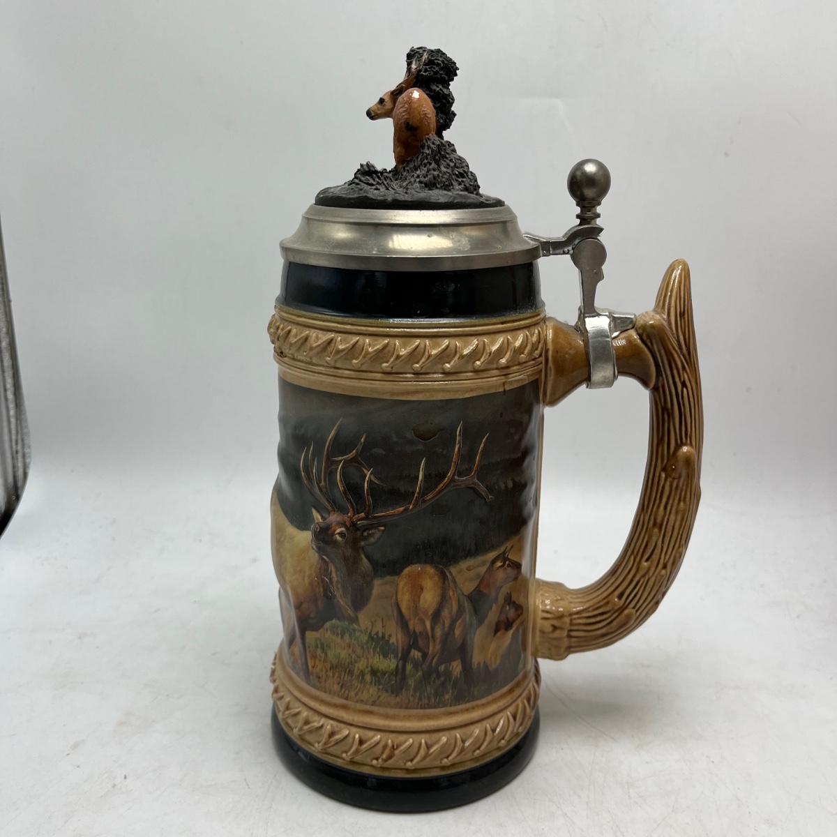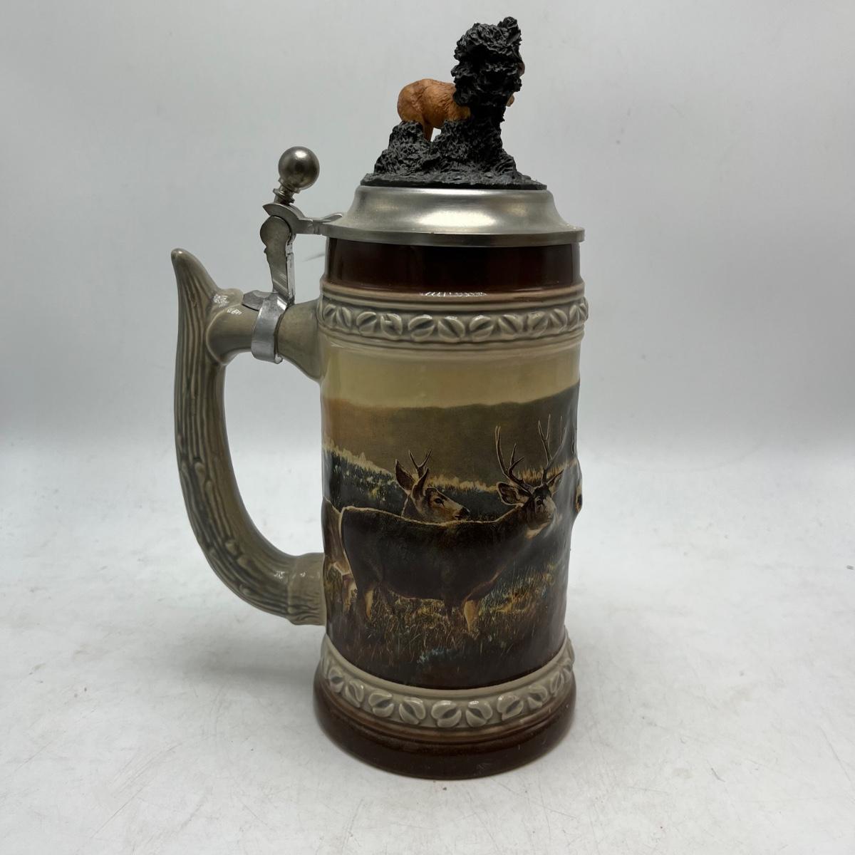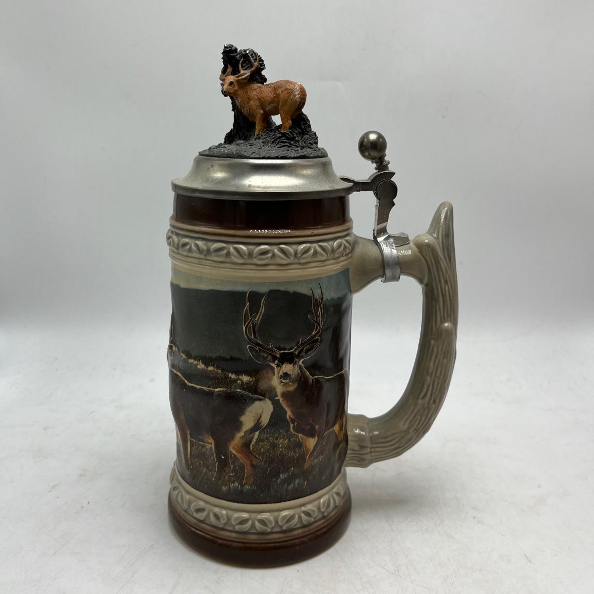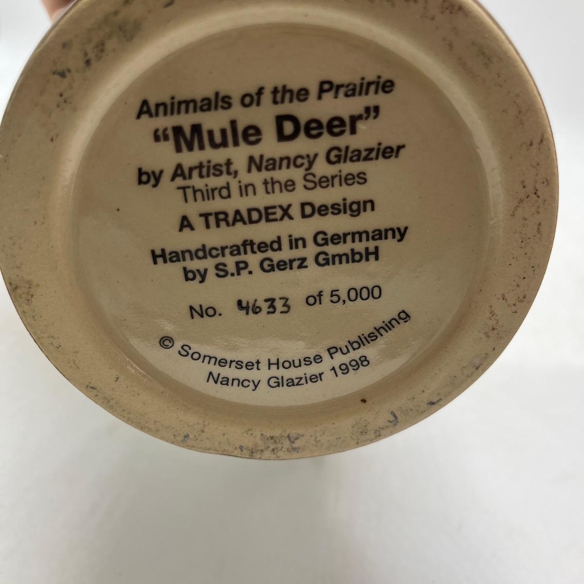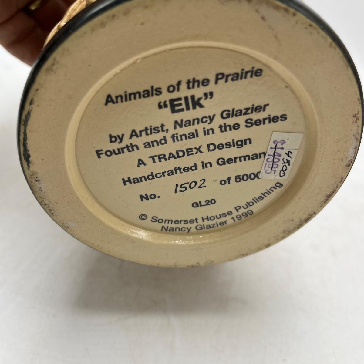 Lot includes two Animals of the Prairies series steins titled Mule Deer and Elk both by artist Nancy Glazier. Steins measure 4” x 6” x 10”.