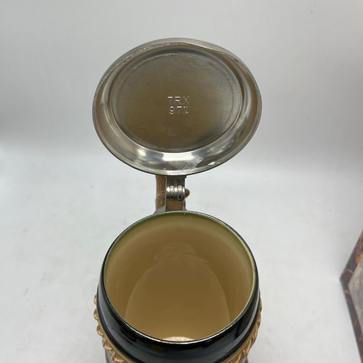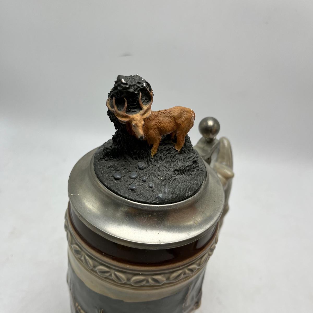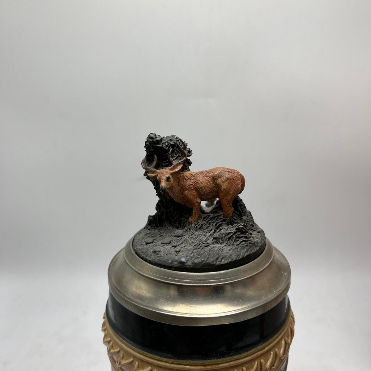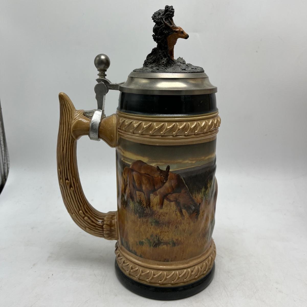 Lot includes two Animals of the Prairies series steins titled Mule Deer and Elk both by artist Nancy Glazier. Steins measure 4” x 6” x 10”.