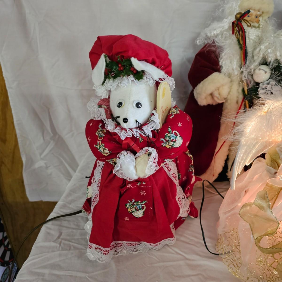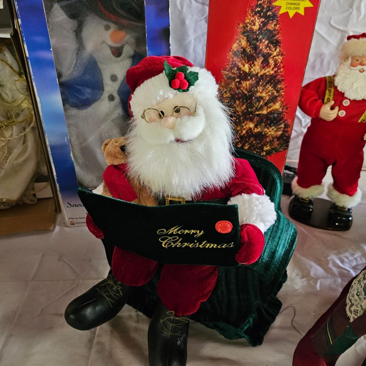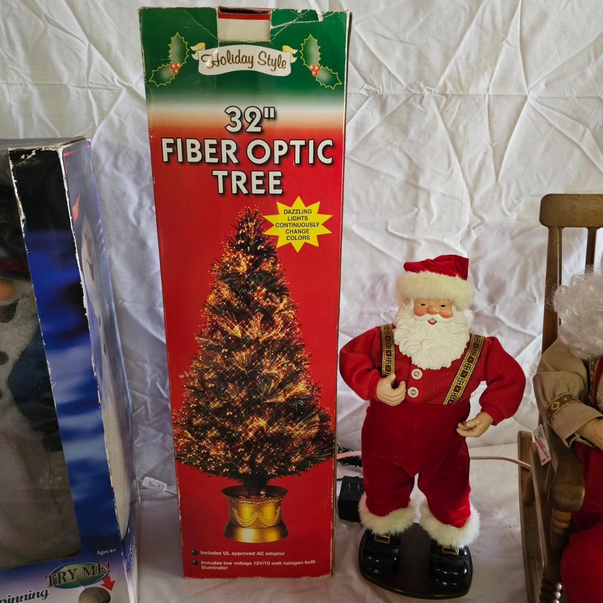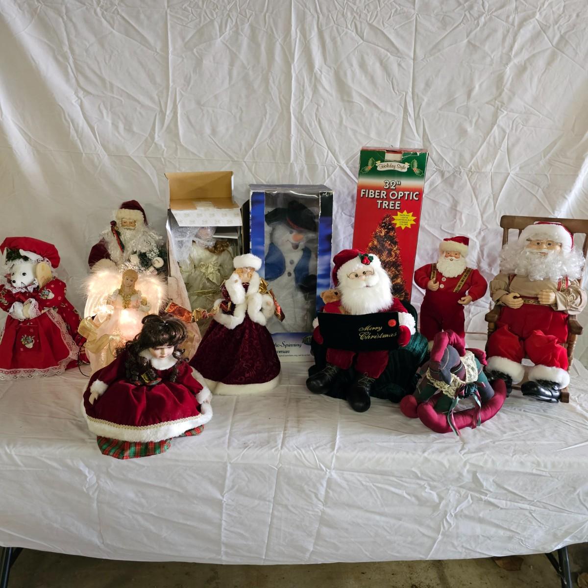 A collection of 12 pieces, some animated and others not. 32" fiber optic tree, powered on. Fiber optic angel tree topper, powered on. Rocking chair Santa, 9"x 15"x 19" h, powered on. Table sitters and dolls. See photos for details. Storage tub included. Shipping available.