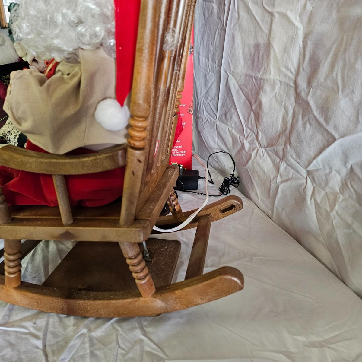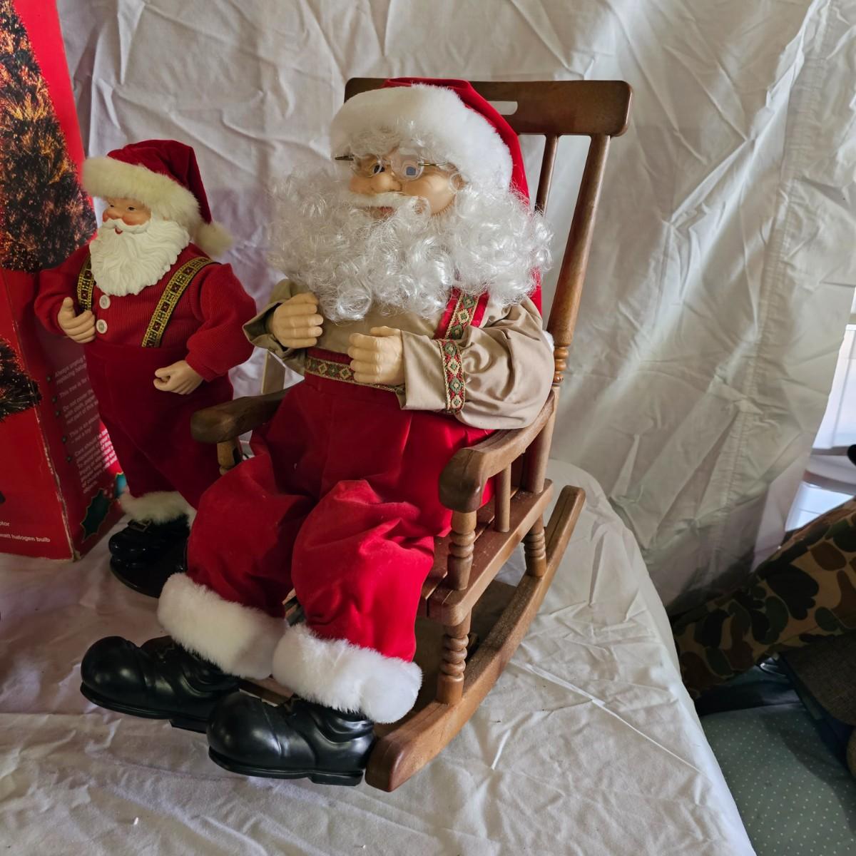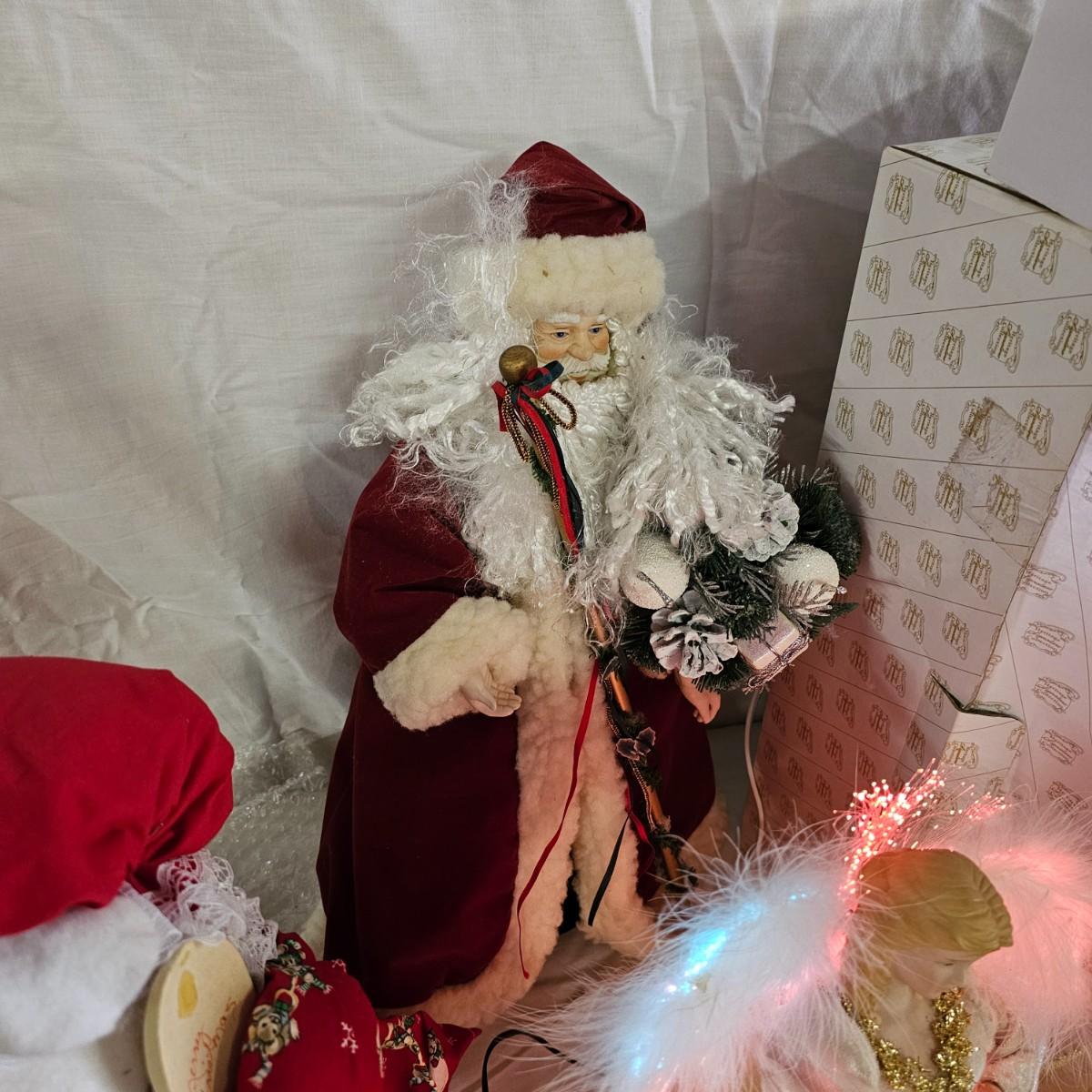 A collection of 12 pieces, some animated and others not. 32" fiber optic tree, powered on. Fiber optic angel tree topper, powered on. Rocking chair Santa, 9"x 15"x 19" h, powered on. Table sitters and dolls. See photos for details. Storage tub included. Shipping available.
