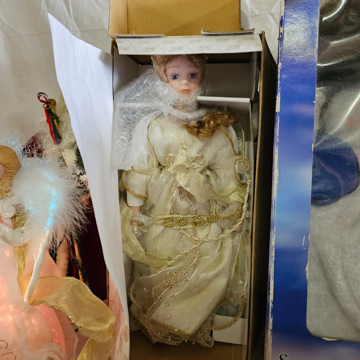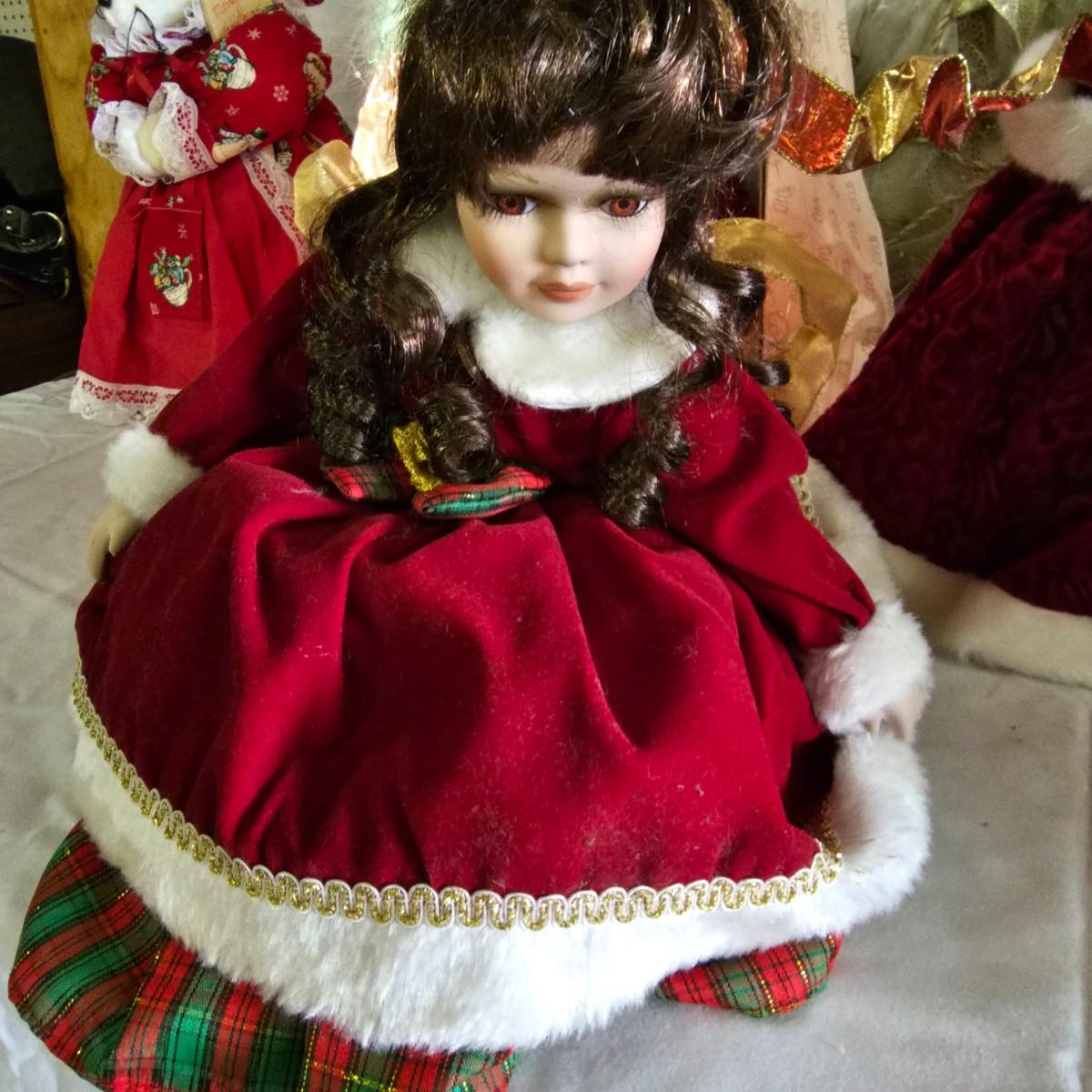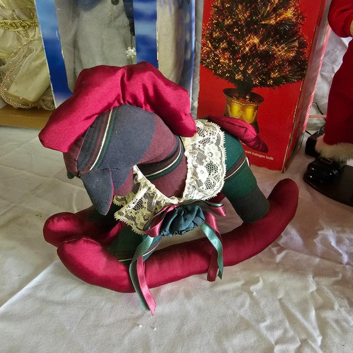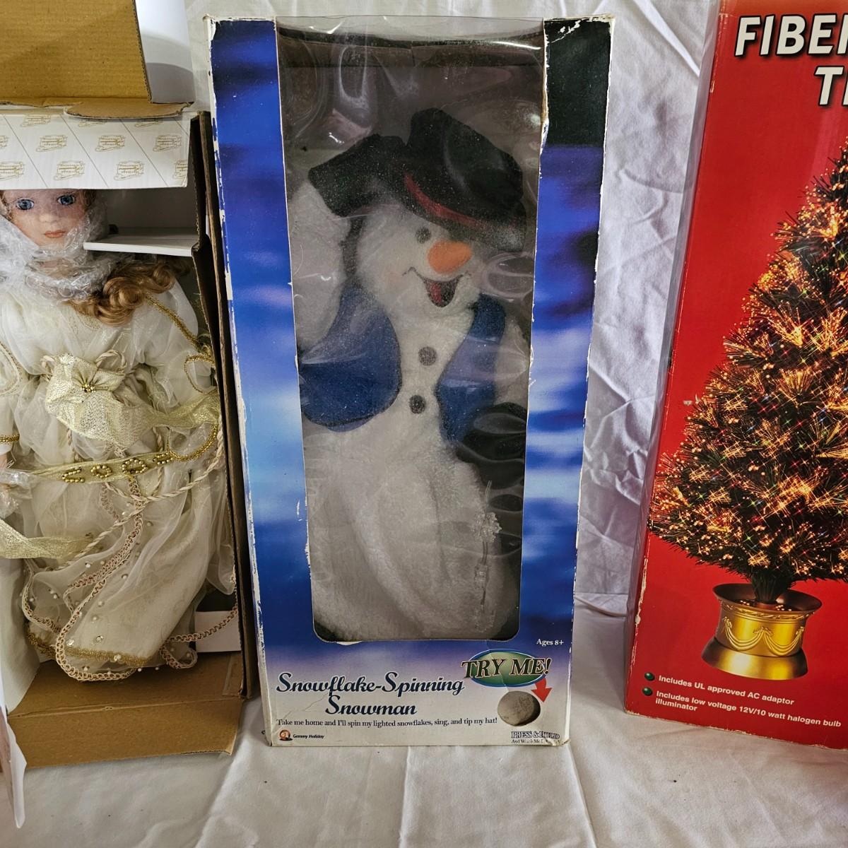 A collection of 12 pieces, some animated and others not. 32" fiber optic tree, powered on. Fiber optic angel tree topper, powered on. Rocking chair Santa, 9"x 15"x 19" h, powered on. Table sitters and dolls. See photos for details. Storage tub included. Shipping available.