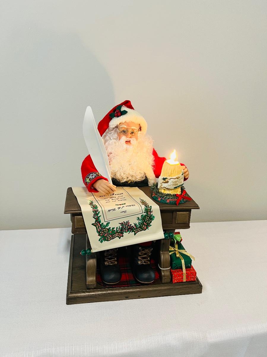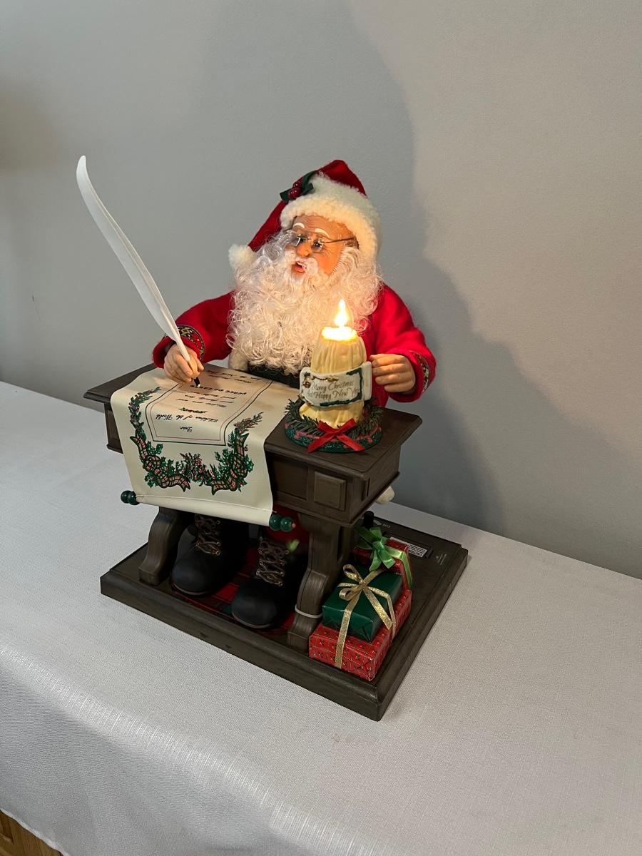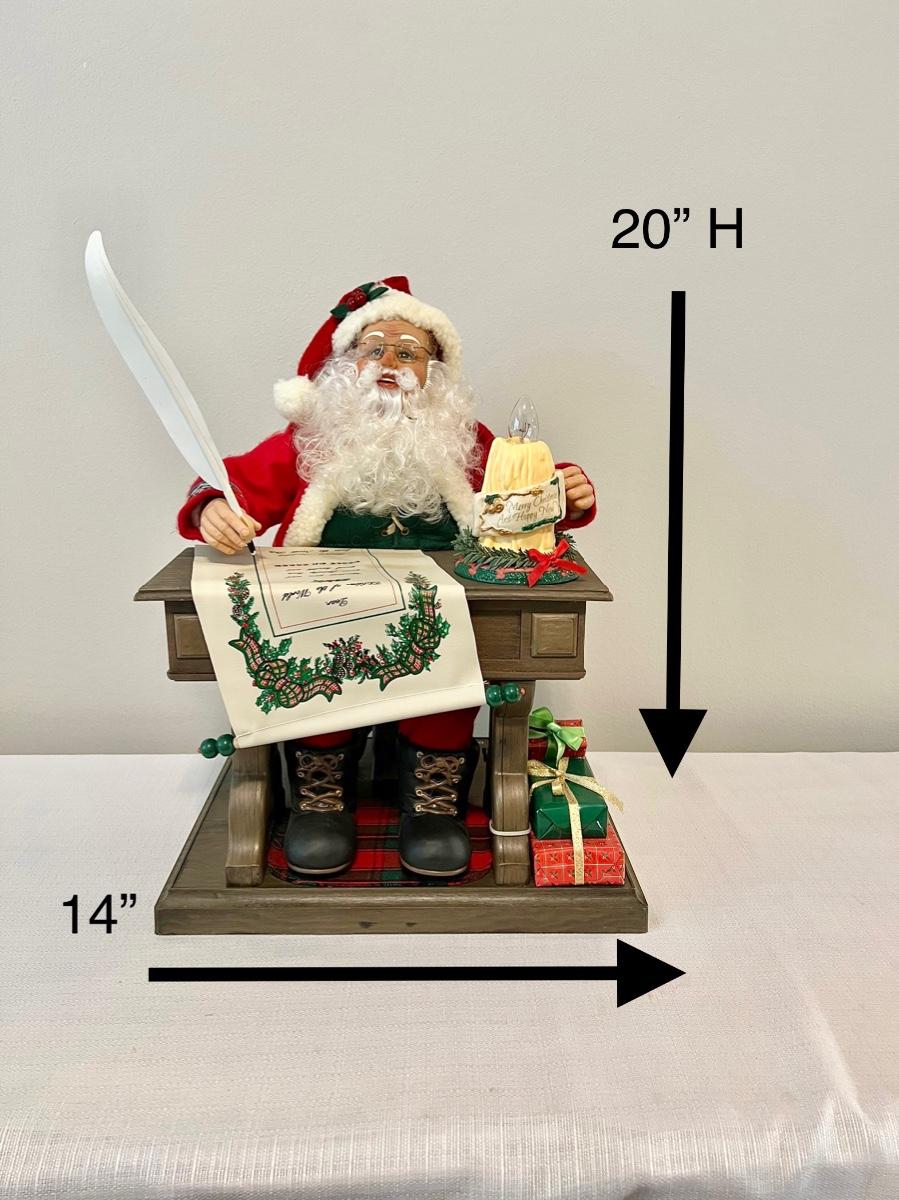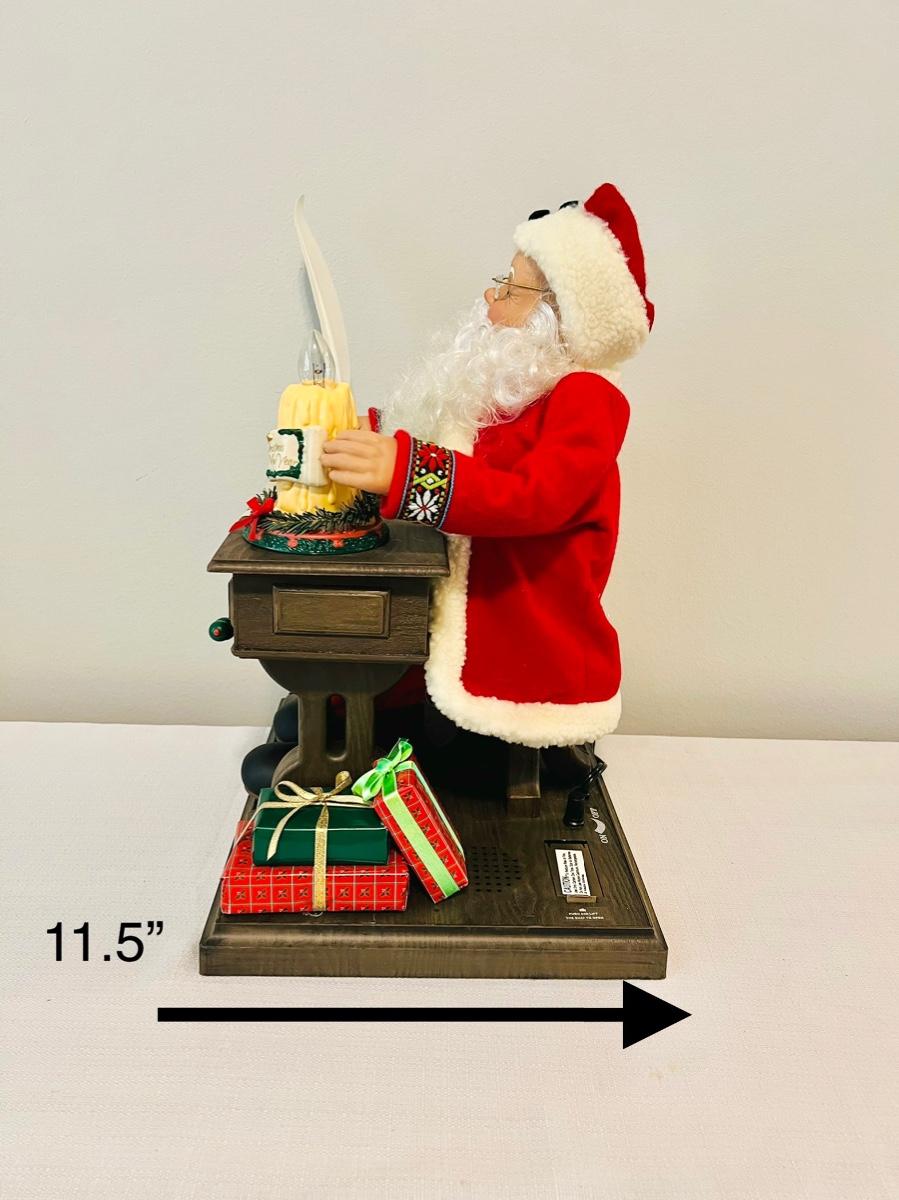 This adorable writing Santa works. He’s moving while writing letters, the candle lights up and it plays music. You can turn the music low or high. For dimensions see pictures.