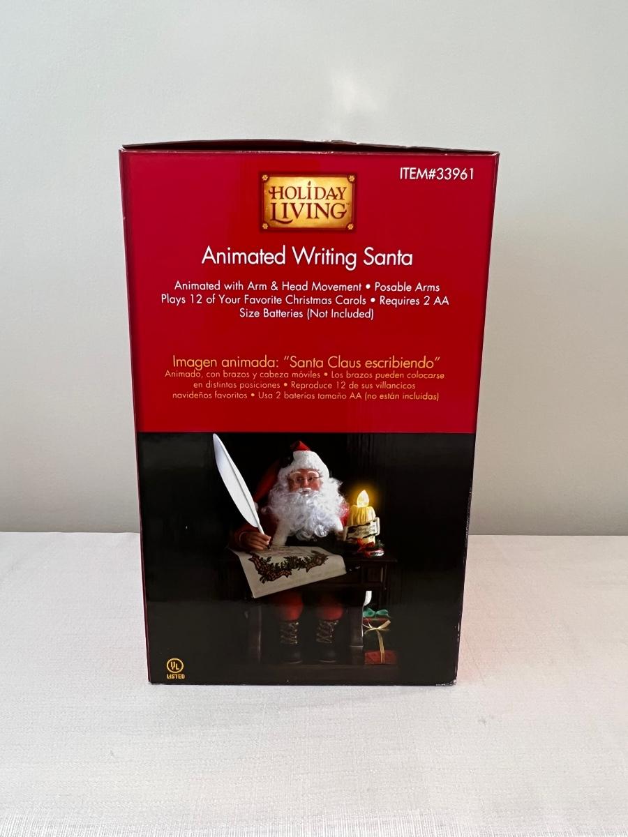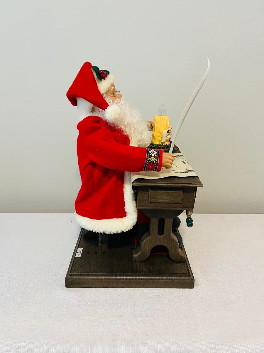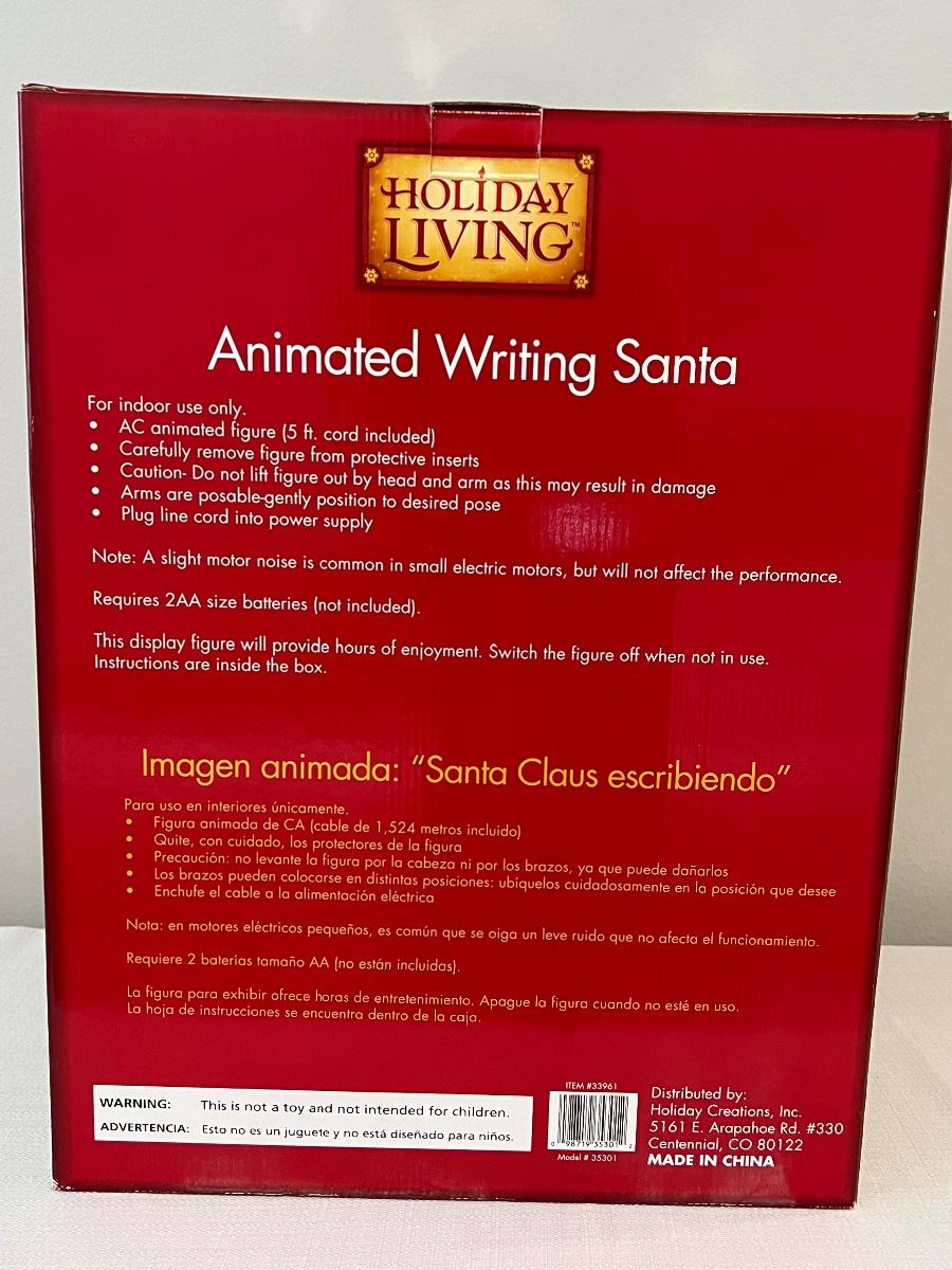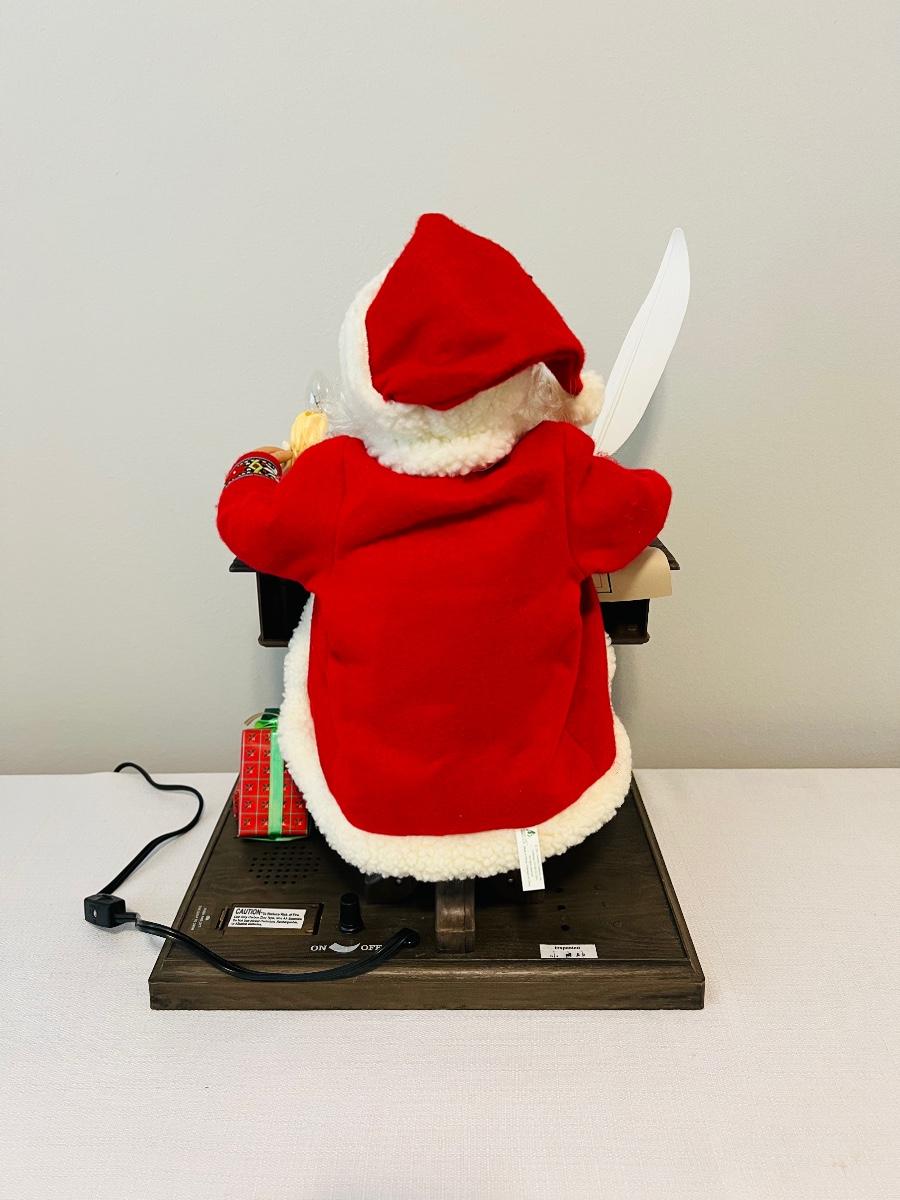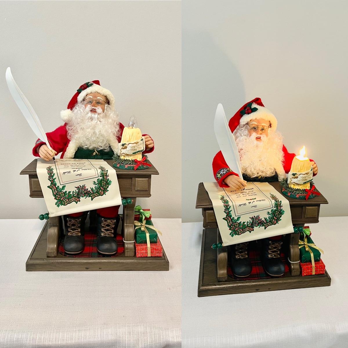 This adorable writing Santa works. He’s moving while writing letters, the candle lights up and it plays music. You can turn the music low or high. For dimensions see pictures.