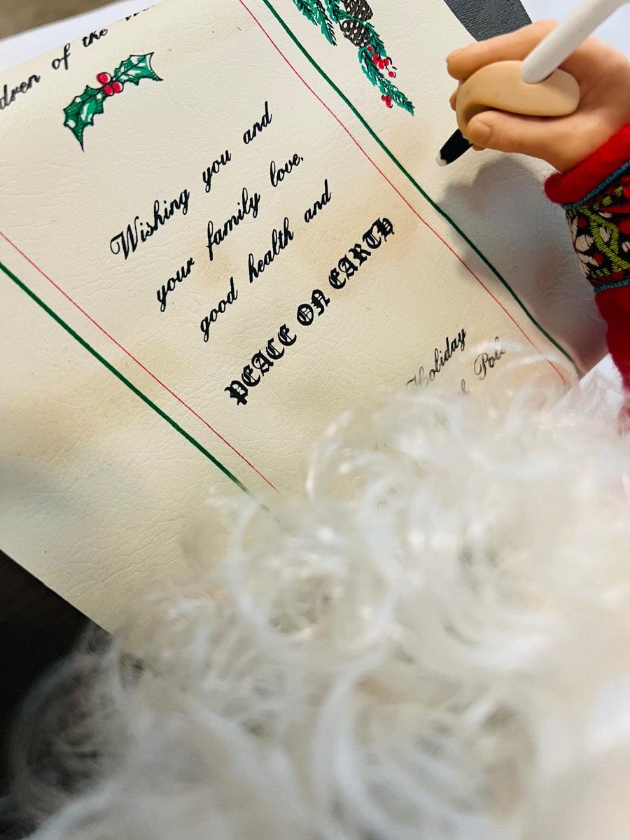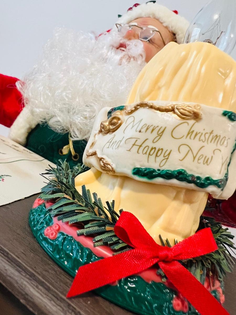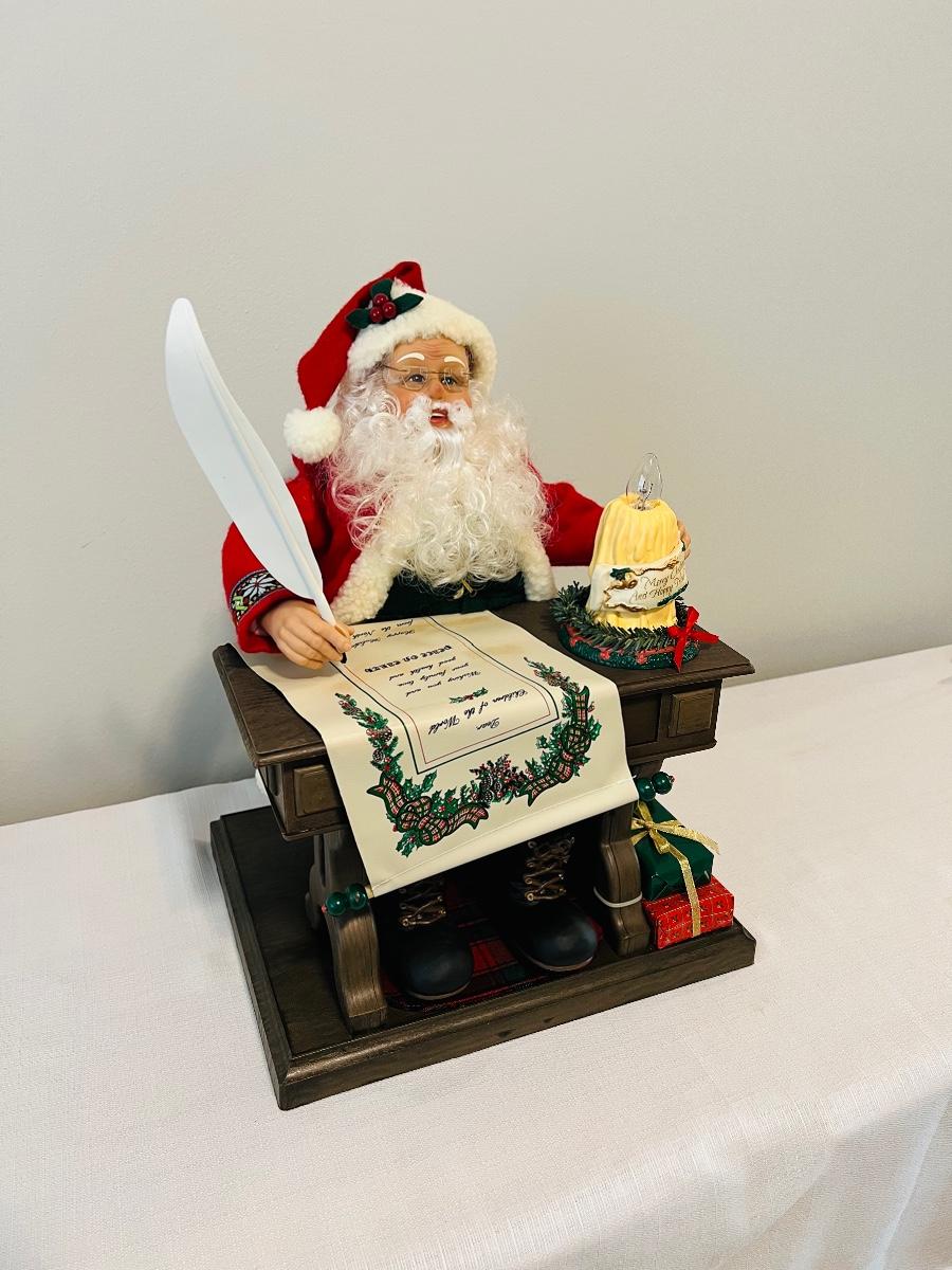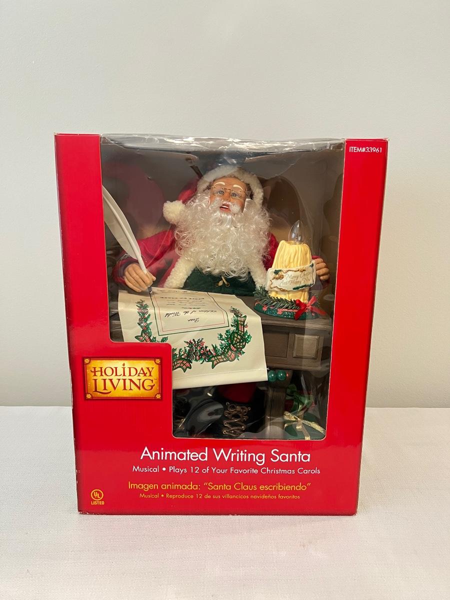 This adorable writing Santa works. He’s moving while writing letters, the candle lights up and it plays music. You can turn the music low or high. For dimensions see pictures.