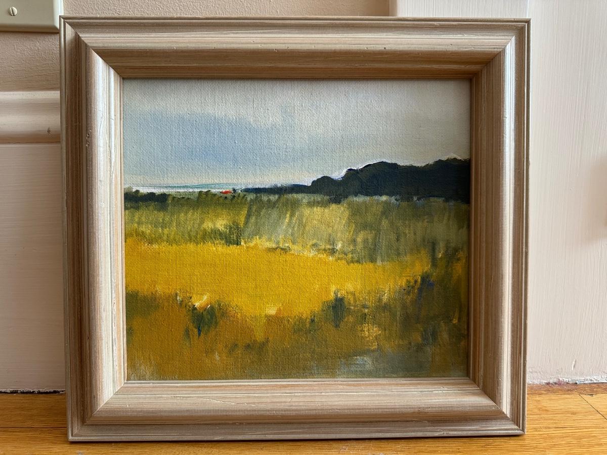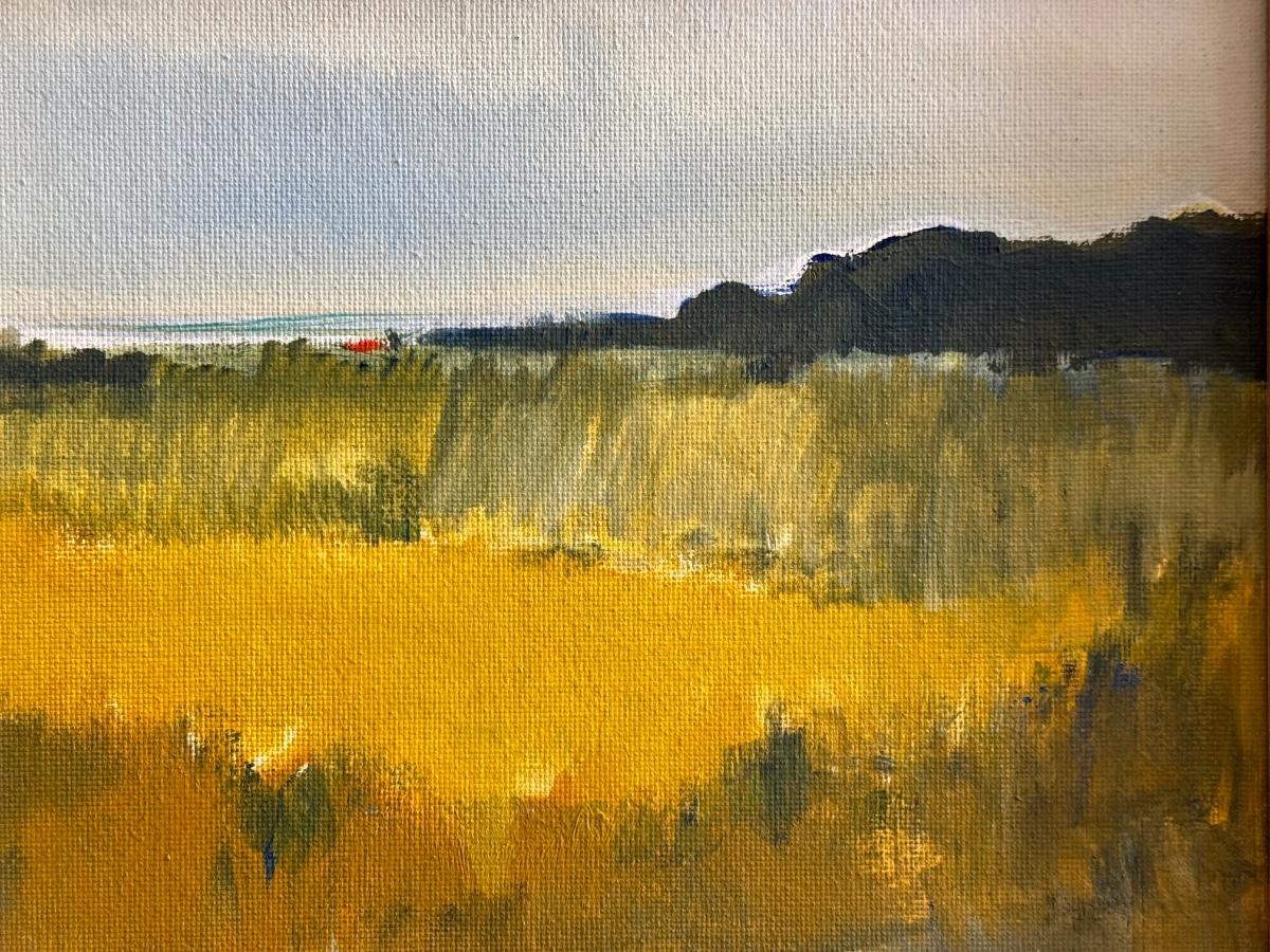 Anita Simpson, field in ochre, landscape, framed oil on canvas, signed, 1992, 15” W x15.5” T