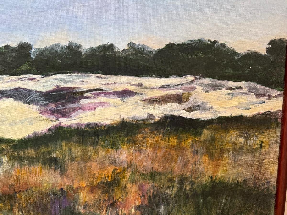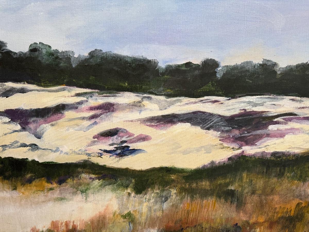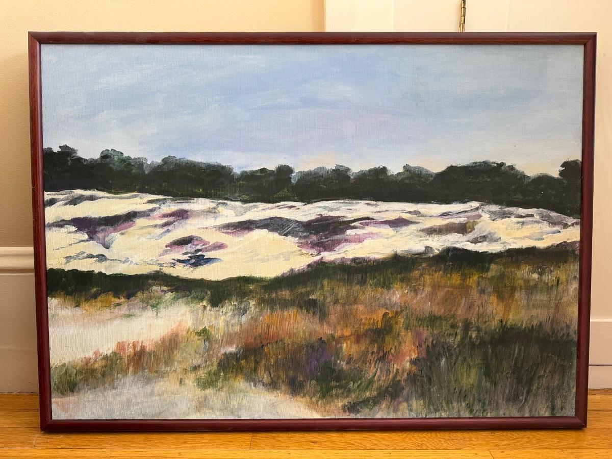 Anita Simpson, framed oil on canvas, impressionistic landscape, dunes, 35” W x 25” T