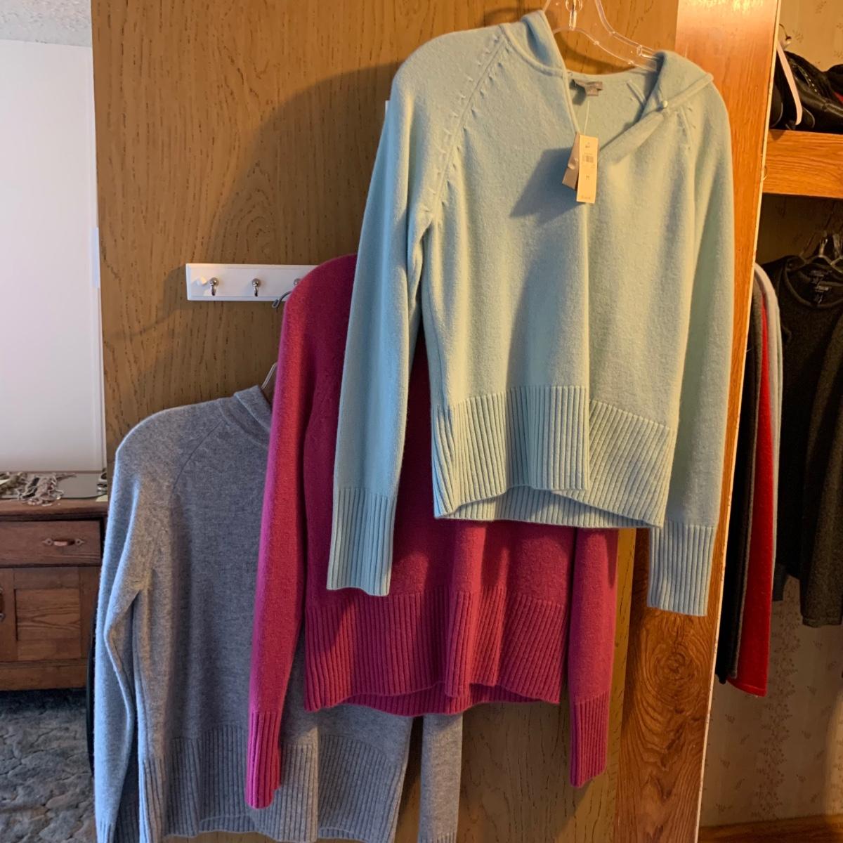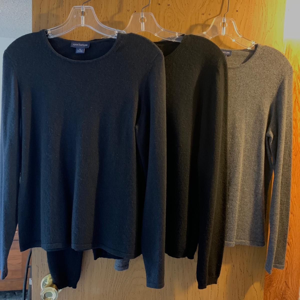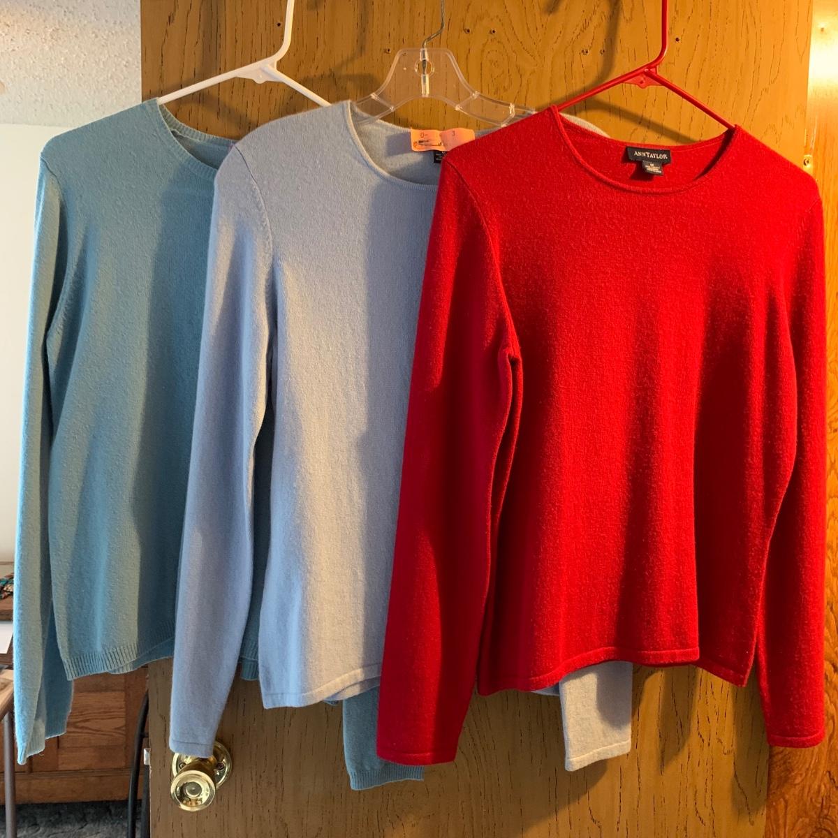 Seventeen luxurious 100% cashmere women’s tops, all Ann Taylor. All are size M. The collection includes three sweater/shirt sets, one sleeveless top, one cardigan, three hooded sweaters, and six crew-neck sweaters. All items are in very good condition, with st least one being brand new with its tags still attached. Shipping available.
