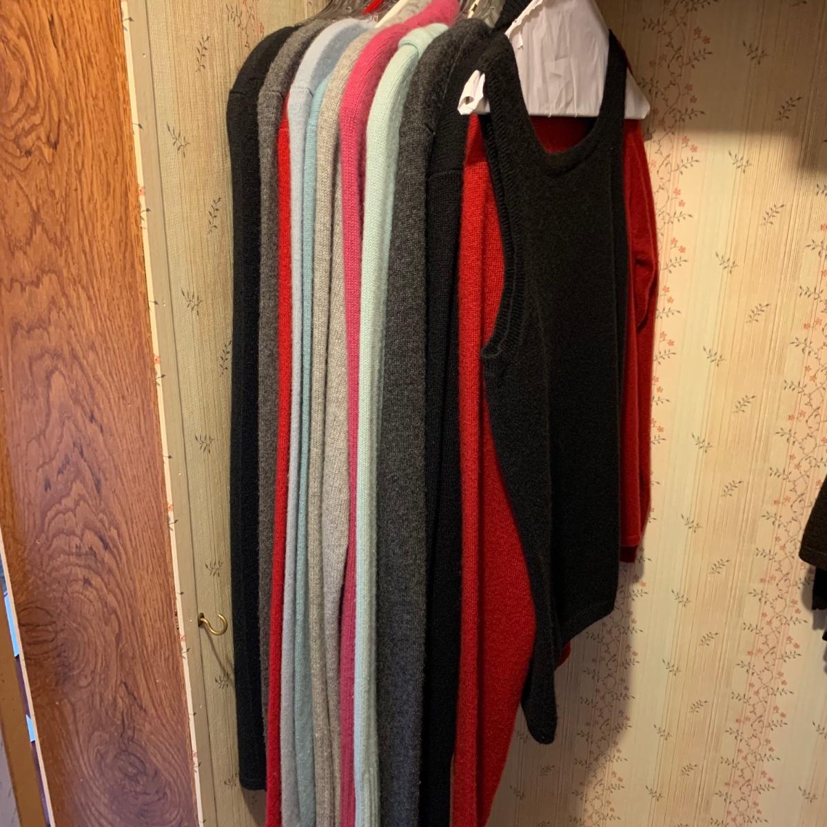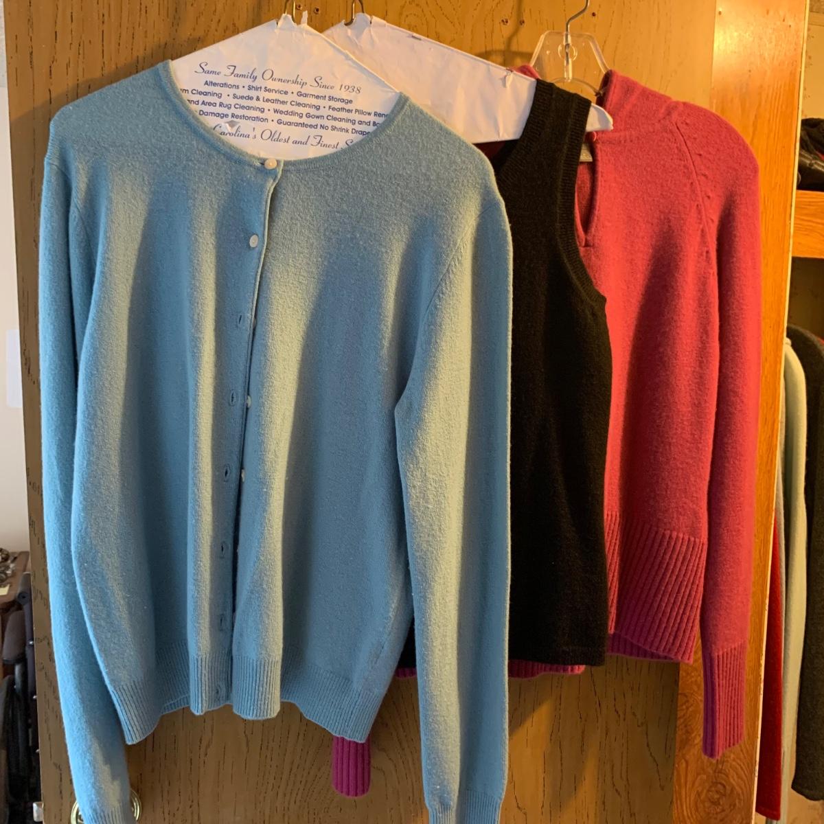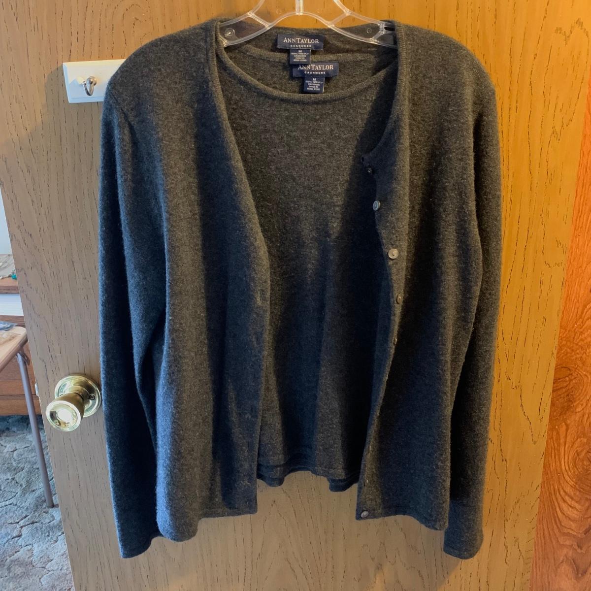 Seventeen luxurious 100% cashmere women’s tops, all Ann Taylor. All are size M. The collection includes three sweater/shirt sets, one sleeveless top, one cardigan, three hooded sweaters, and six crew-neck sweaters. All items are in very good condition, with st least one being brand new with its tags still attached. Shipping available.