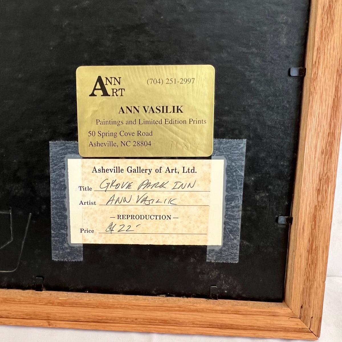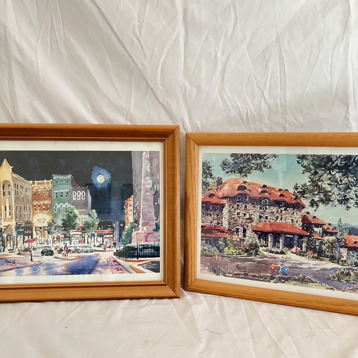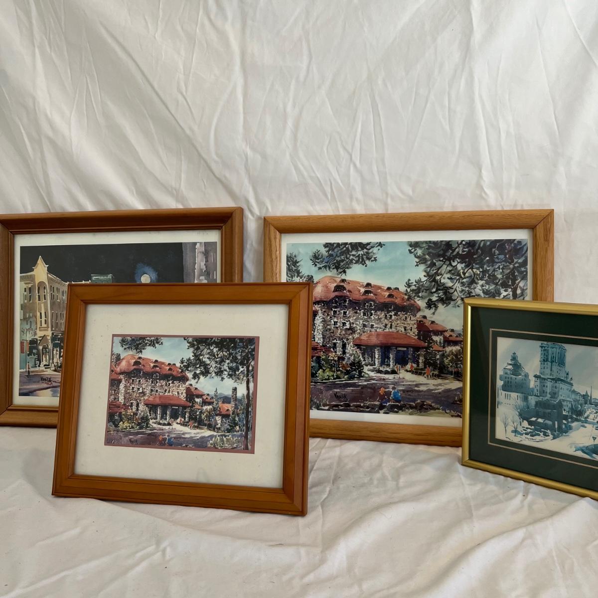 Four framed prints includes Moonlight over Asheville, two prints of Grove Park Inn plus College & Church. All are under glass with three framed in wood like resin frames and the smallest print is in a gold plastic frame; two smallest are matted also. The Moonlight over Asheville has a few light mildew-like stains on the border, see image; this frame is the largest and measures 16” x 1” x 13”.