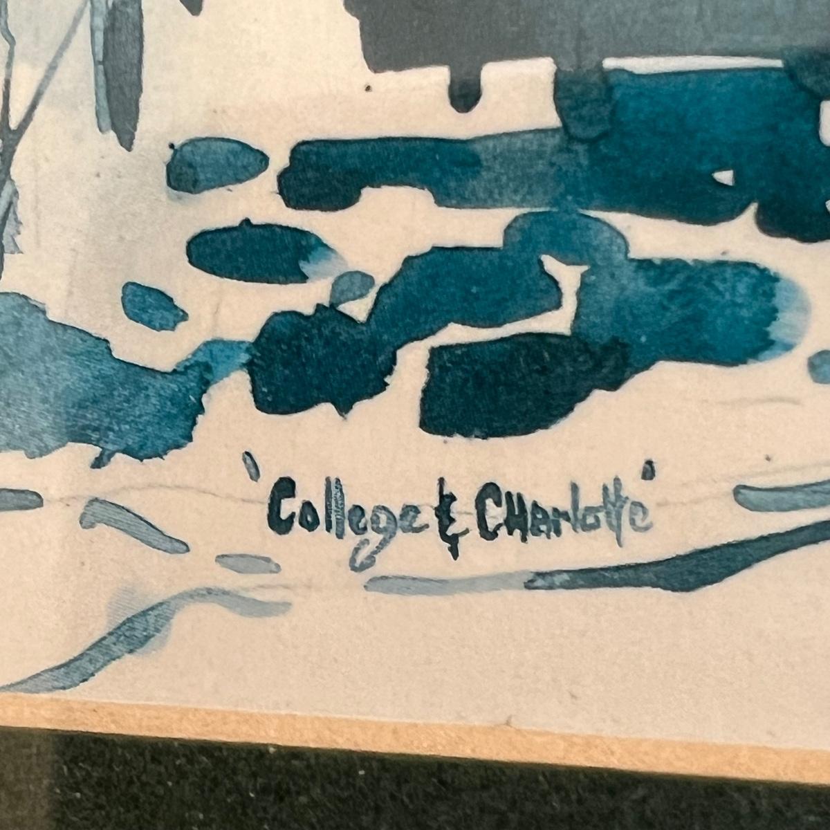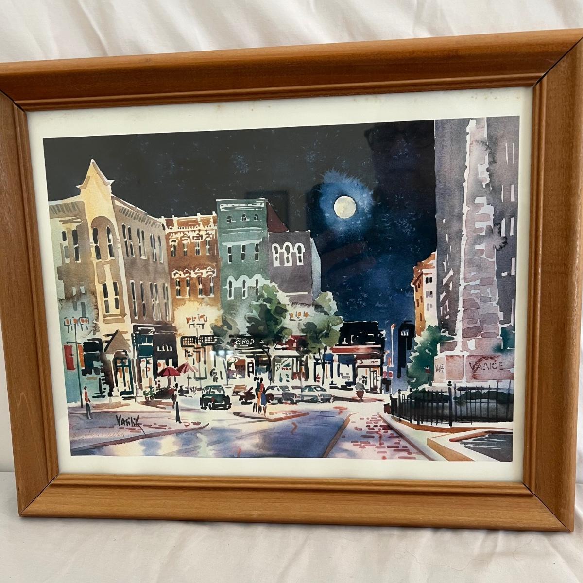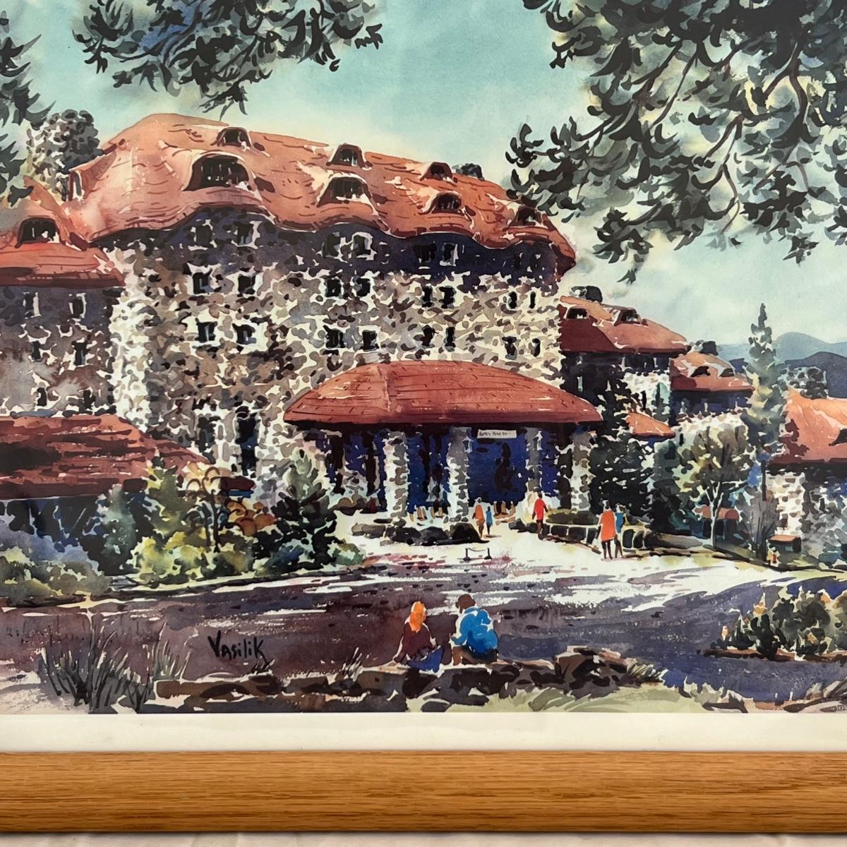 Four framed prints includes Moonlight over Asheville, two prints of Grove Park Inn plus College & Church. All are under glass with three framed in wood like resin frames and the smallest print is in a gold plastic frame; two smallest are matted also. The Moonlight over Asheville has a few light mildew-like stains on the border, see image; this frame is the largest and measures 16” x 1” x 13”.