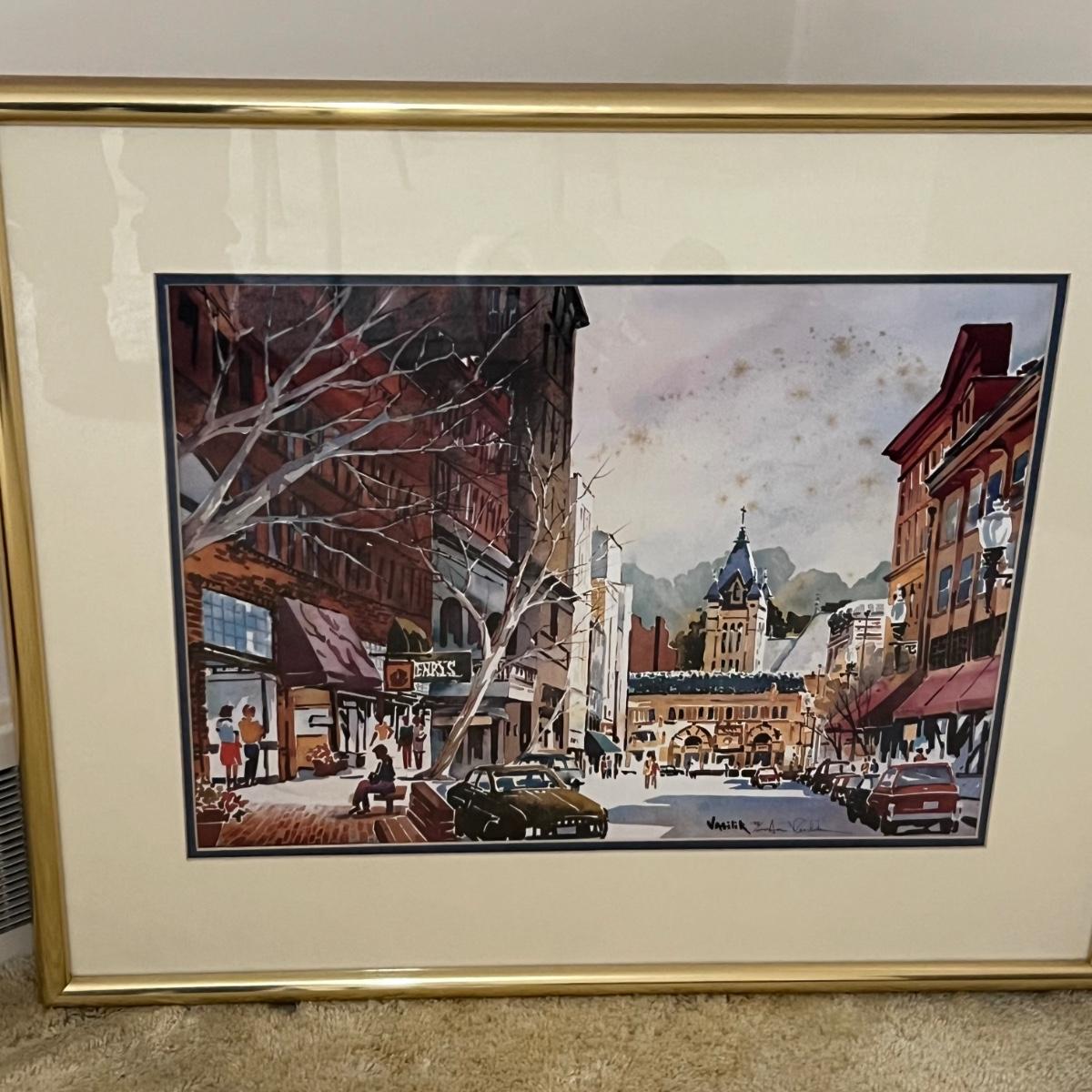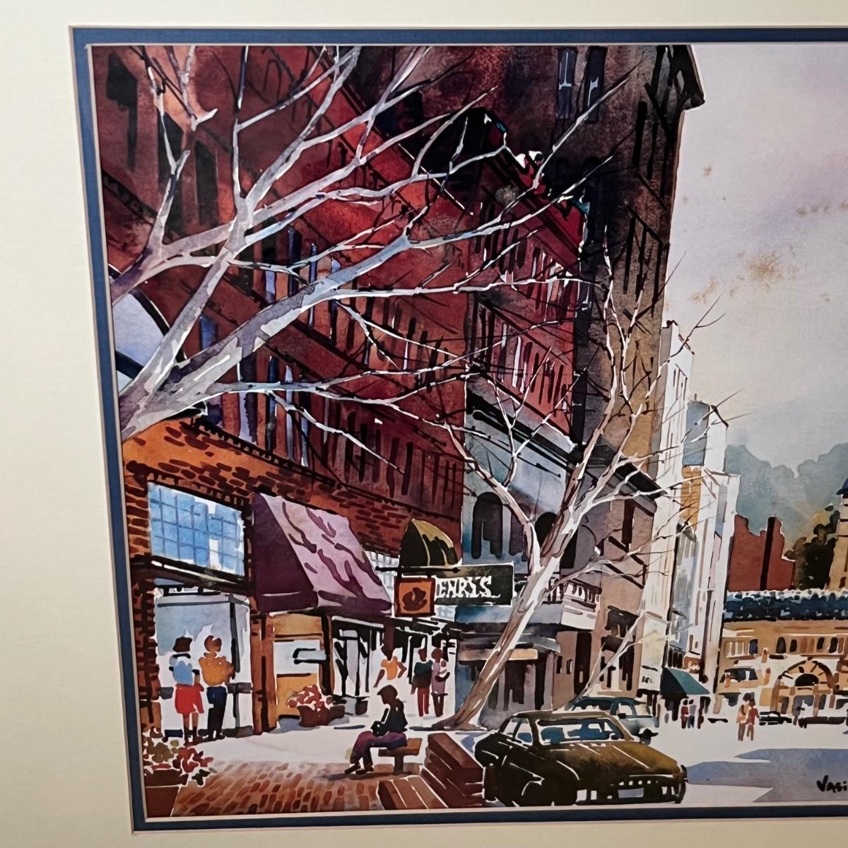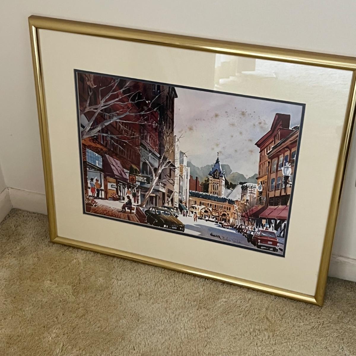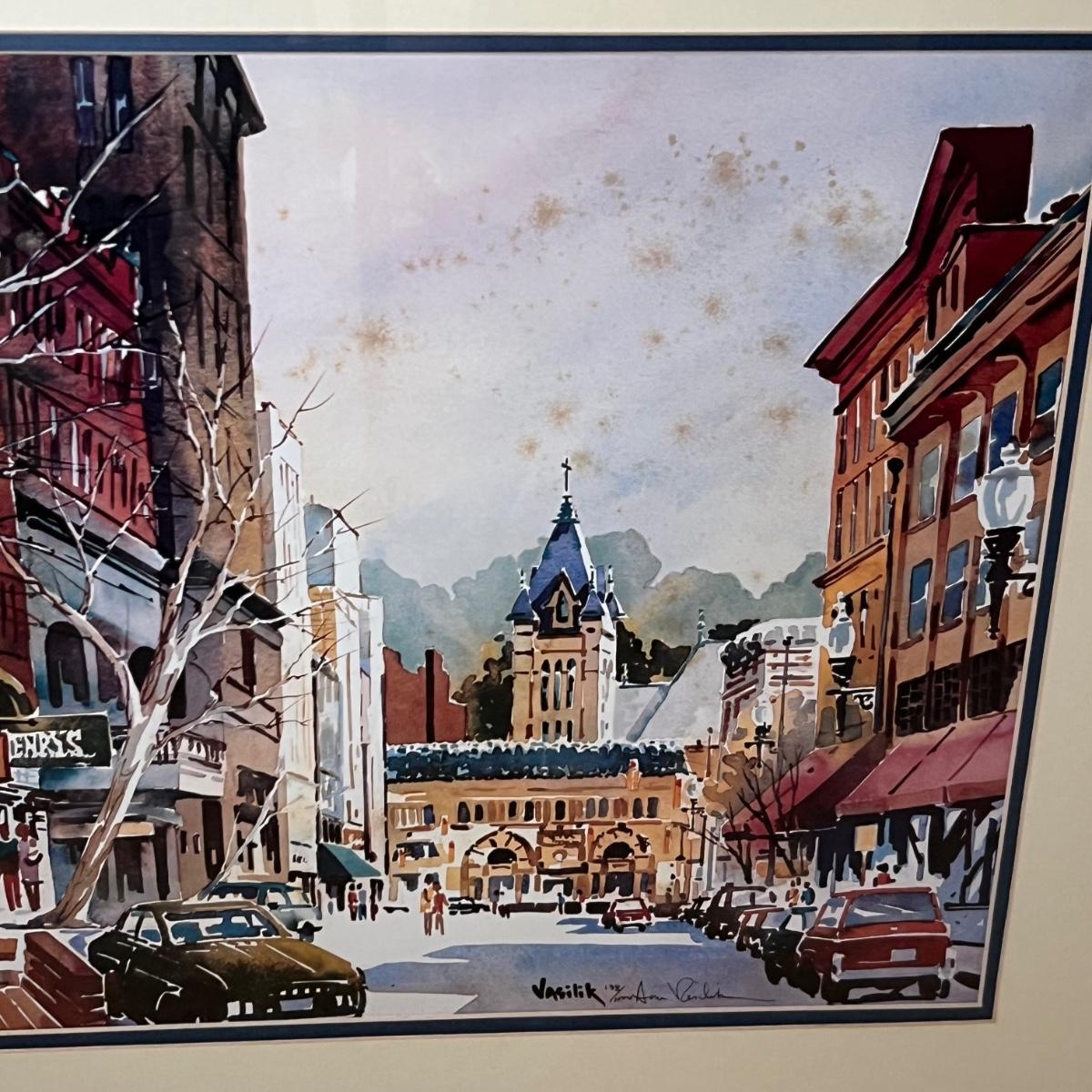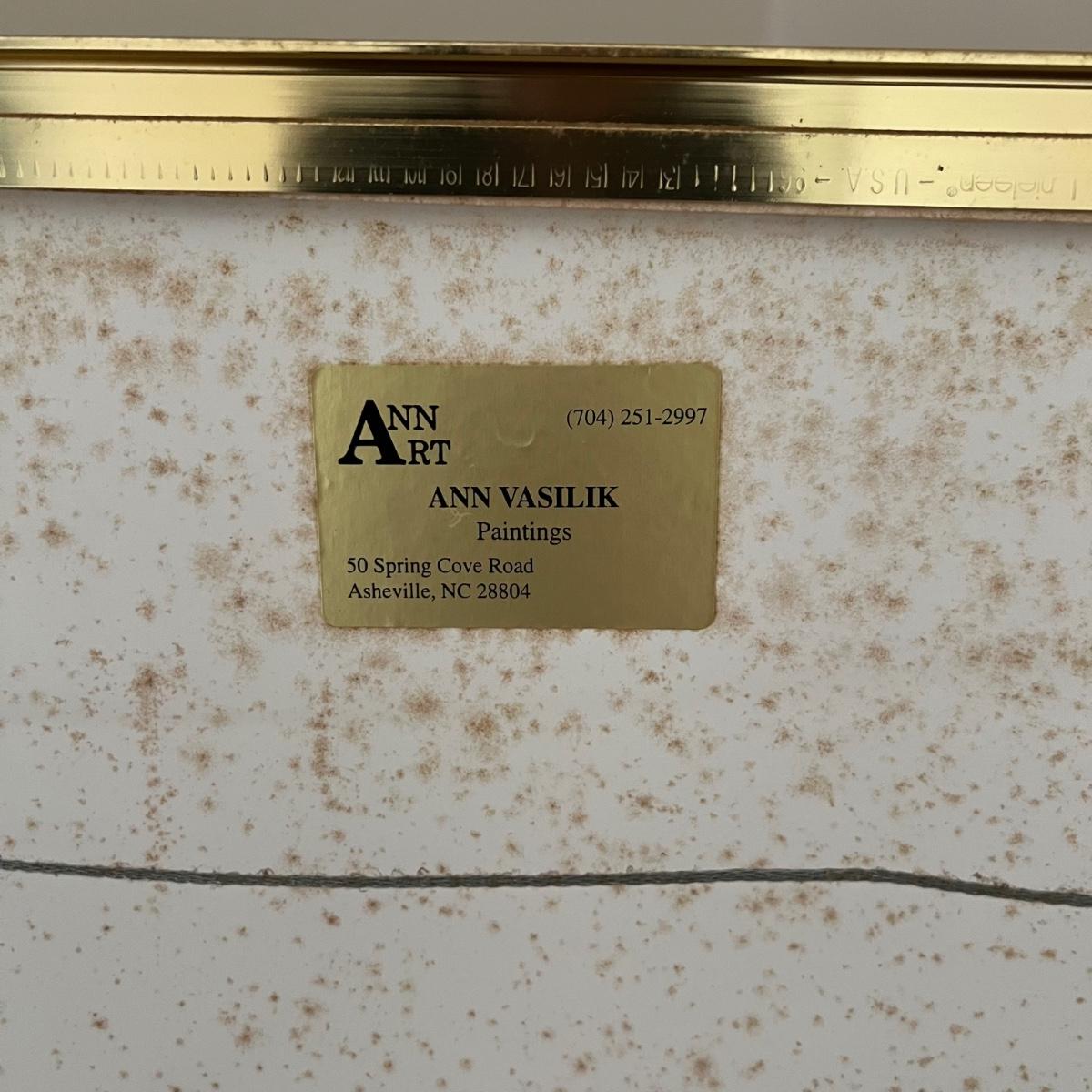 Number 138/1000 this Ann Vasilik print appears to be pen signed and of her Haywood Street - Asheville, scene but there is no title on the print. Under glass, matted and mounted in a gold metal frame that measures 24” x 28”. Note that the discoloration in the sky appears to be stains; as the print is under glass we cannot determine if the marks are on the glass or the print.