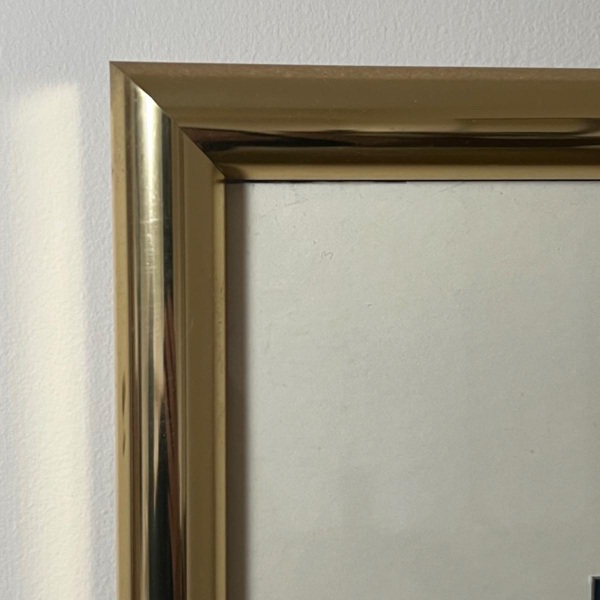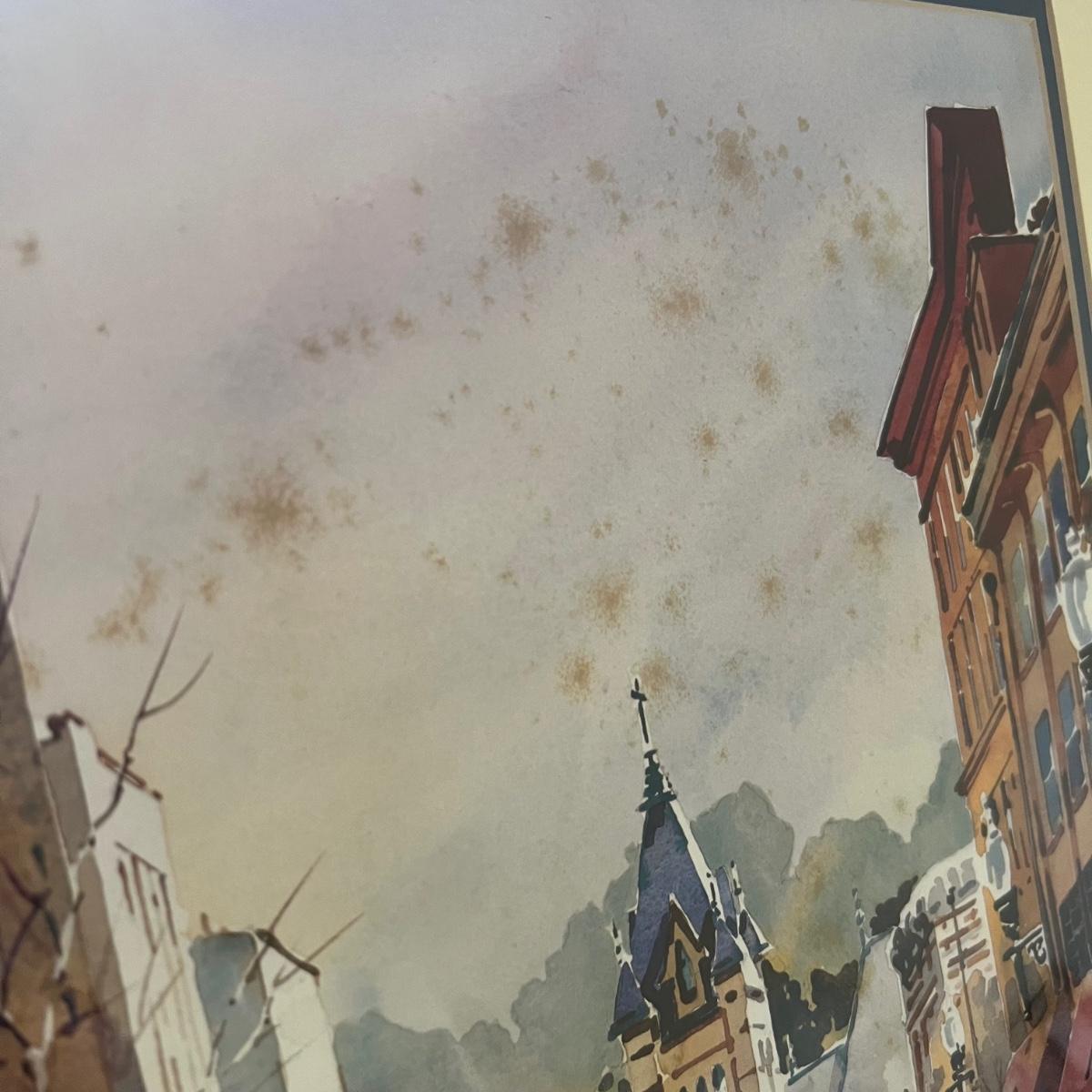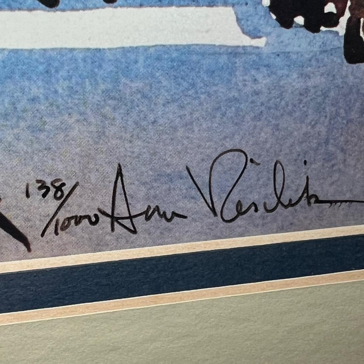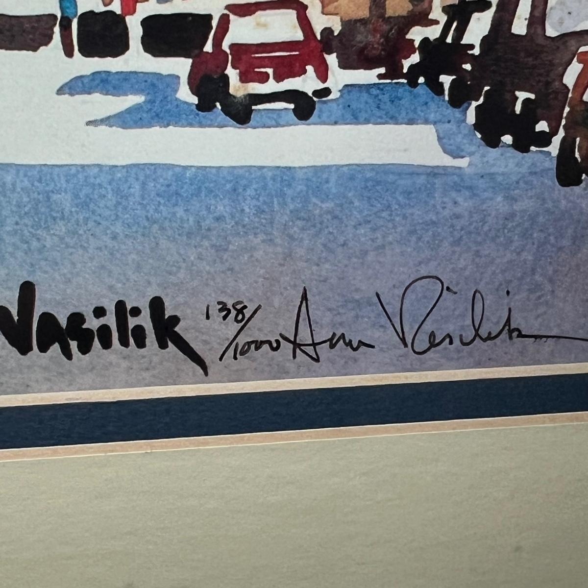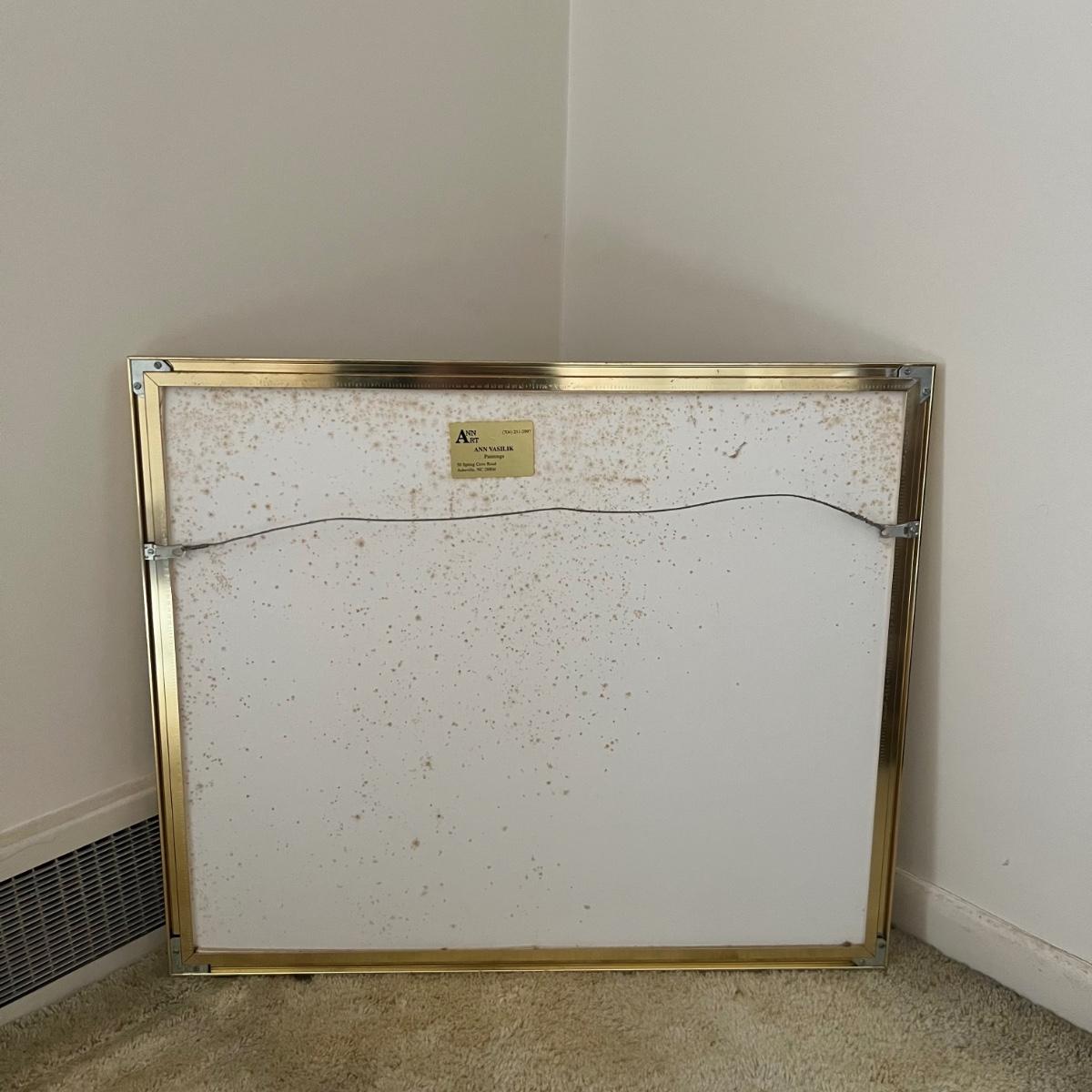 Number 138/1000 this Ann Vasilik print appears to be pen signed and of her Haywood Street - Asheville, scene but there is no title on the print. Under glass, matted and mounted in a gold metal frame that measures 24” x 28”. Note that the discoloration in the sky appears to be stains; as the print is under glass we cannot determine if the marks are on the glass or the print.