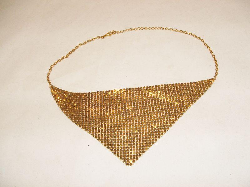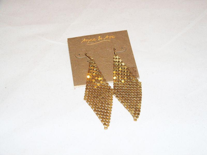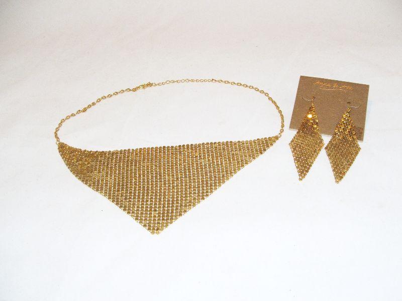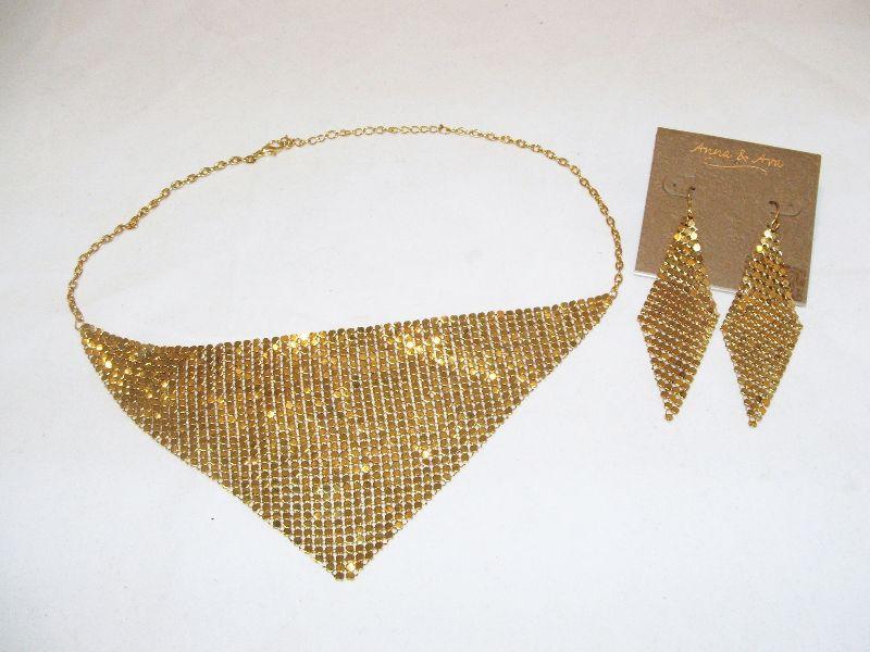 Gorgeous gold colored mesh/chain mail bib necklace, from Anna & Ava, with matching 3 1/2 " dangle earrings. Necklace is approx. 20 " from end to end, These pieces are in good condition and have never been worn. Retail was $40.00