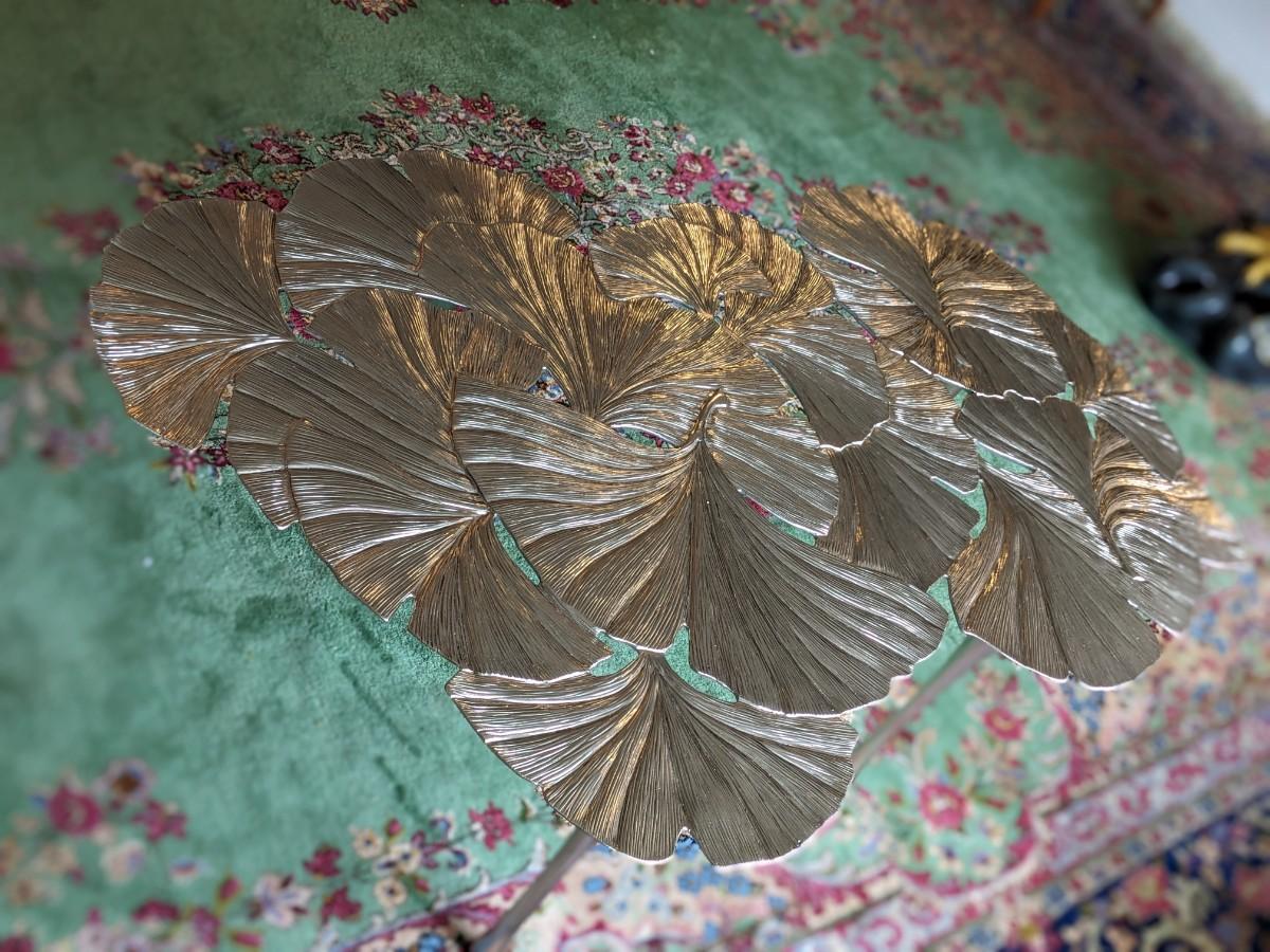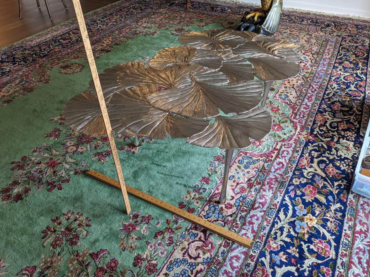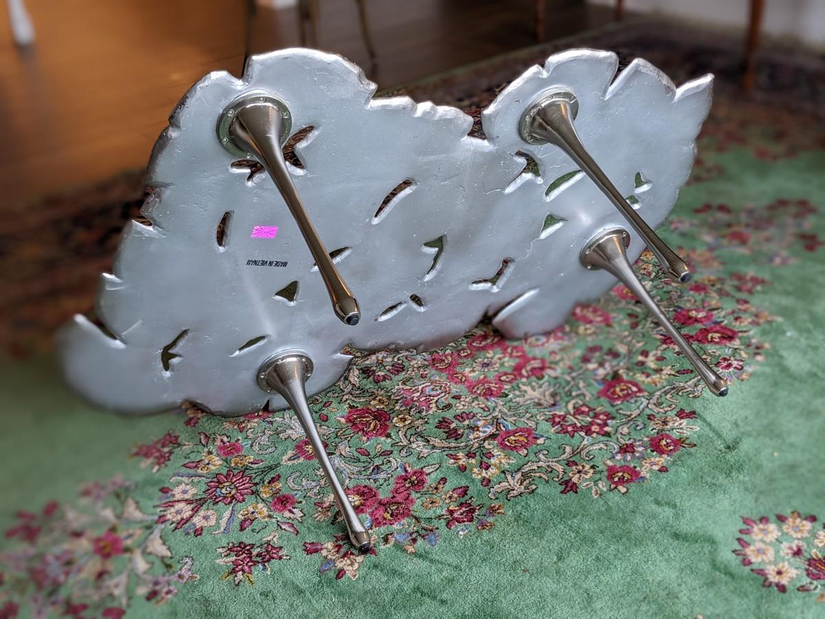 Inspired by ginkgo leaves, the Annabella cocktail table entices with its organic, sculptural design and subtle shine. Slim tapered legs with spade feet support the elegant tabletop, which resembles leaves floating on the waters surface. A satin nickel finish gives this cast aluminum table a soft luster, contributing to its delicate, feminine appeal.