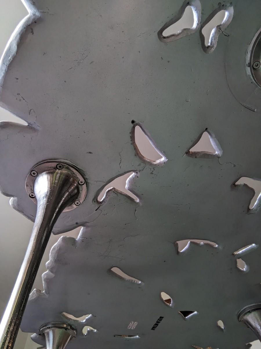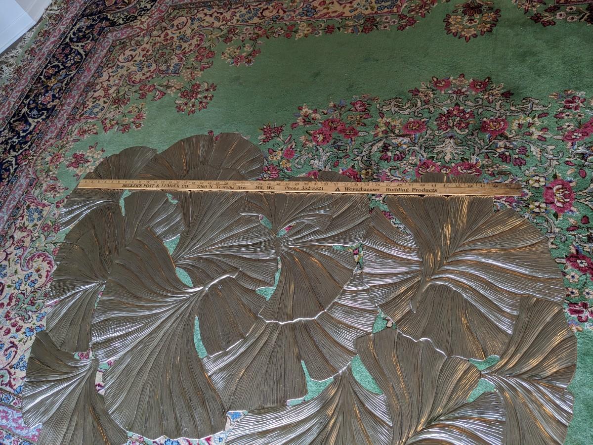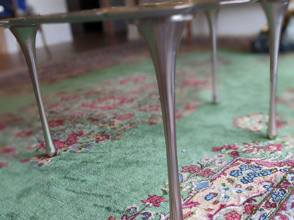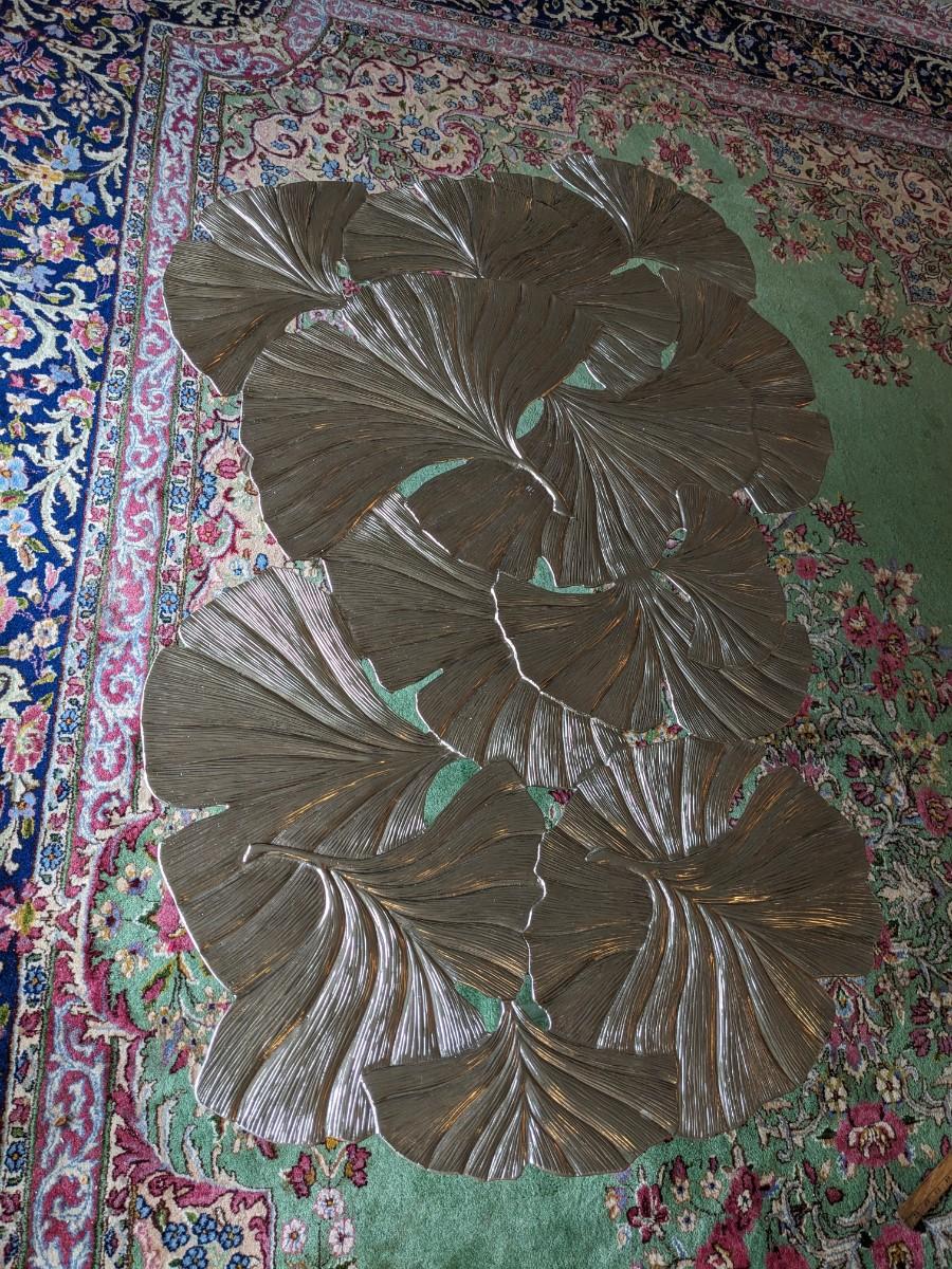 Inspired by ginkgo leaves, the Annabella cocktail table entices with its organic, sculptural design and subtle shine. Slim tapered legs with spade feet support the elegant tabletop, which resembles leaves floating on the waters surface. A satin nickel finish gives this cast aluminum table a soft luster, contributing to its delicate, feminine appeal.
