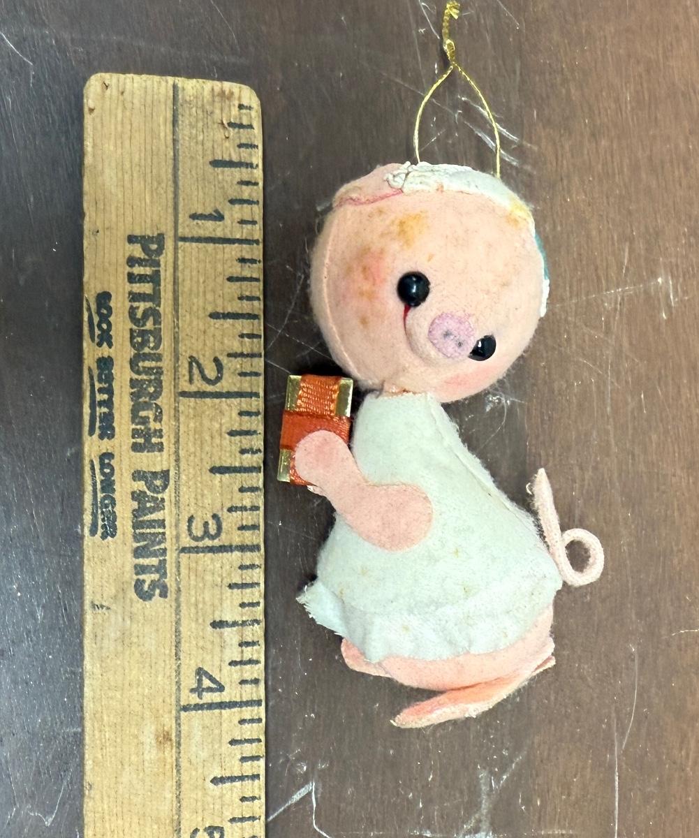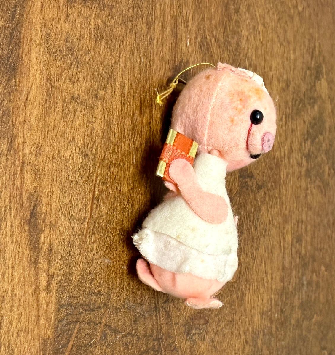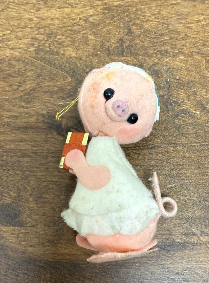 Analee-style pig ornament, likely vintage, featuring a round, pink face with black button eyes and a stitched snout. It has a white, layered dress with a pink patch on its arm and a curly tail. Approx. 4" tall, in good condition.