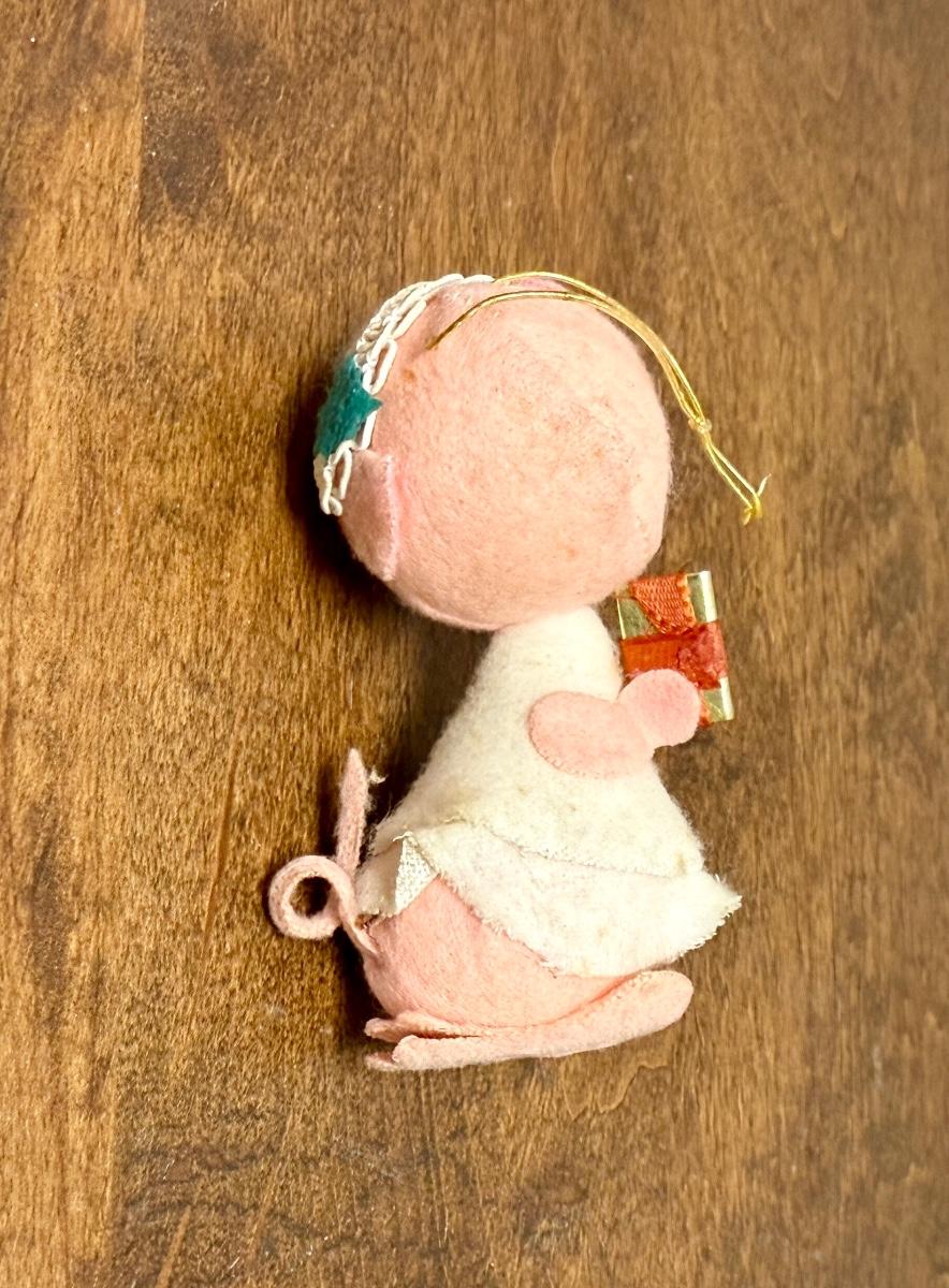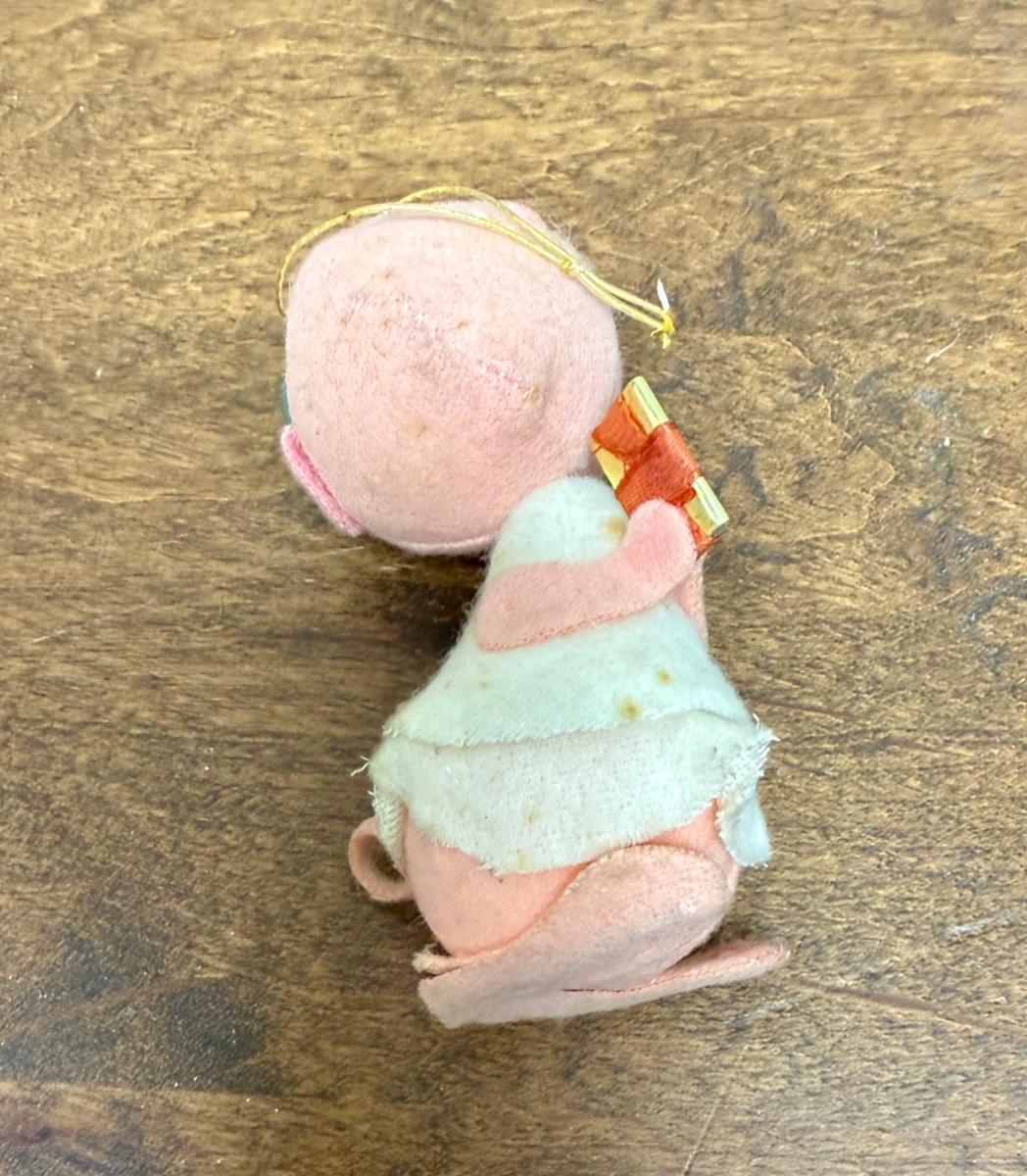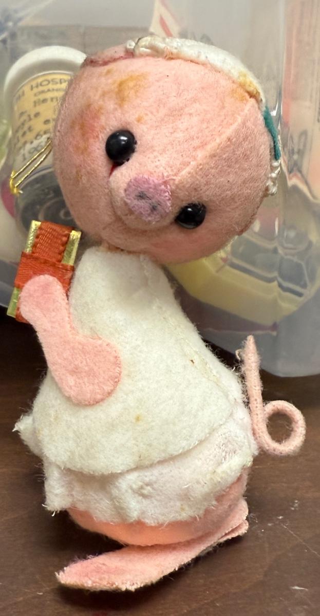 Analee-style pig ornament, likely vintage, featuring a round, pink face with black button eyes and a stitched snout. It has a white, layered dress with a pink patch on its arm and a curly tail. Approx. 4" tall, in good condition.
