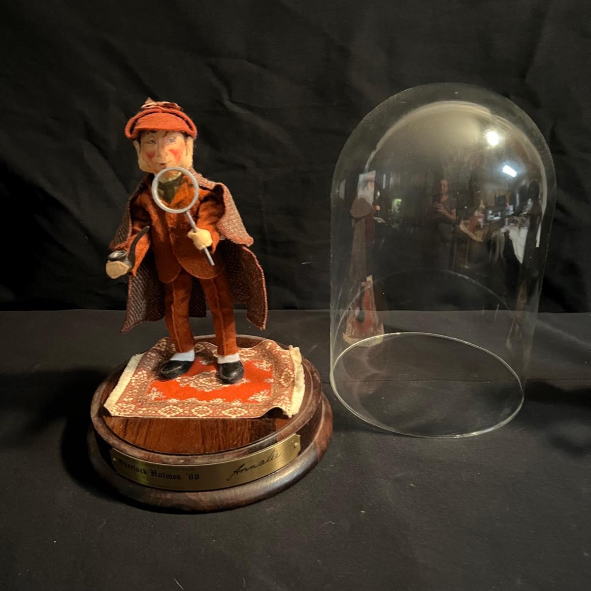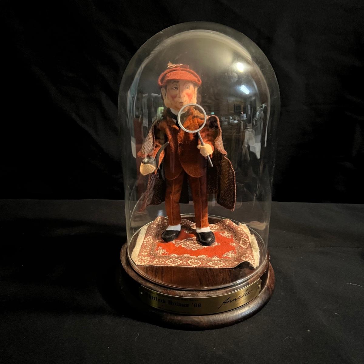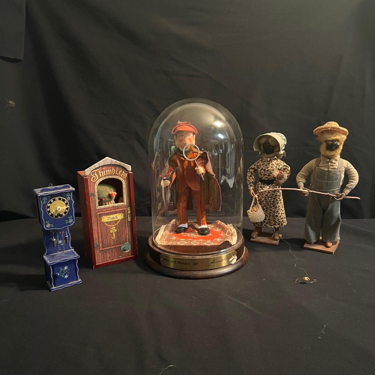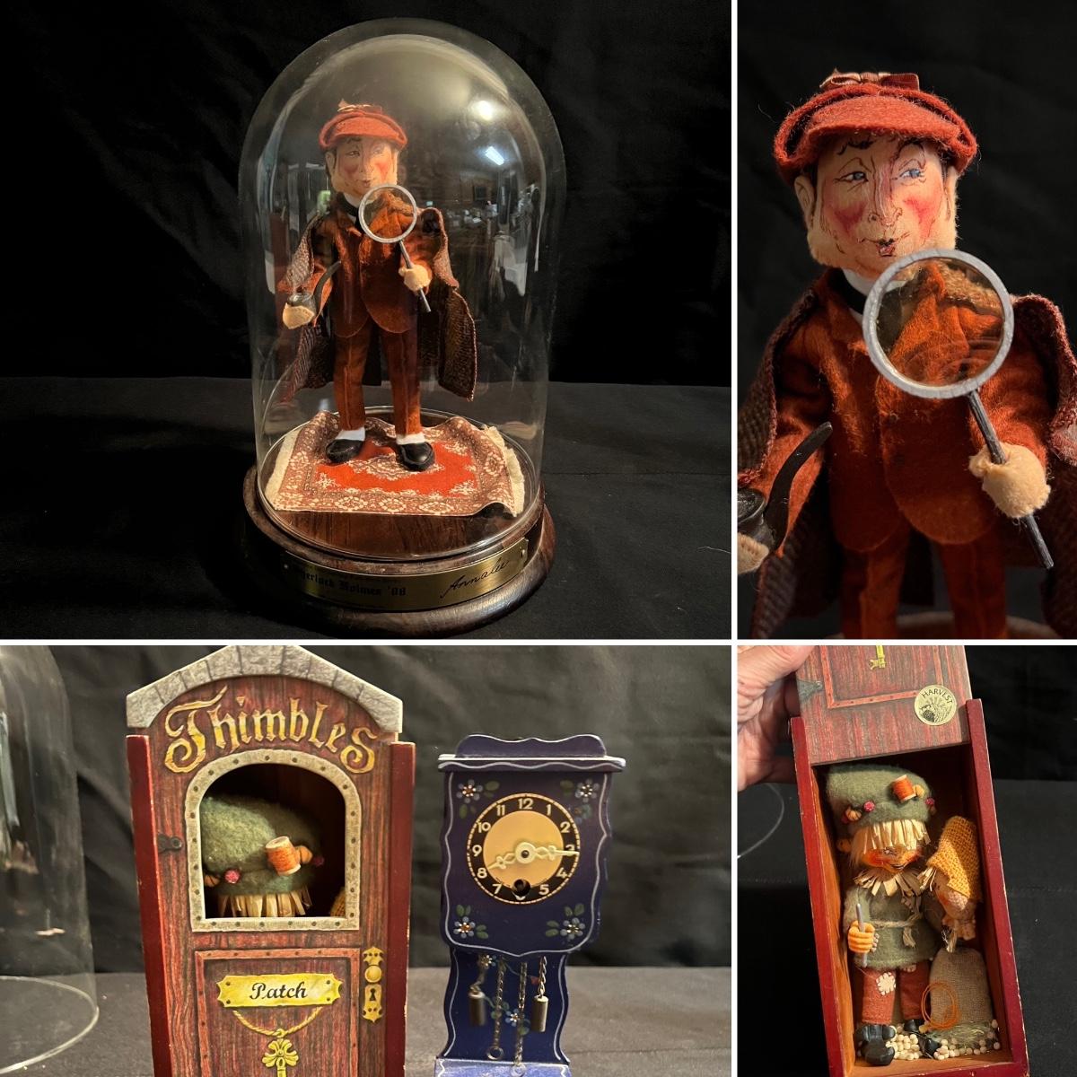 Of these five items, two are Annalee. The fisherman and lady have no marking and the blue clock with key (not tested) is marked Made in Germany. Largest item is Sherlock Holmes who is mounted on a wood base with glass dome, he measures 9”D x 14”H.