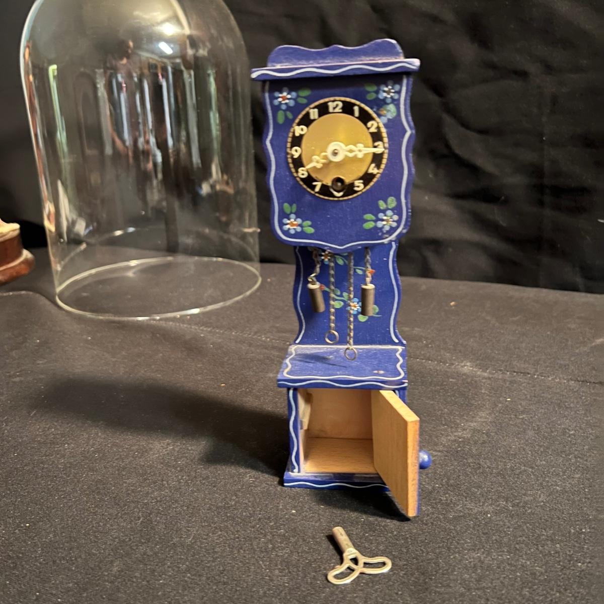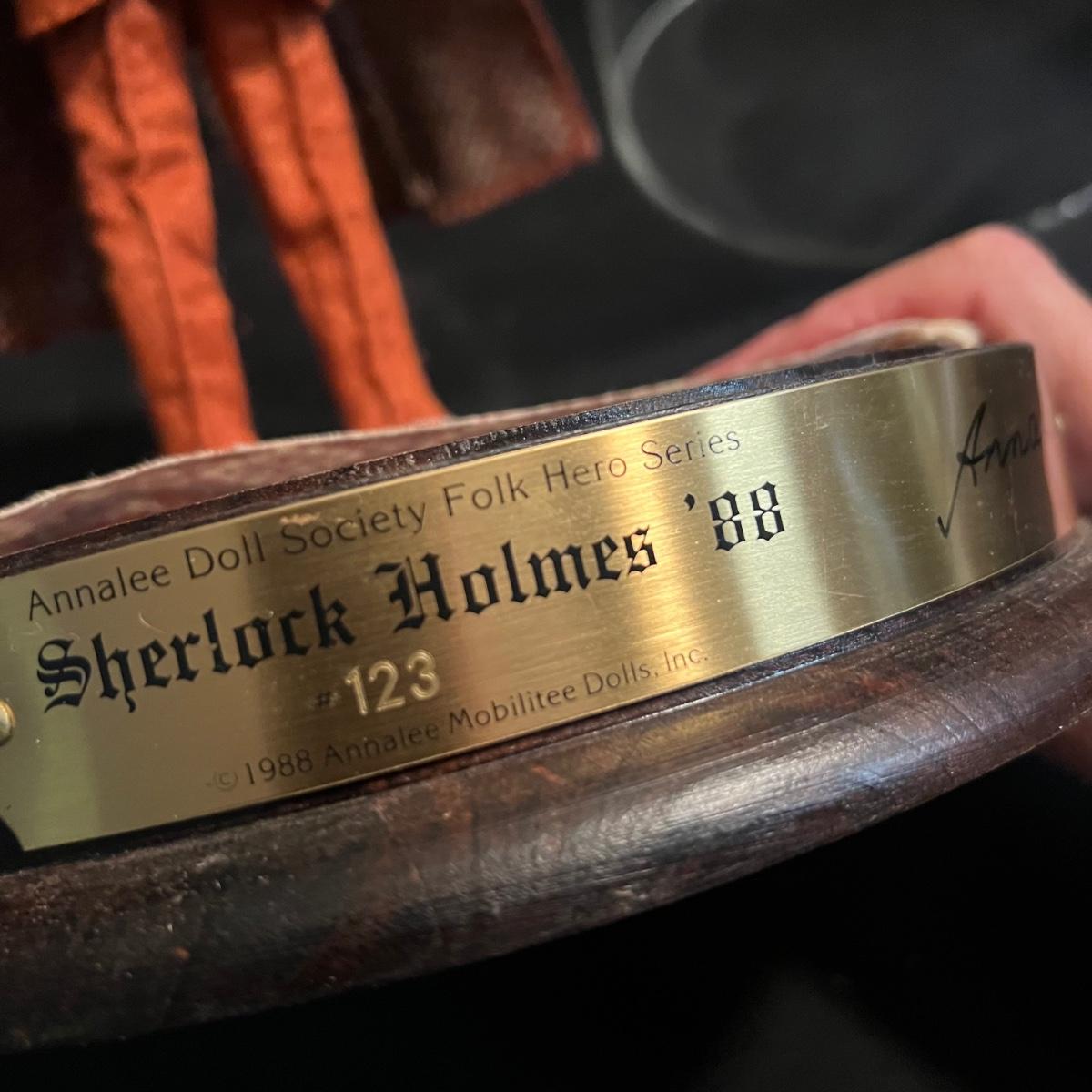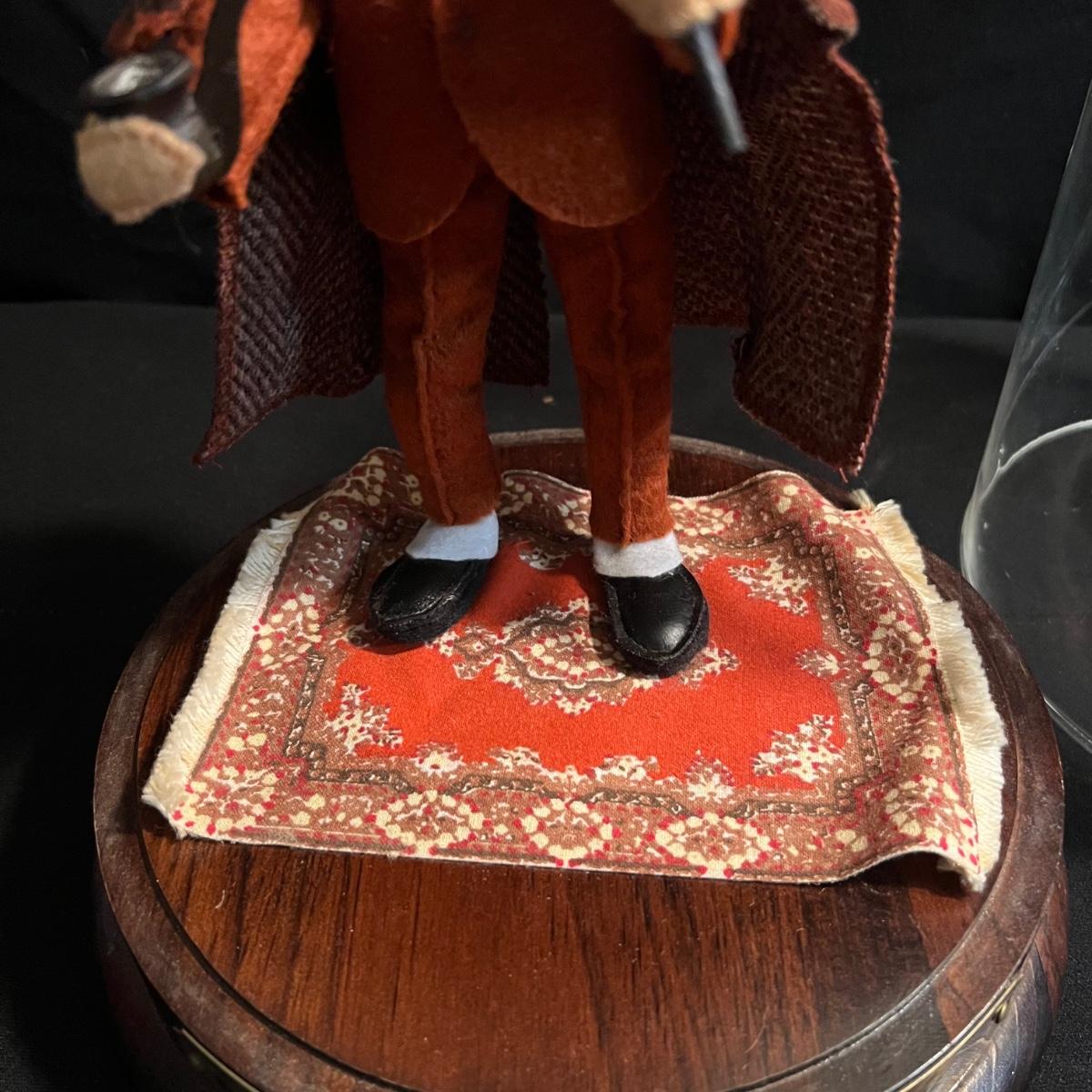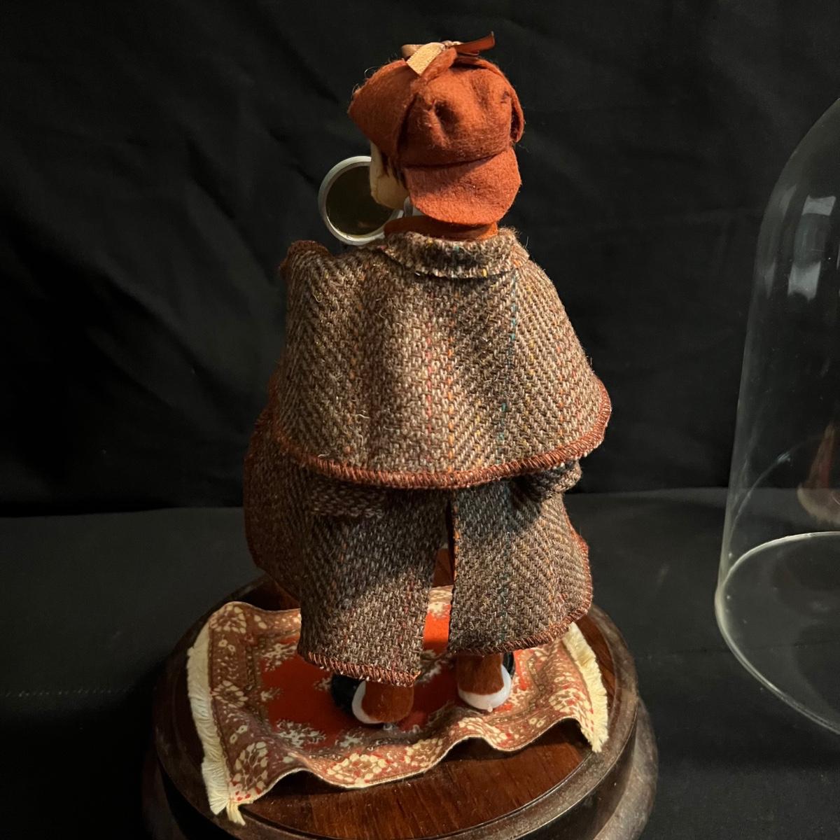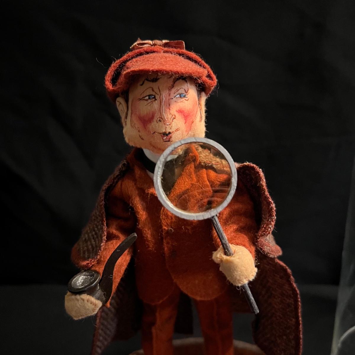 Of these five items, two are Annalee. The fisherman and lady have no marking and the blue clock with key (not tested) is marked Made in Germany. Largest item is Sherlock Holmes who is mounted on a wood base with glass dome, he measures 9”D x 14”H.