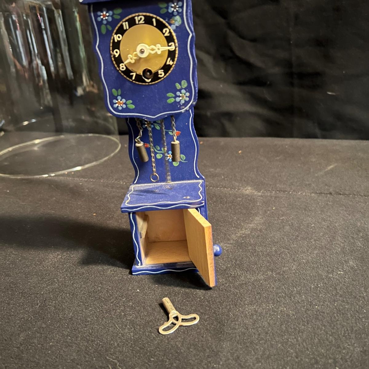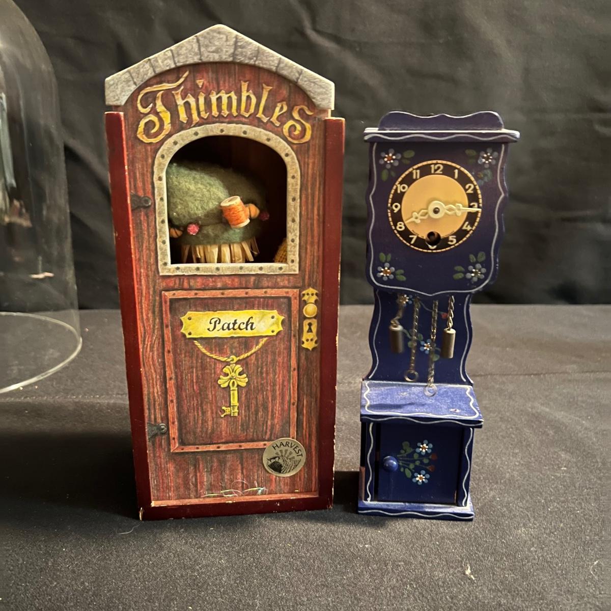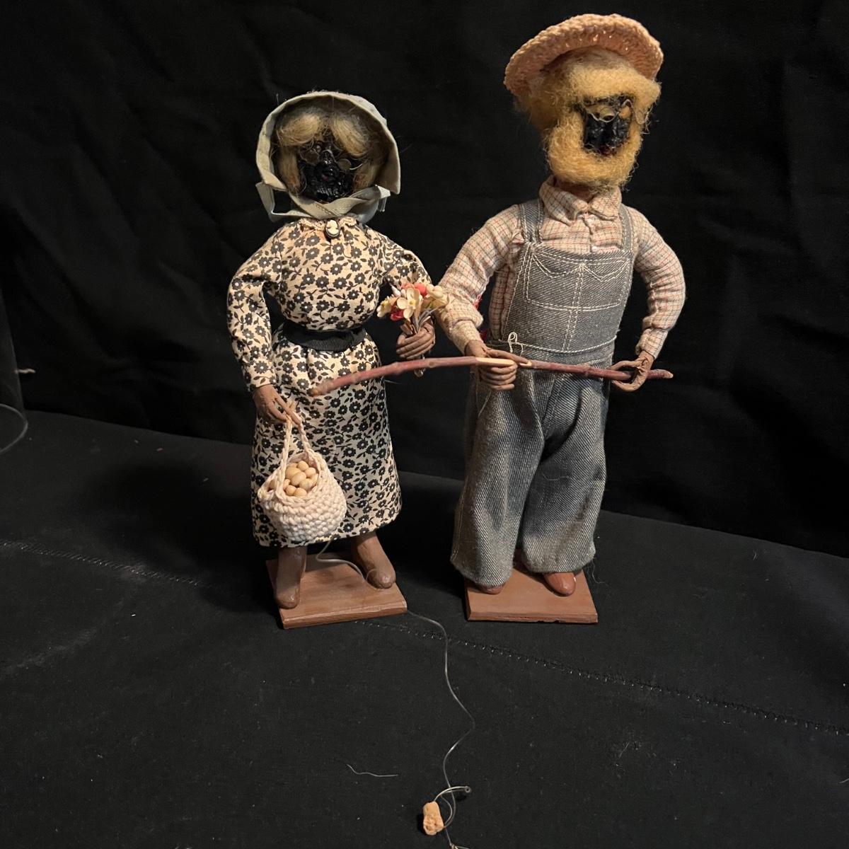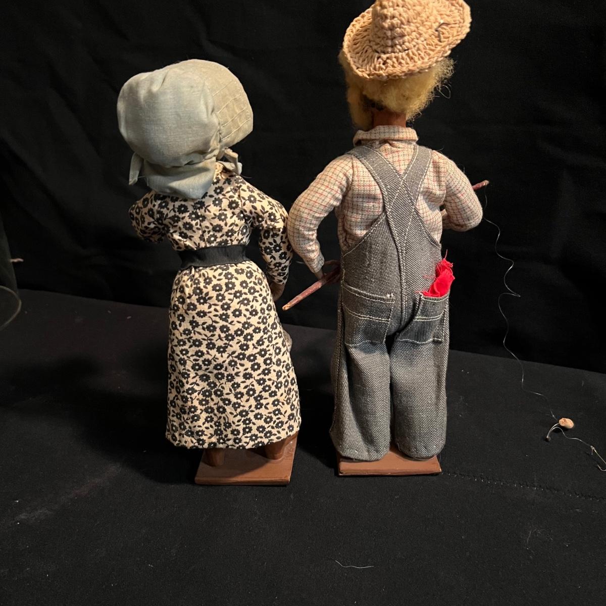 Of these five items, two are Annalee. The fisherman and lady have no marking and the blue clock with key (not tested) is marked Made in Germany. Largest item is Sherlock Holmes who is mounted on a wood base with glass dome, he measures 9”D x 14”H.