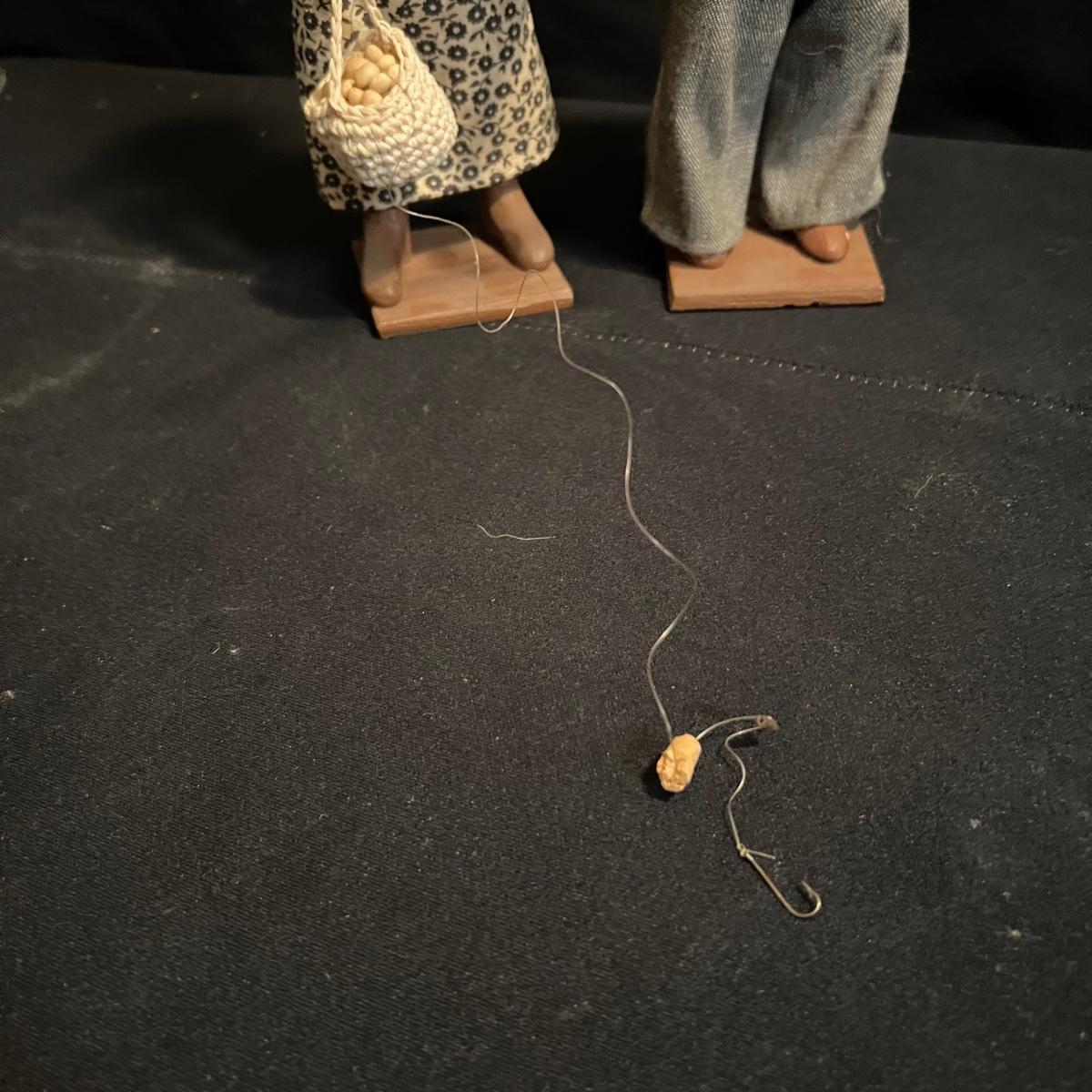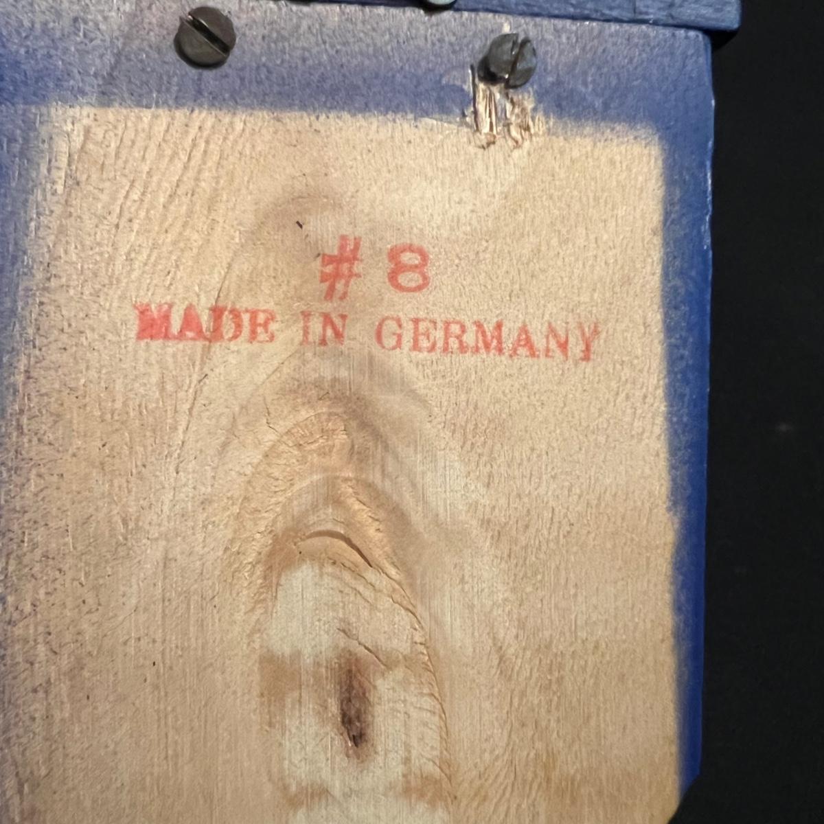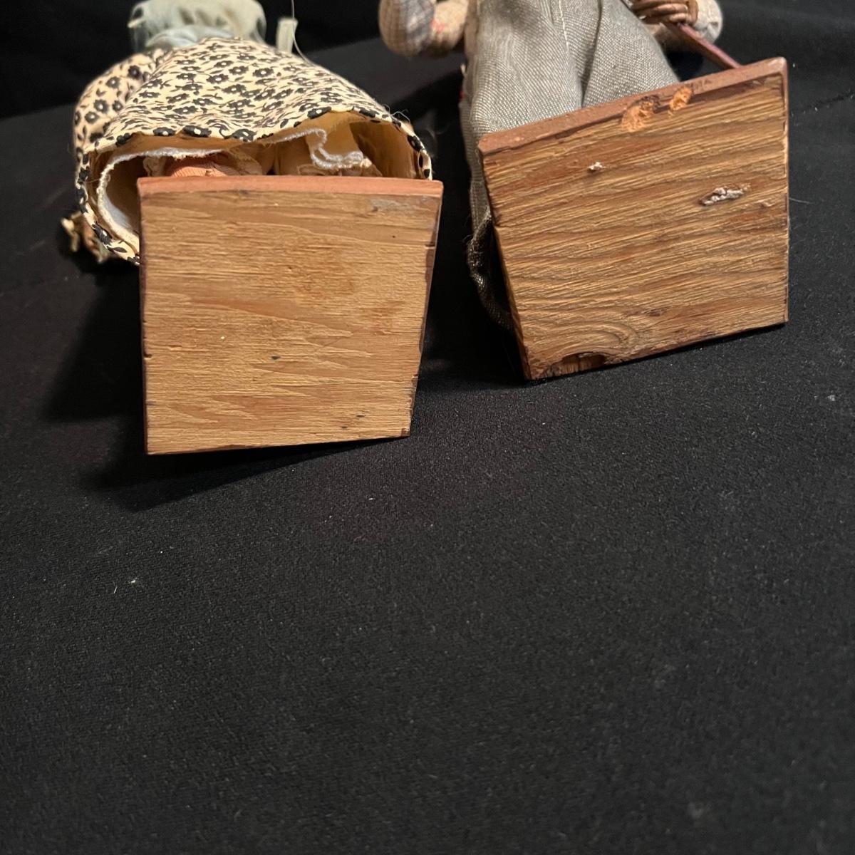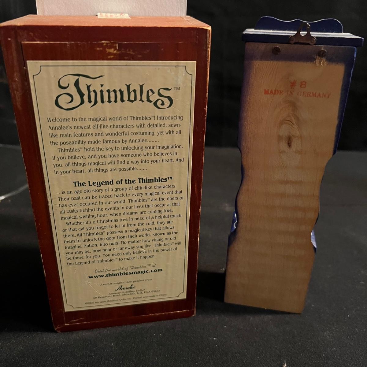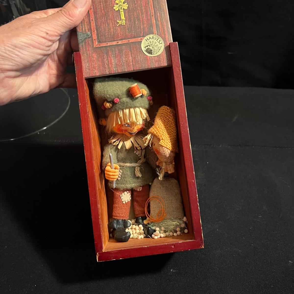 Of these five items, two are Annalee. The fisherman and lady have no marking and the blue clock with key (not tested) is marked Made in Germany. Largest item is Sherlock Holmes who is mounted on a wood base with glass dome, he measures 9”D x 14”H.