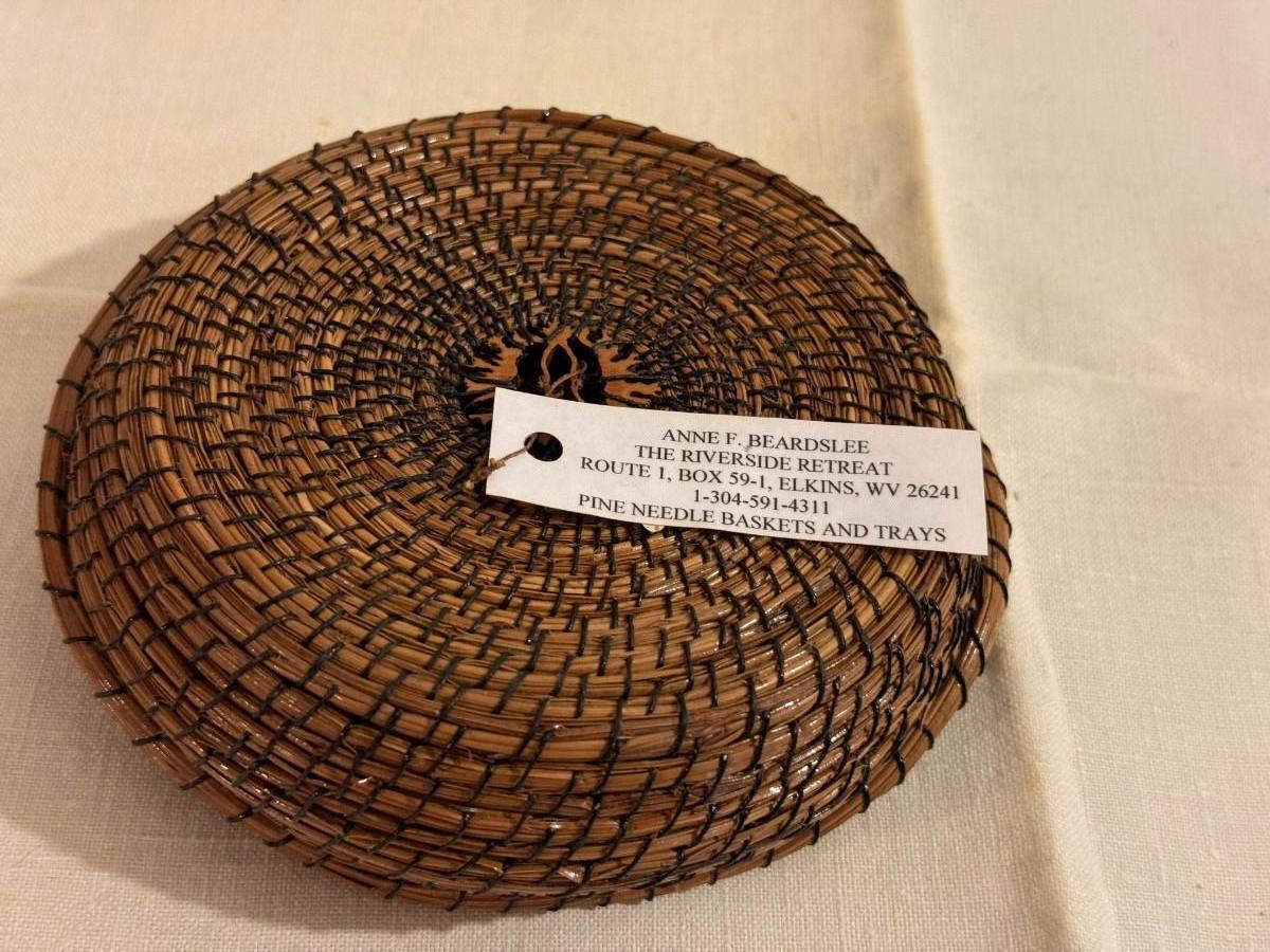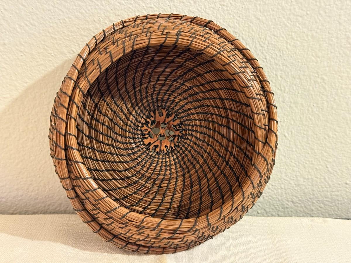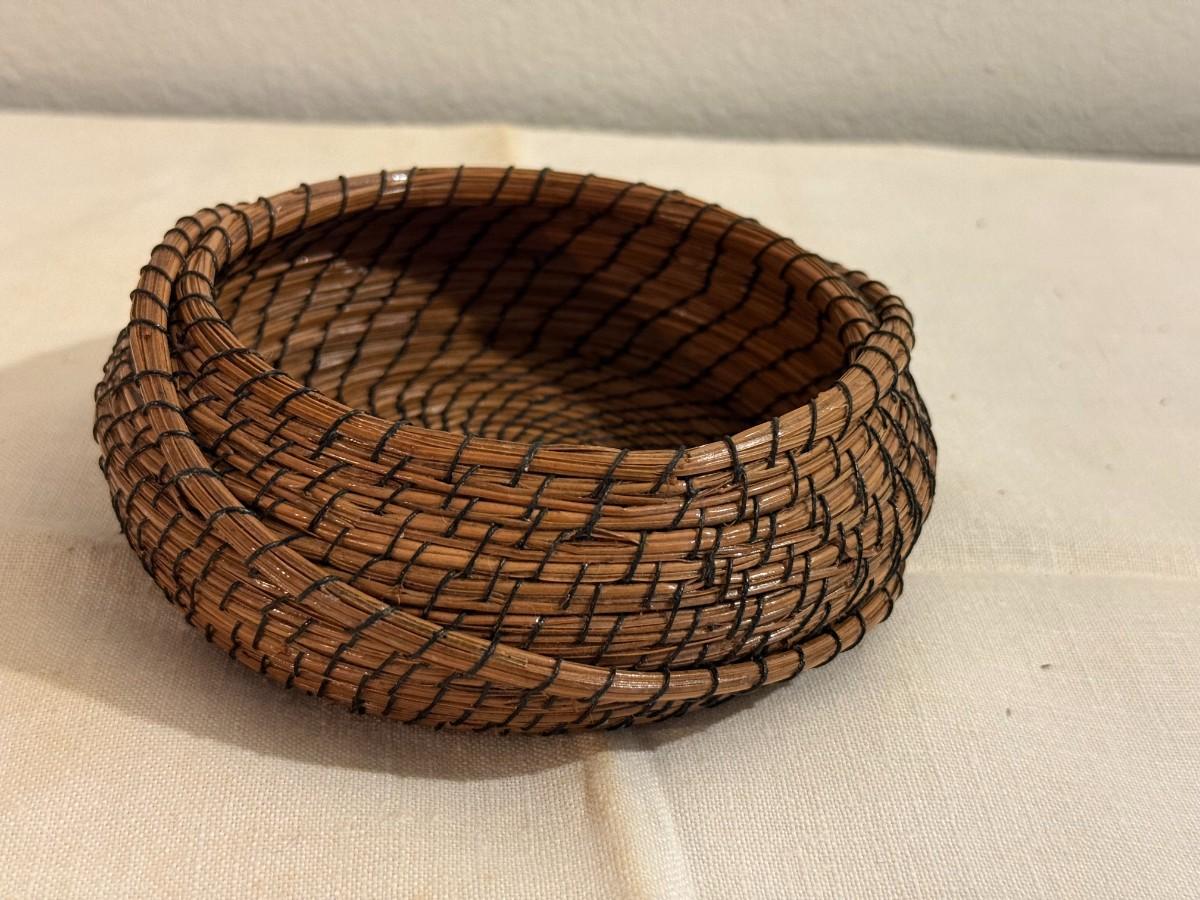 Pre-owned. Ann F. Beardslee Pine Needle Basket with a black walnut center. Diameter 4.3/4in | H 2in.