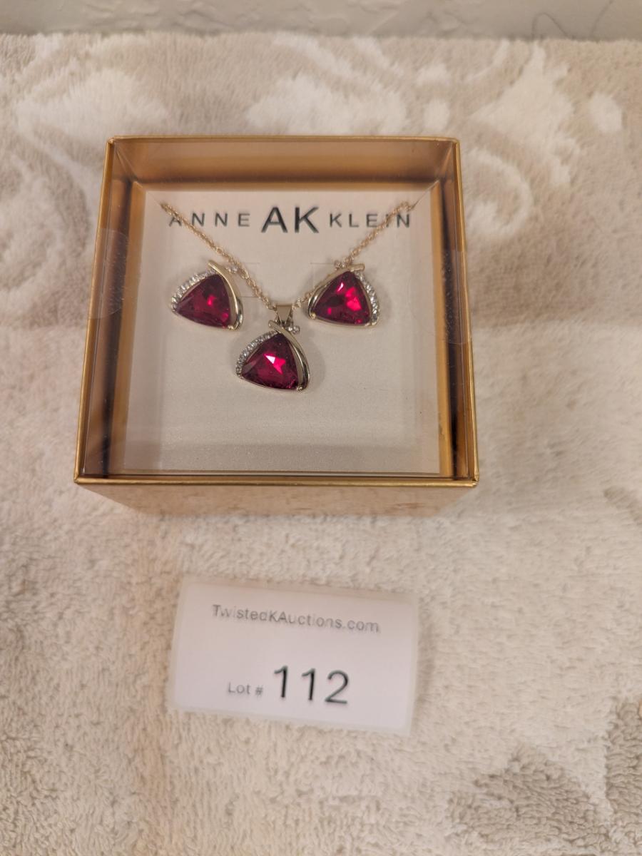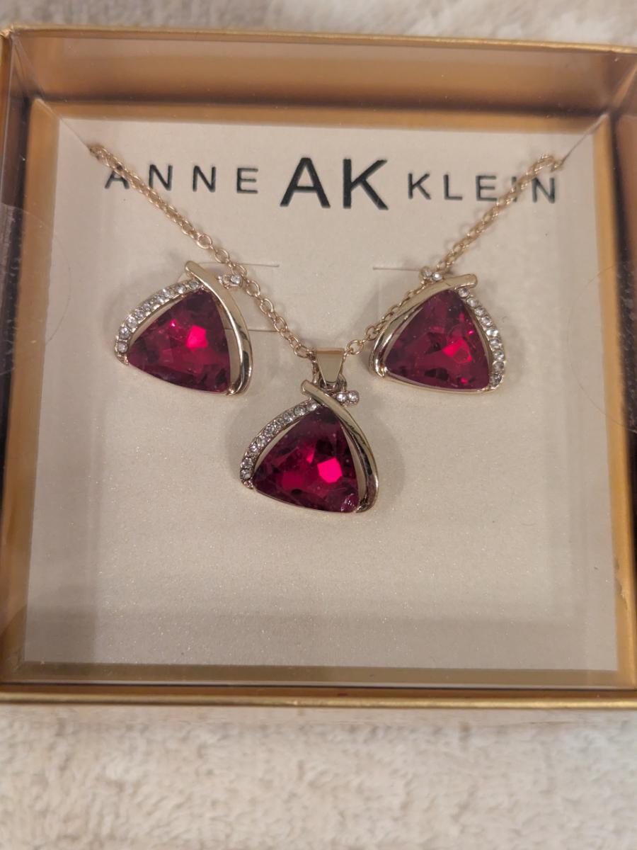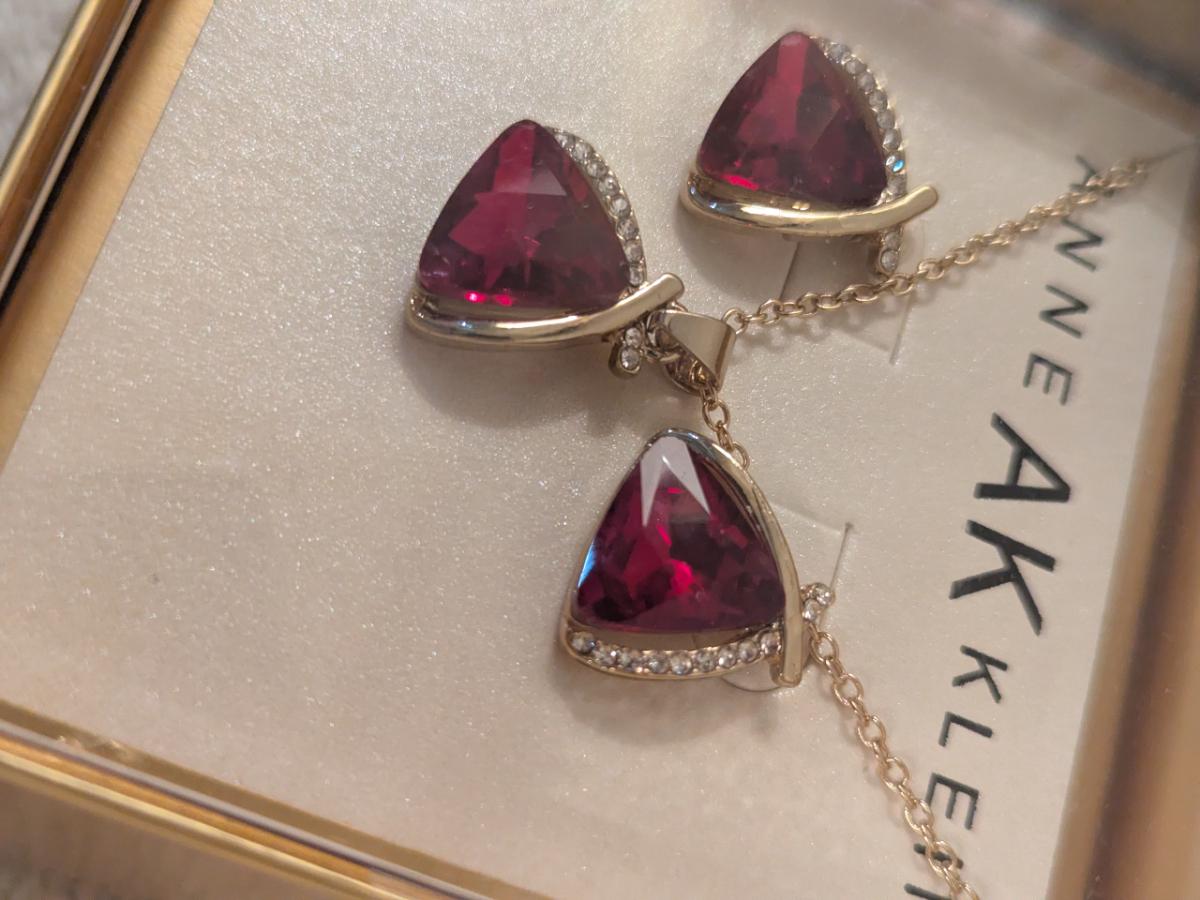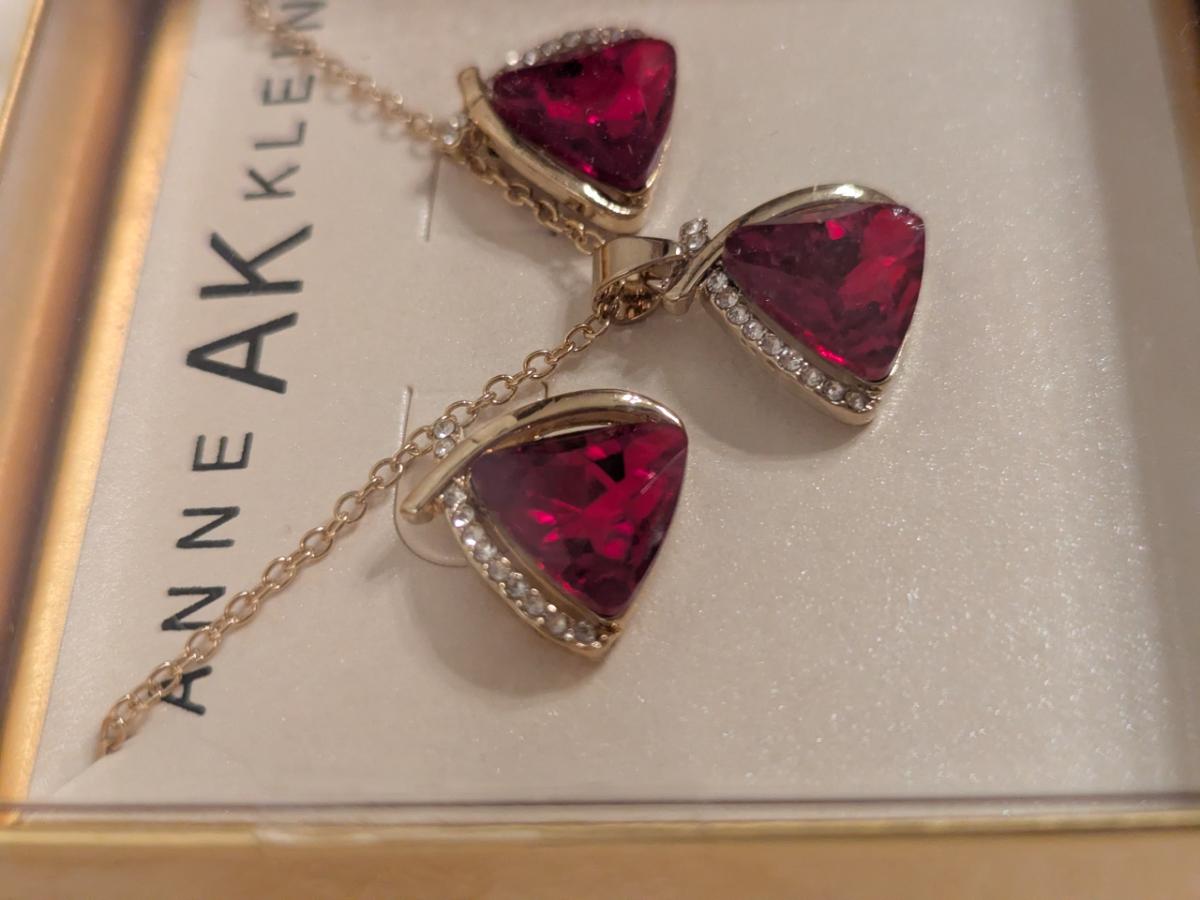Anne Klein gold-tone necklace and earring set featuring red, trillion-cut stones and crystal accents
