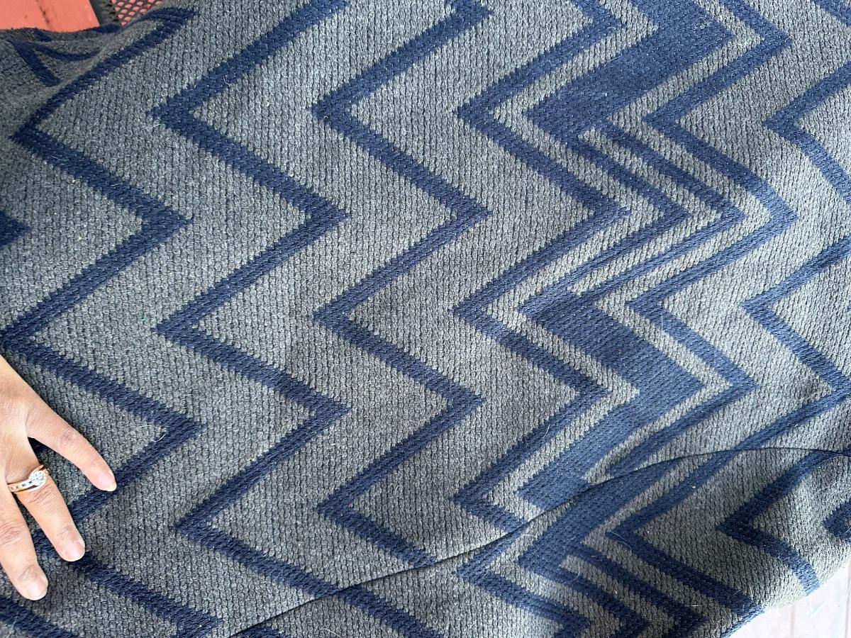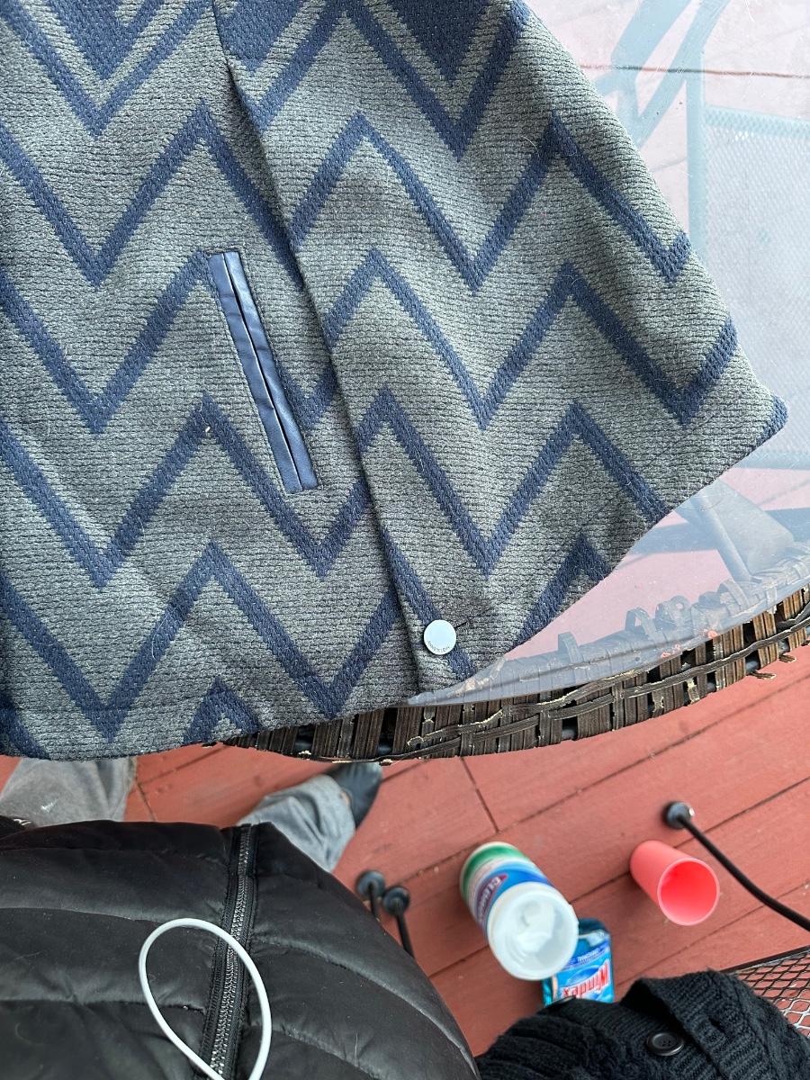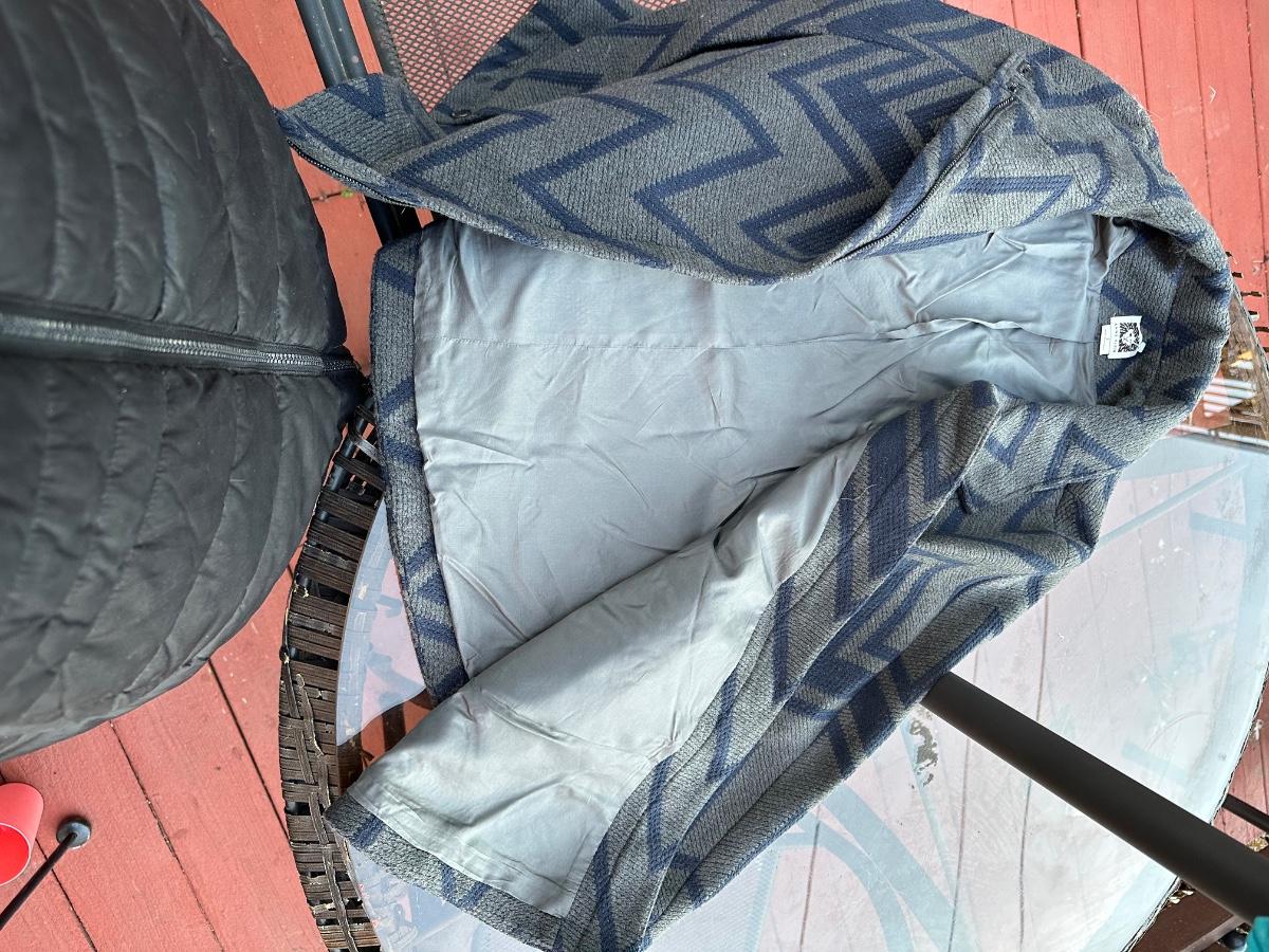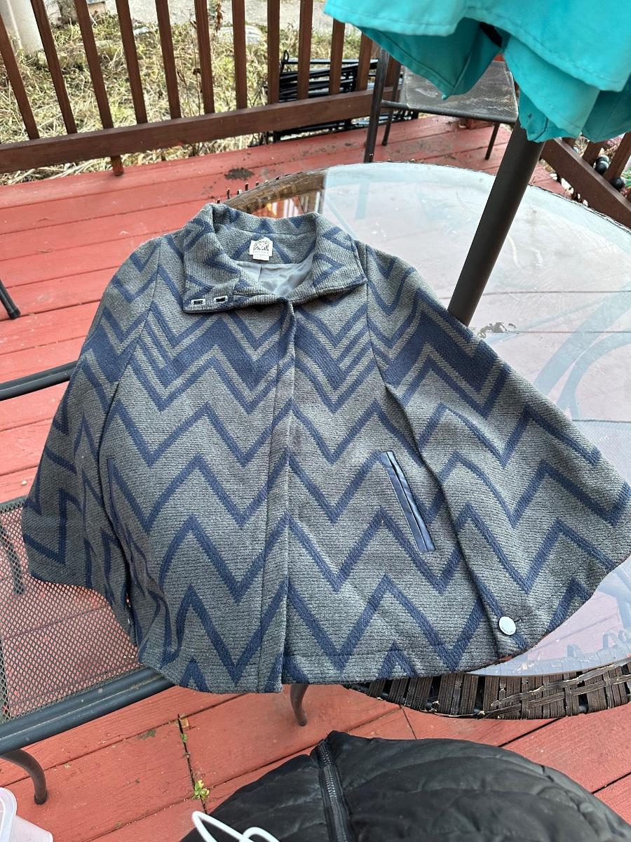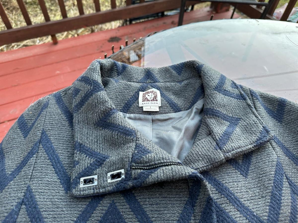 Anne Klein women's wool blend collared jacket with a blue and grey geometric pattern