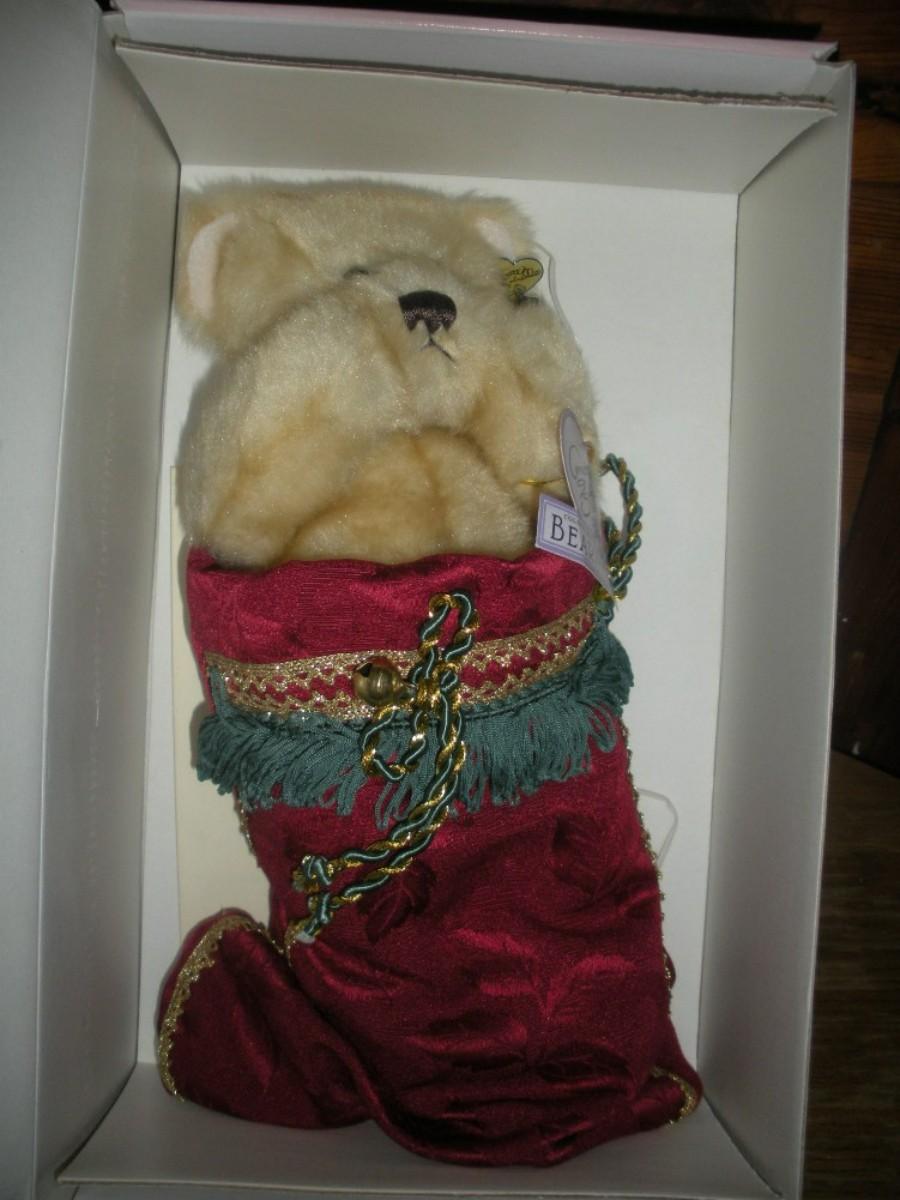 This adorable little plush bear comes tucked inside his Christmas Stocking and is peaking out to see Santa. Can be hung on your mantel at Christmas time. Limited Edition. He is #730 of 5000 made. Comes in his original box with his Certificate of Authenticity. Never played with or displayed.
