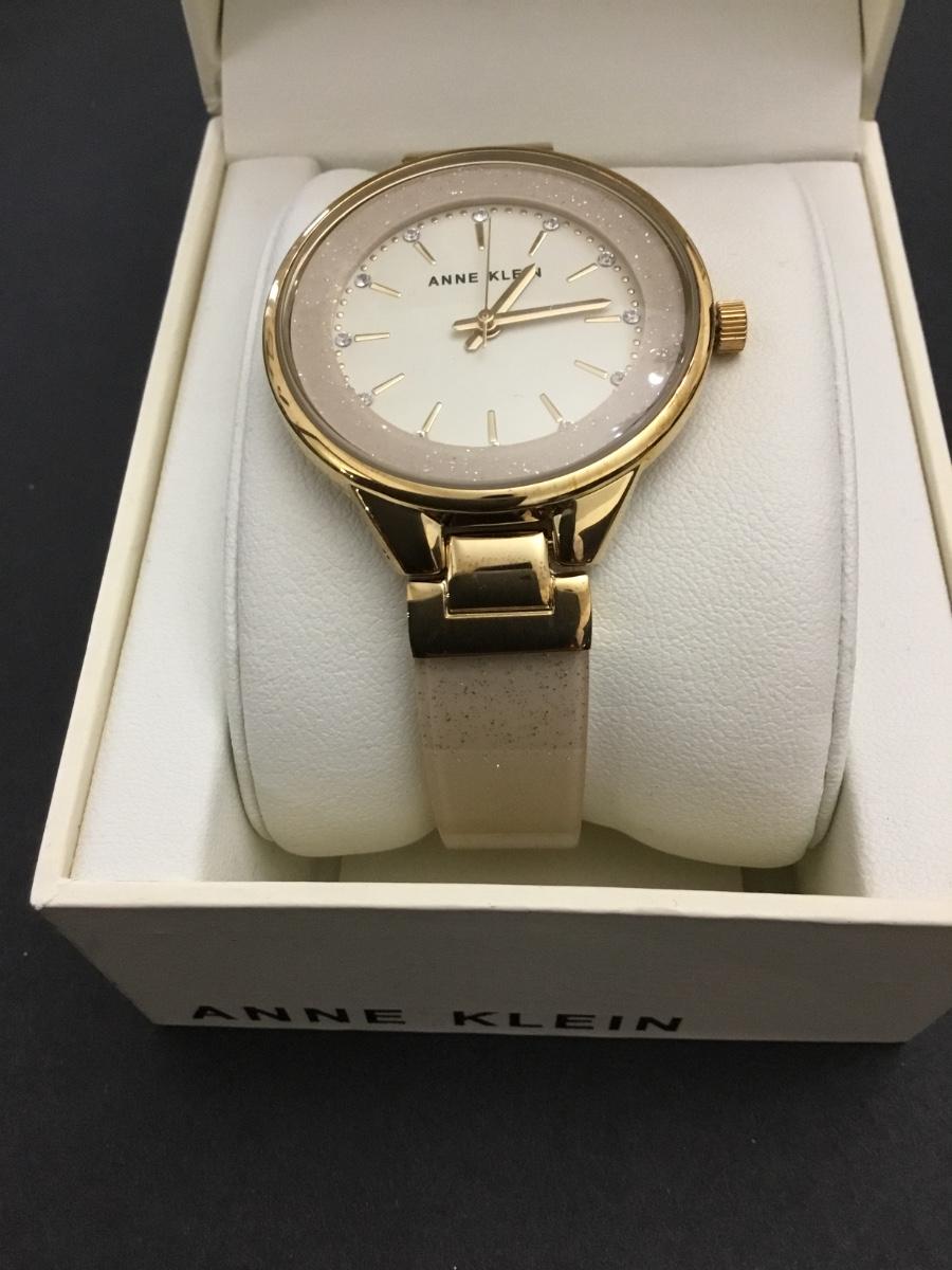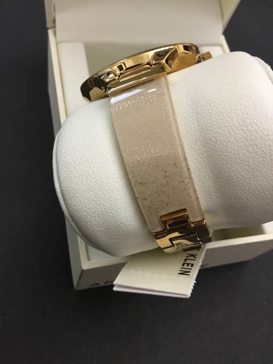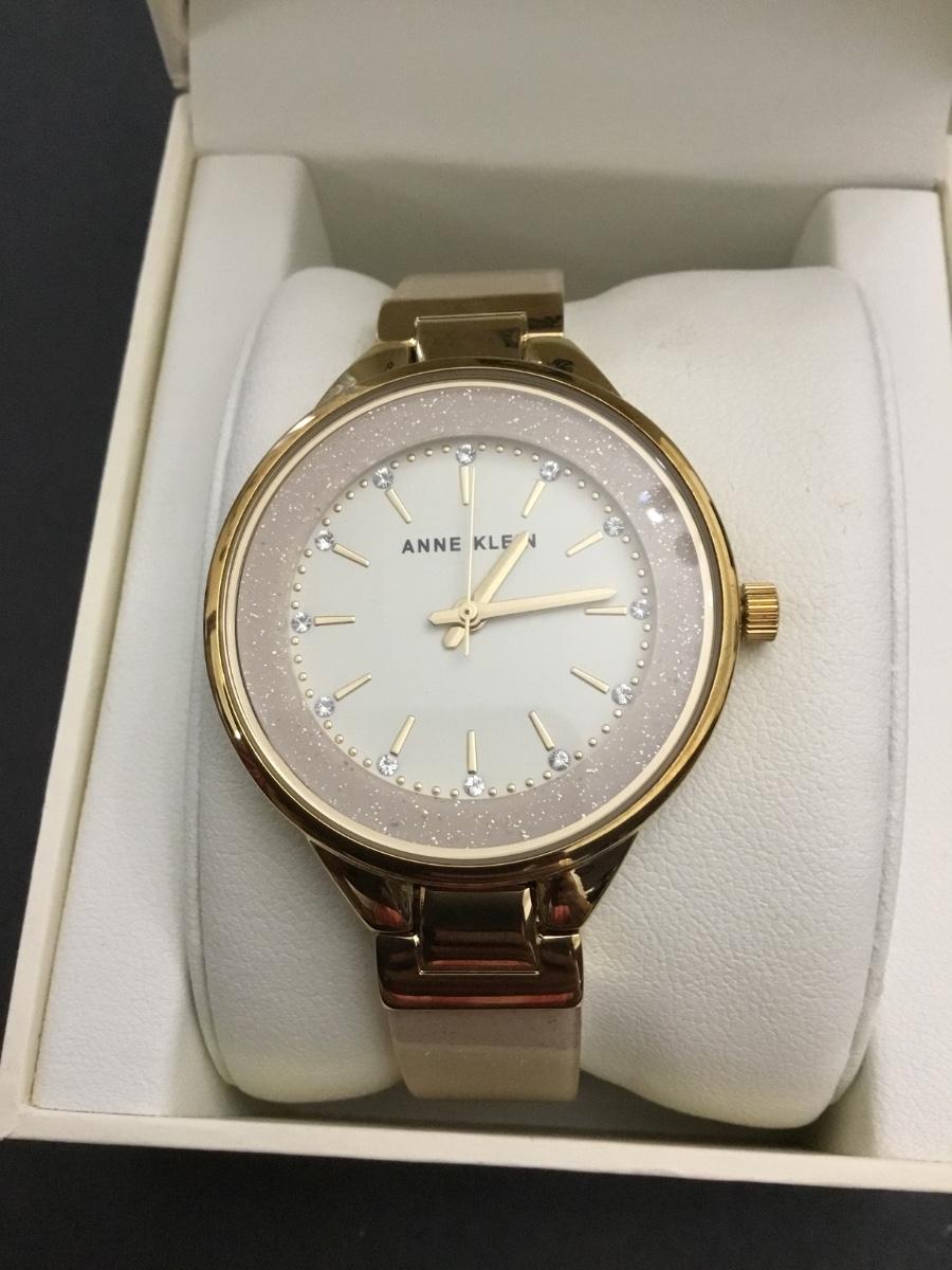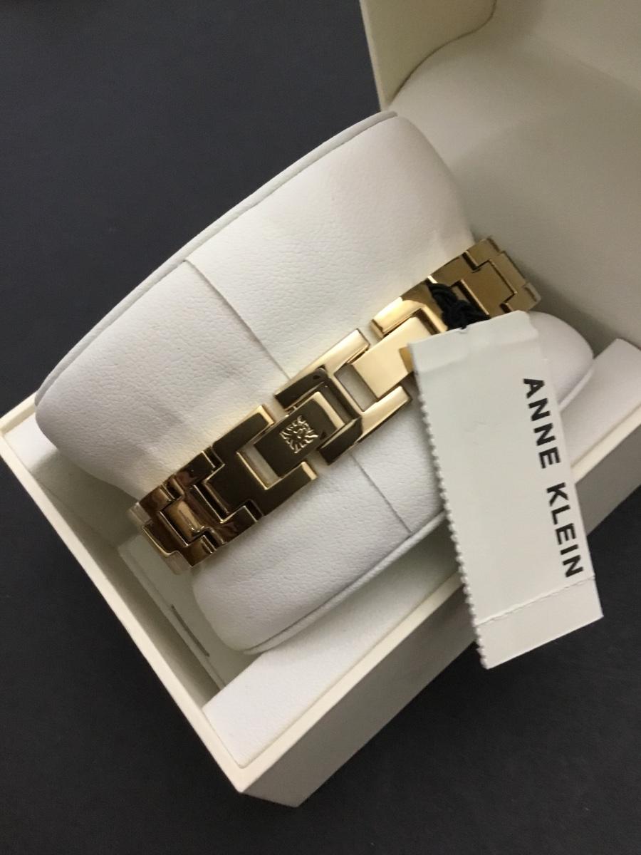 Annie Klein, women’s AK/1408CRCR premium Crystal accented bangle watch with a gold tone case and white genuine mother of pearl dial