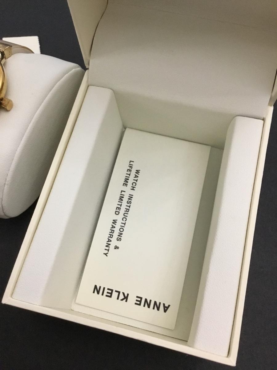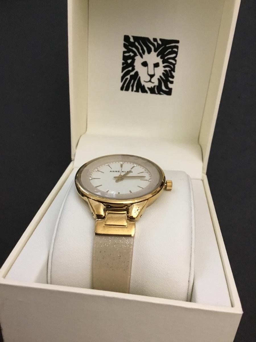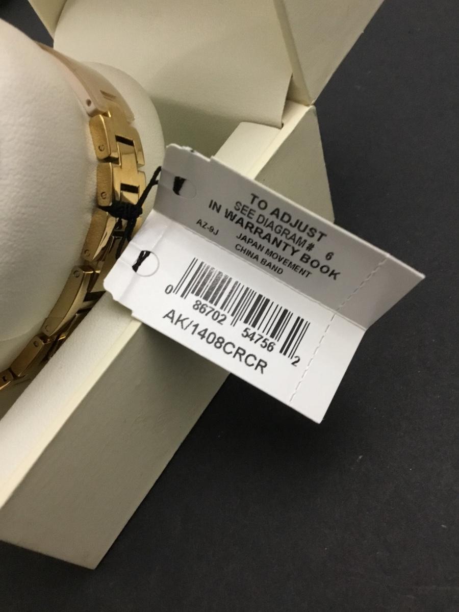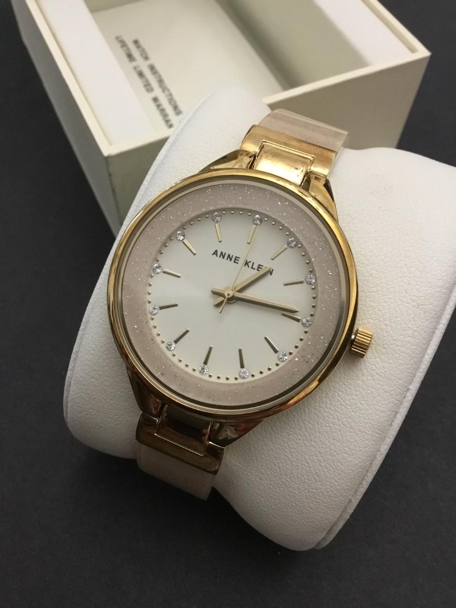 Annie Klein, women’s AK/1408CRCR premium Crystal accented bangle watch with a gold tone case and white genuine mother of pearl dial