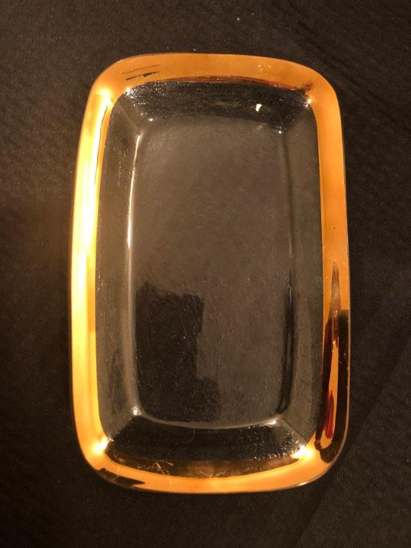 Annieglass rectangular platter. Antique Roman gold border. 11x7