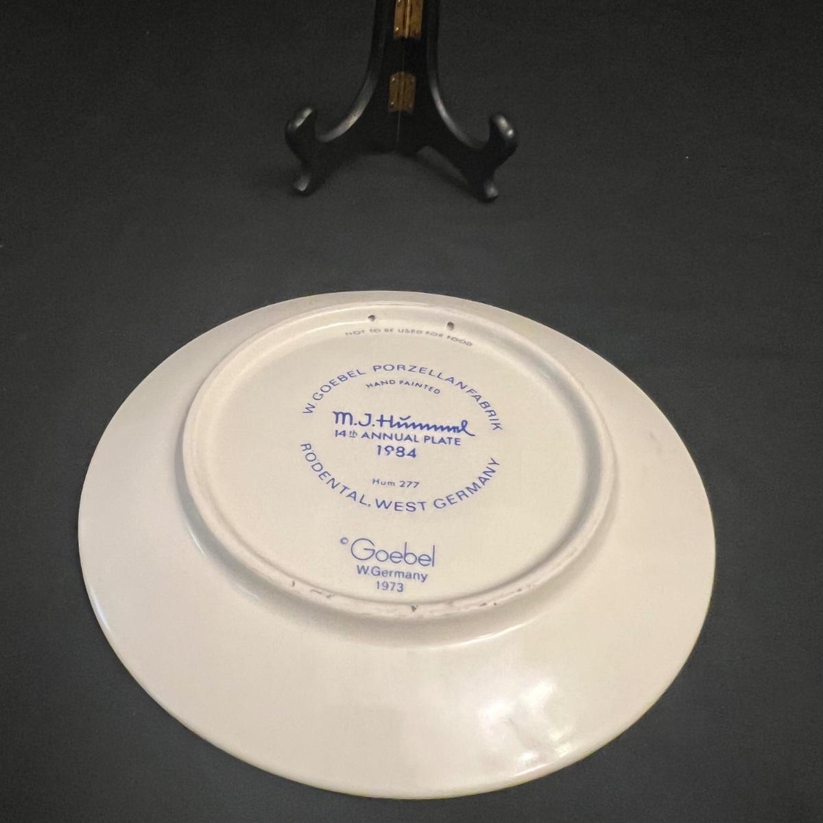 13 Hummel annual collectors plates that makes a complete set through the years 1971-1982 and also includes 1984. Faux wood stands included.